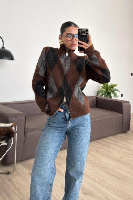 Çift Fermuarlı Baklava Desenli Hırka Kahverengi