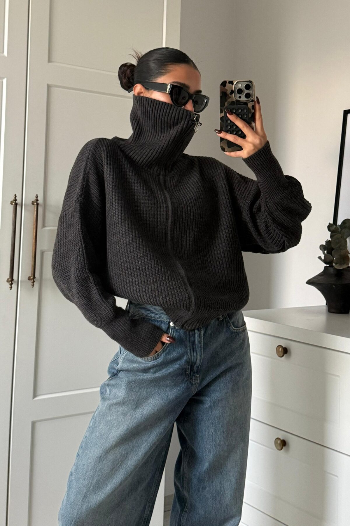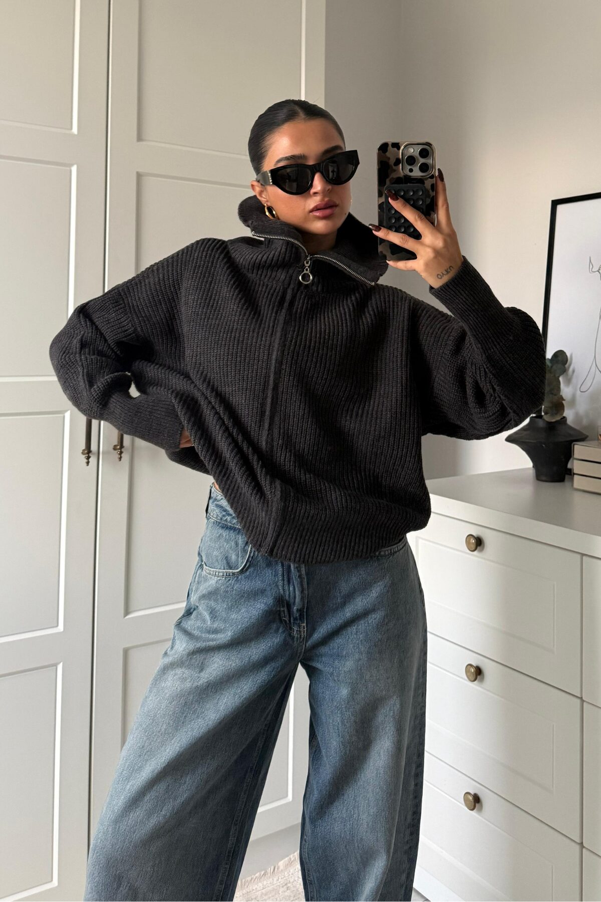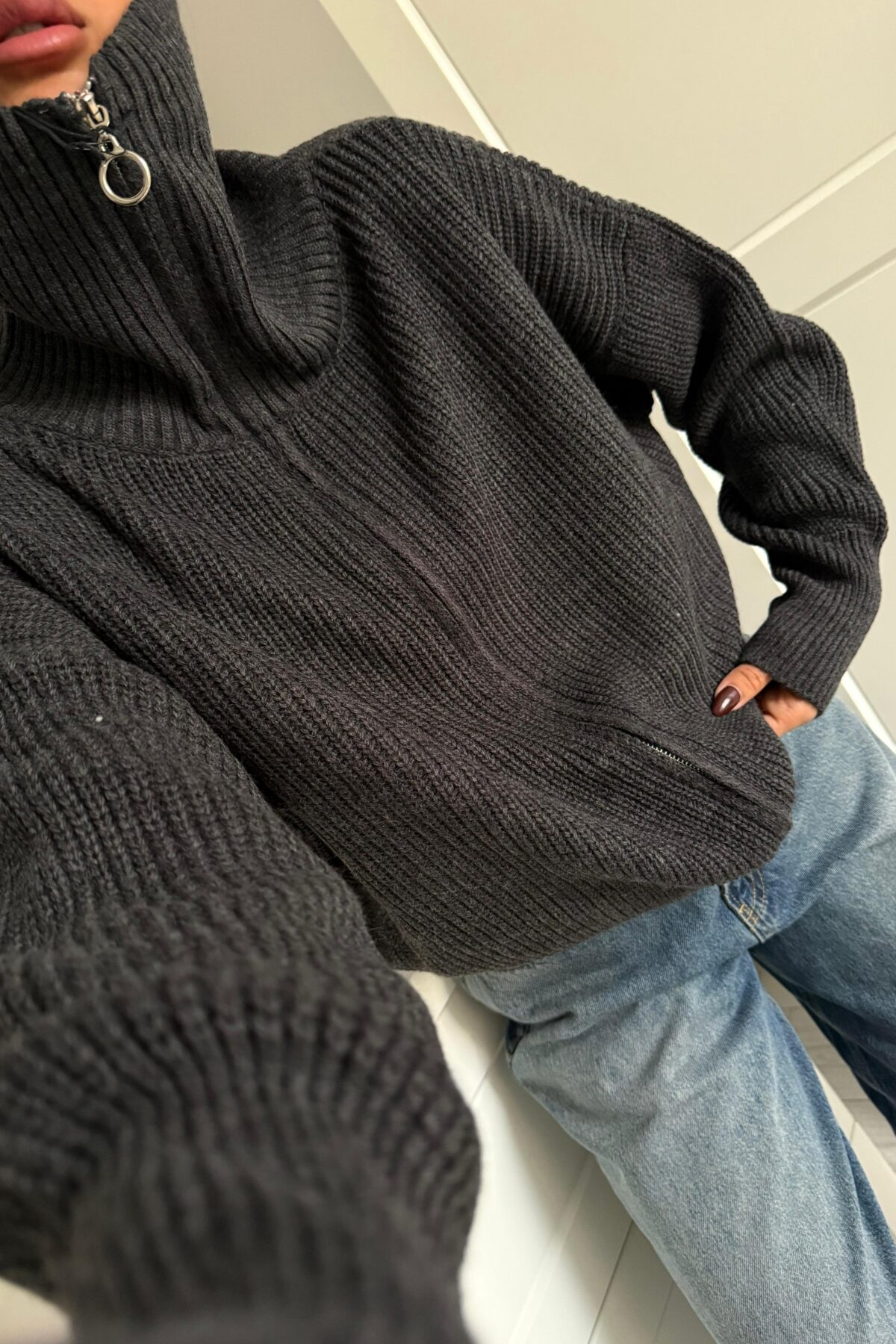 Fermuarlı Dik Yaka Örgü Hırka Antrasit