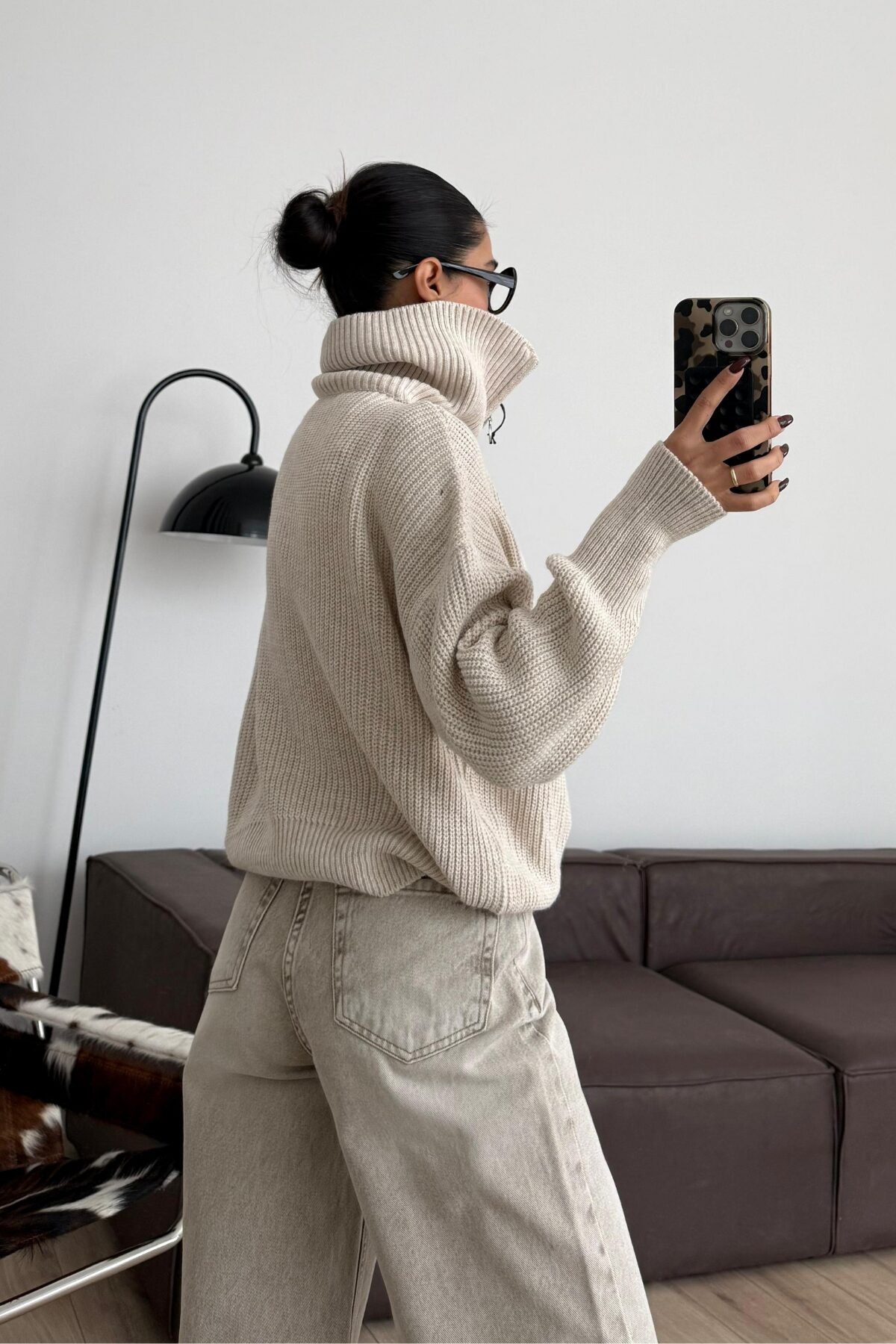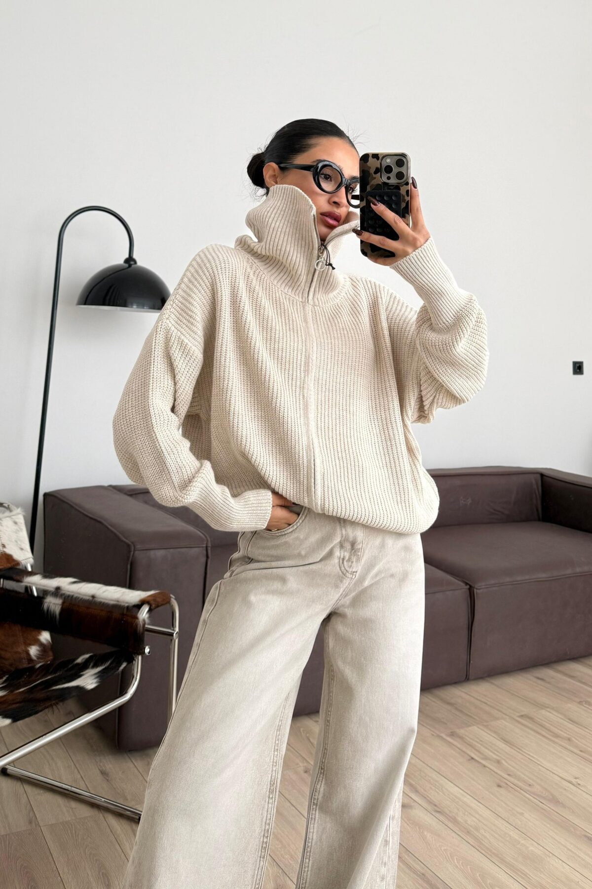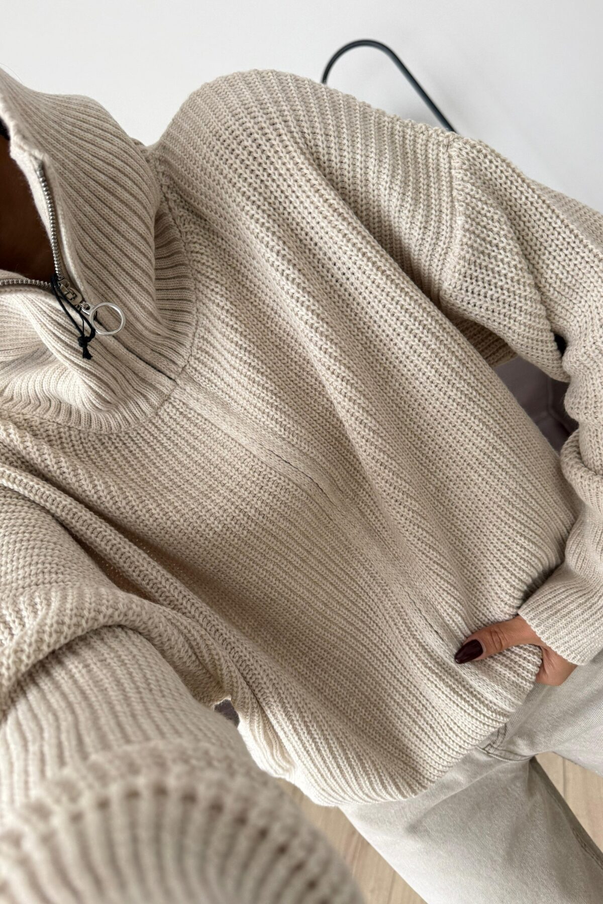 Fermuarlı Dik Yaka Örgü Hırka Bej