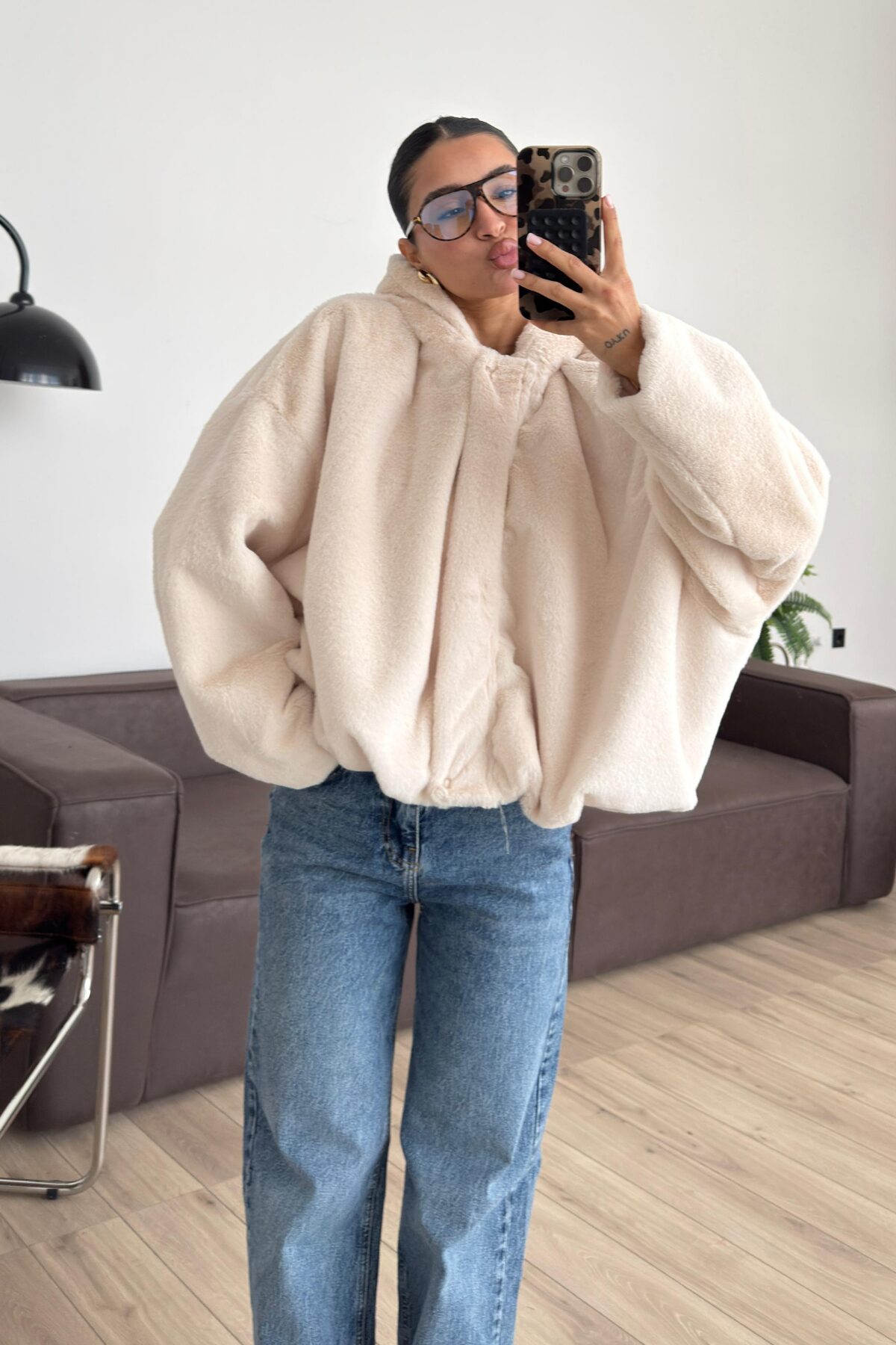 Fermuarlı Kapşonlu Peluş Hırka Ekru