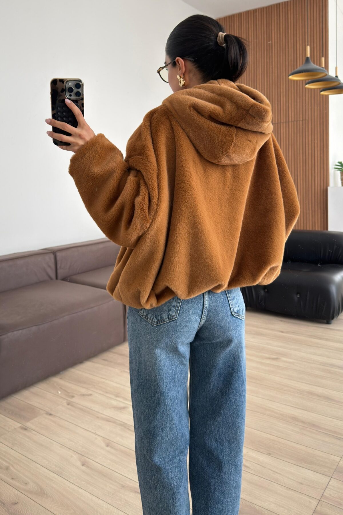 Fermuarlı Kapşonlu Peluş Hırka Taba