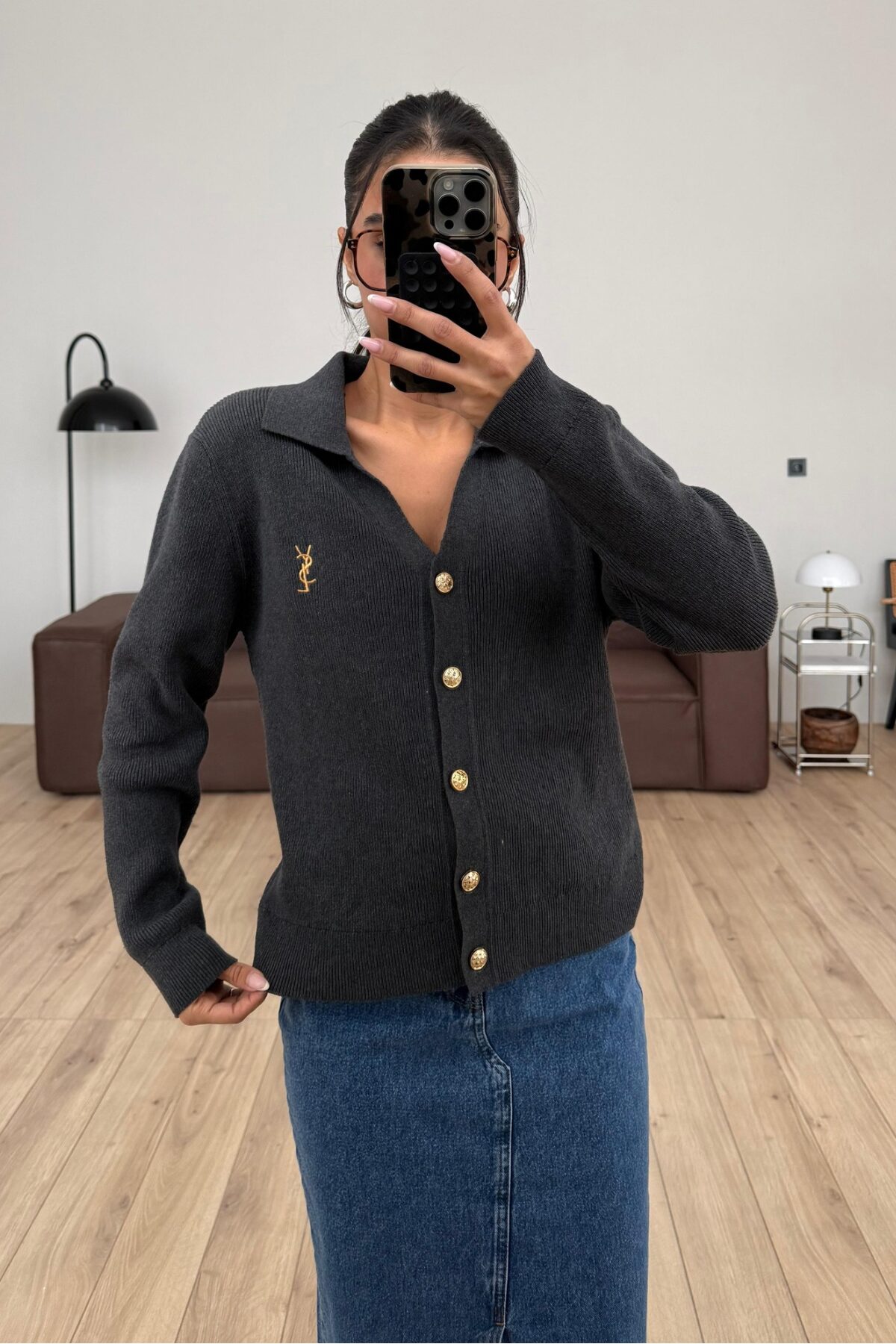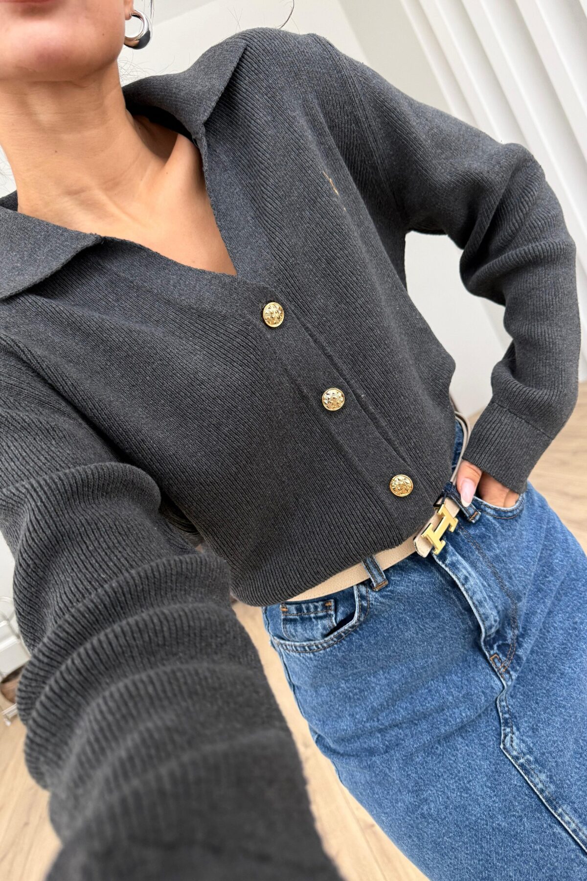 Gold Düğmeli Polo Yaka Hırka Antrasit