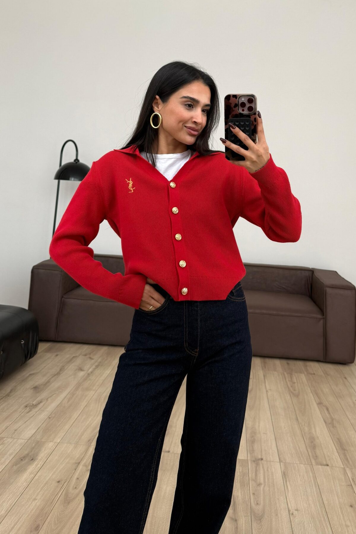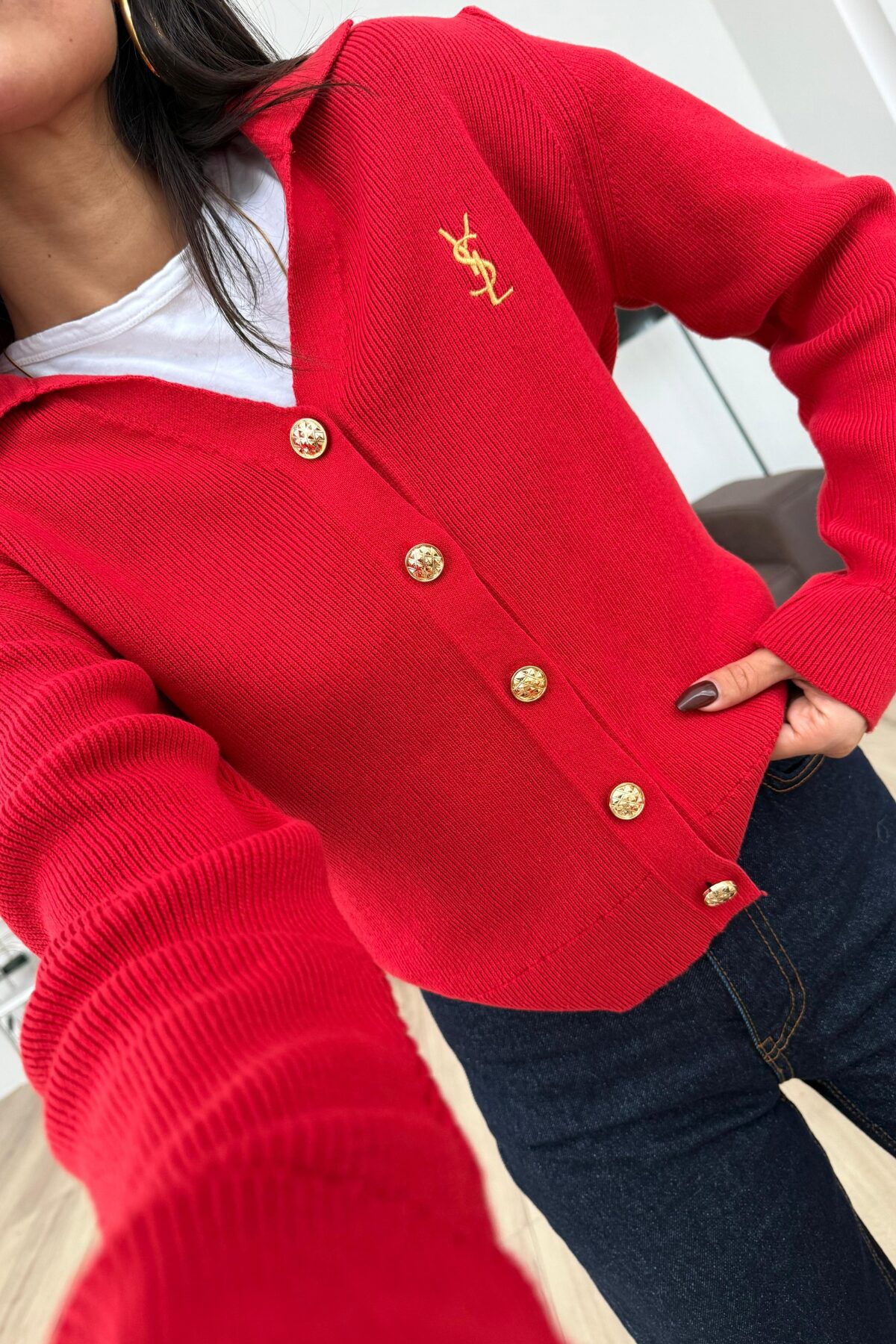 Gold Düğmeli Polo Yaka hırka Kırmızı