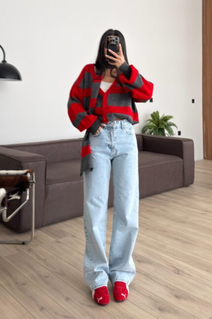 Dalgalı Taşlı Geniş Paça Mavi Jean