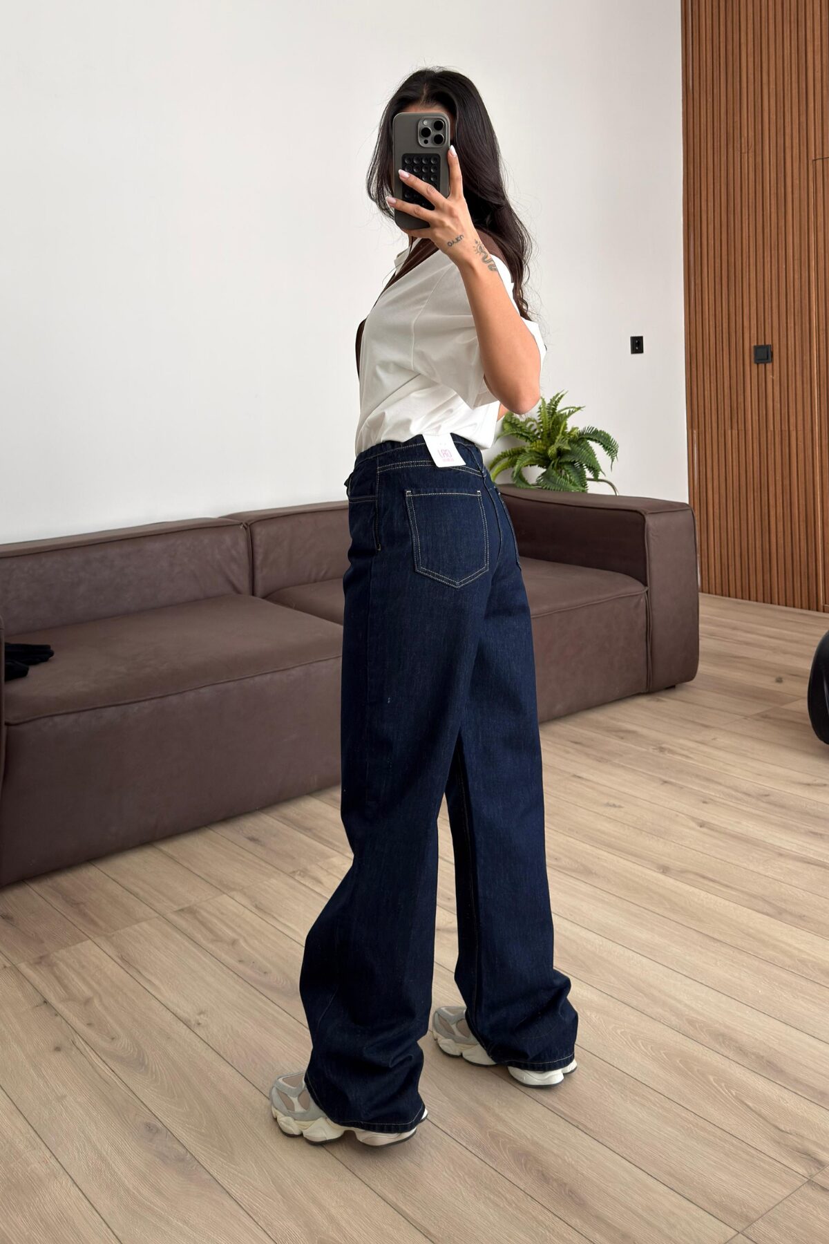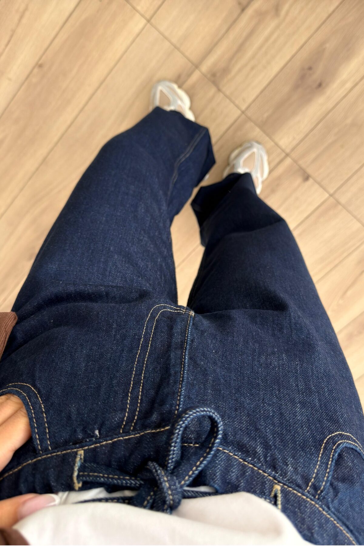 Beli Bağlamalı Wide Leg Lacivert Jean