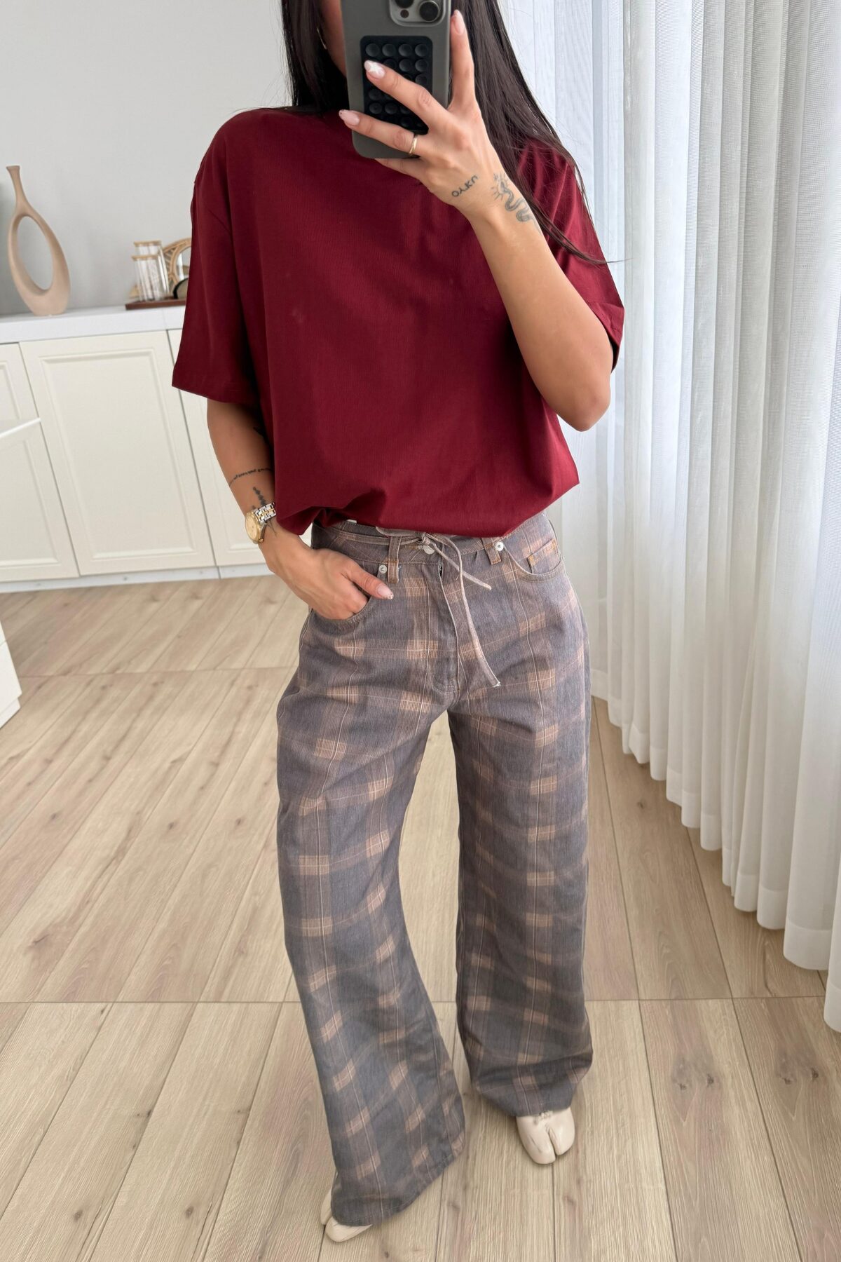 Beli İpli Geniş Paça Ekose Kahve Jean