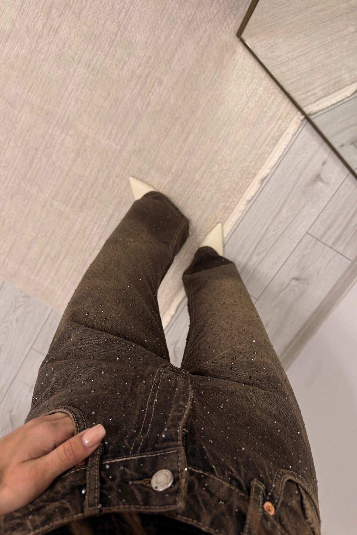 Işıltılı Wide Leg Kahve Eskitme Jean