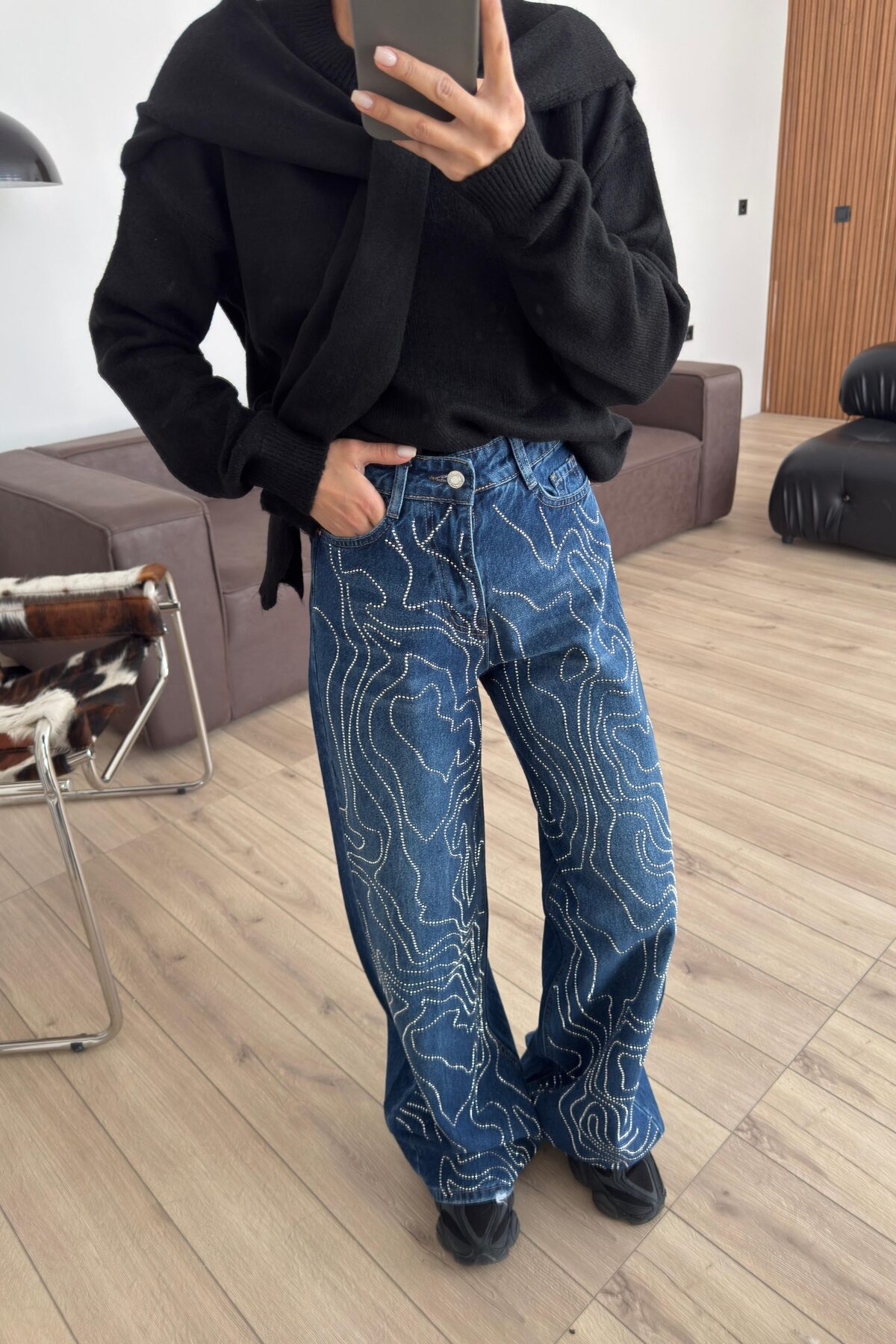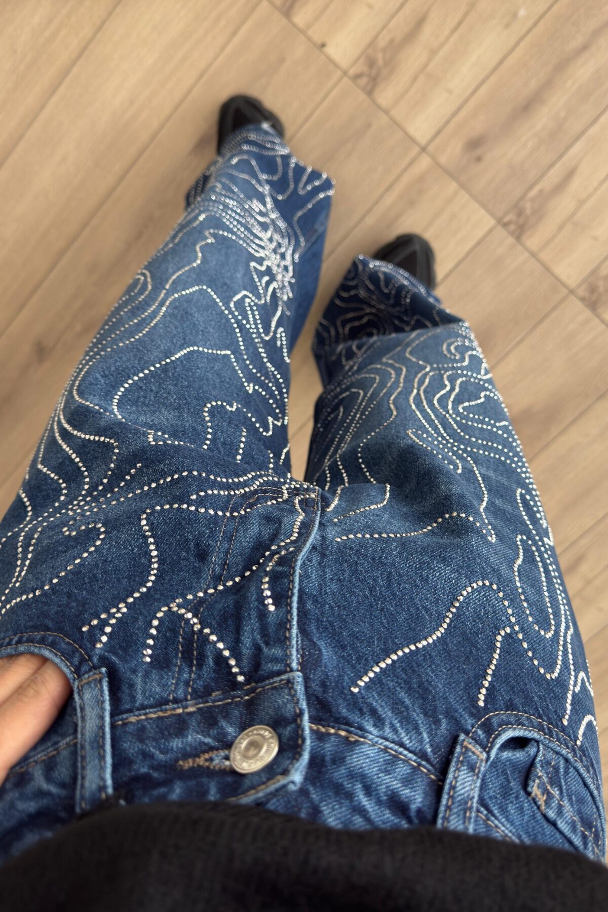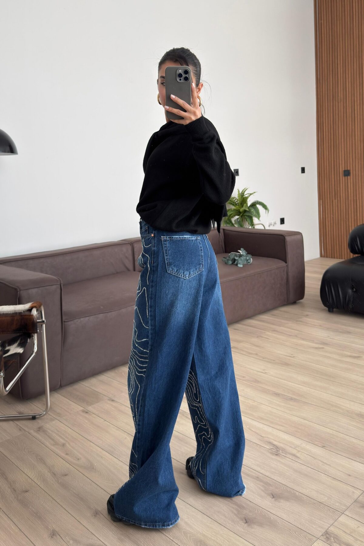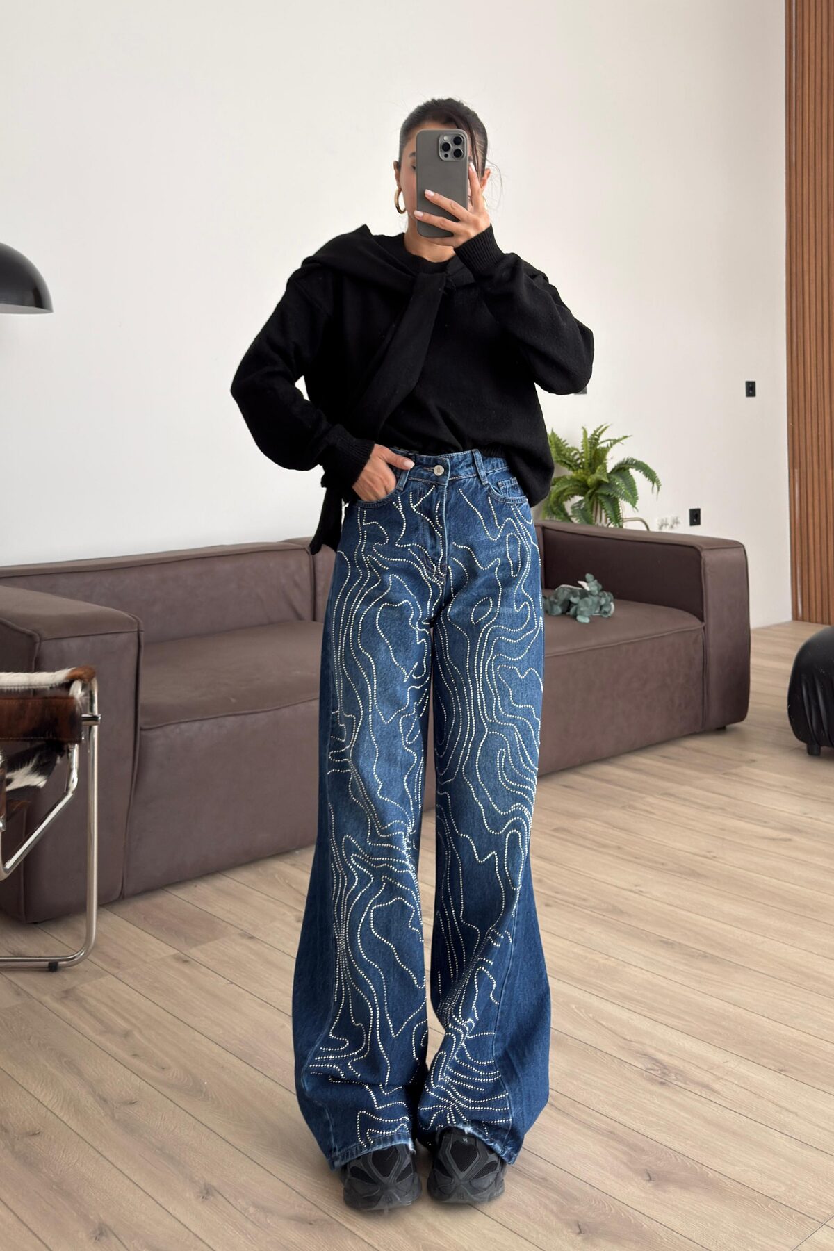 Önü Dalgalı Taşlı Koyu Mavi Jean
