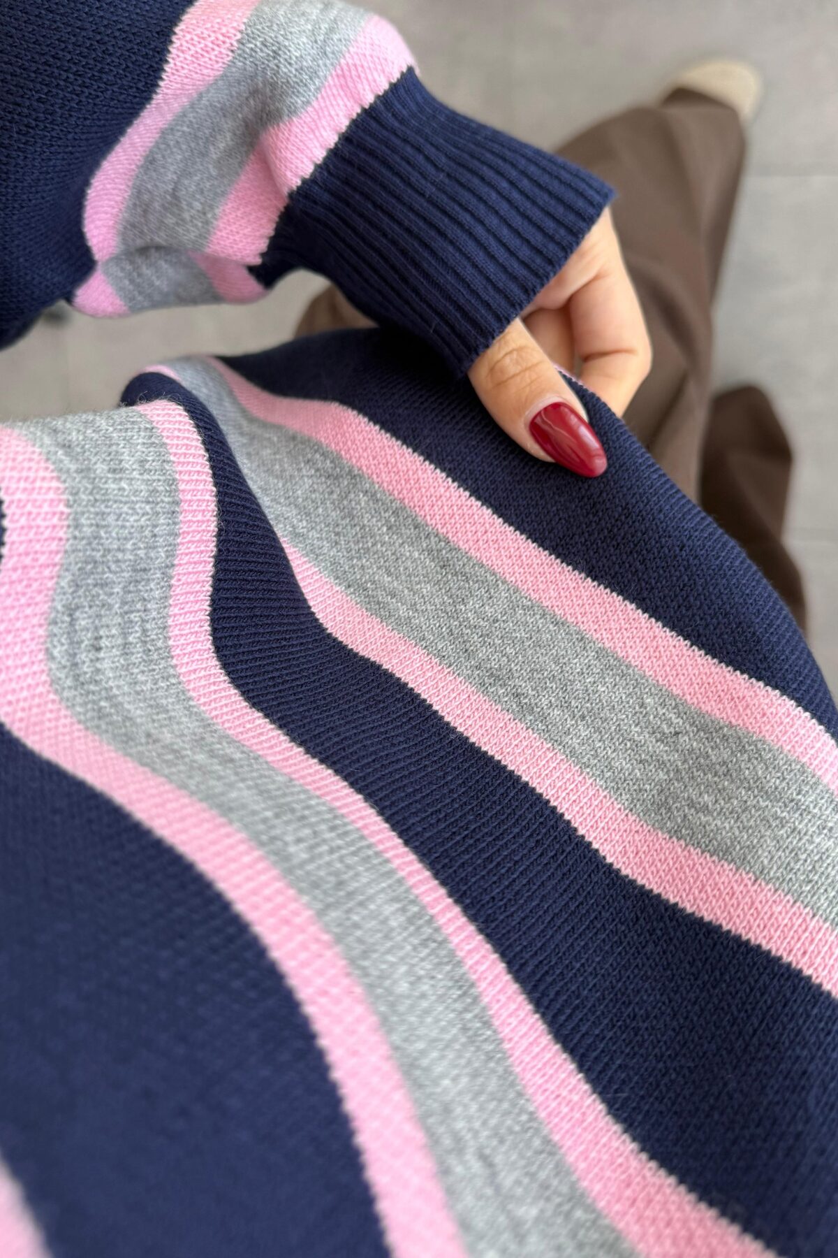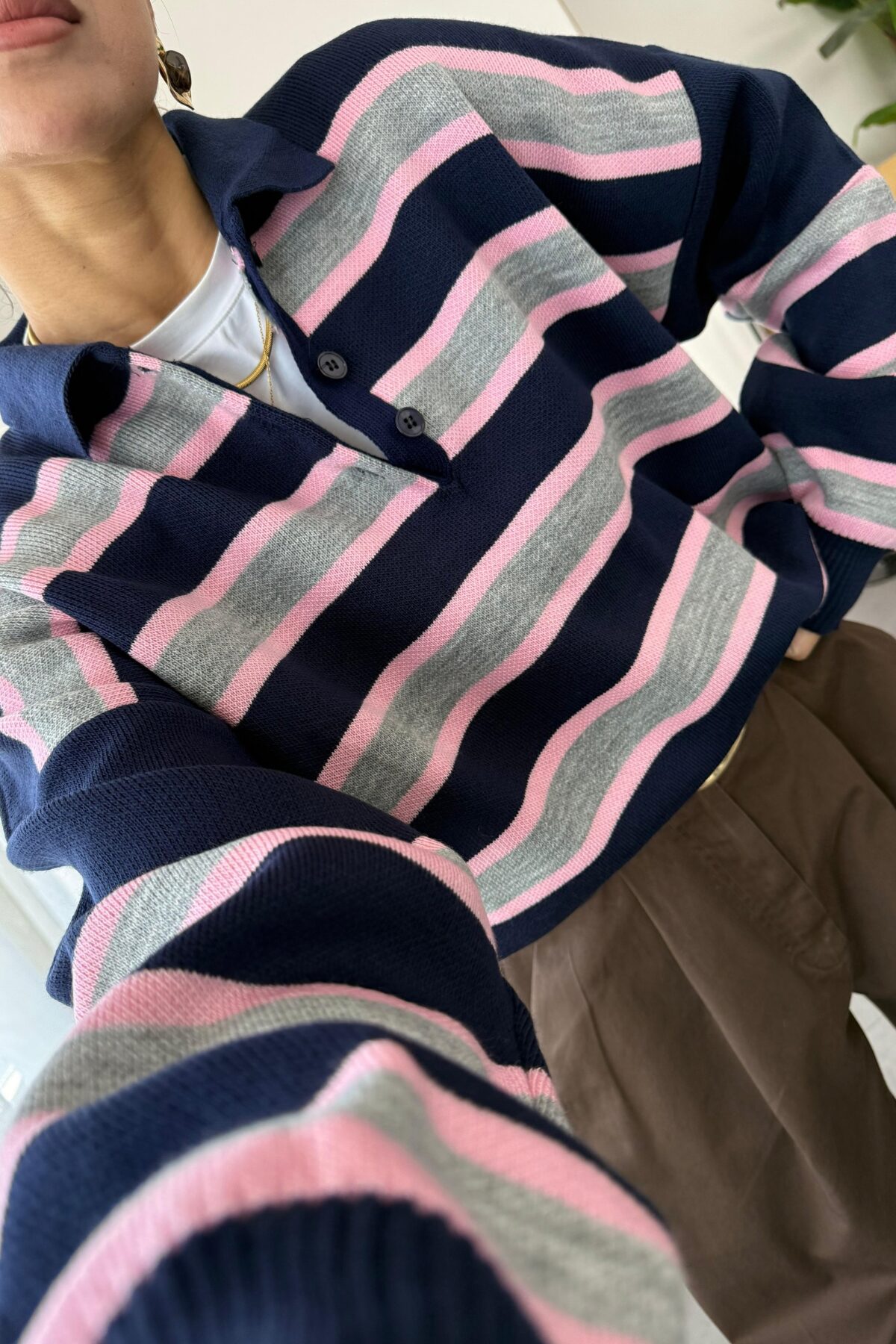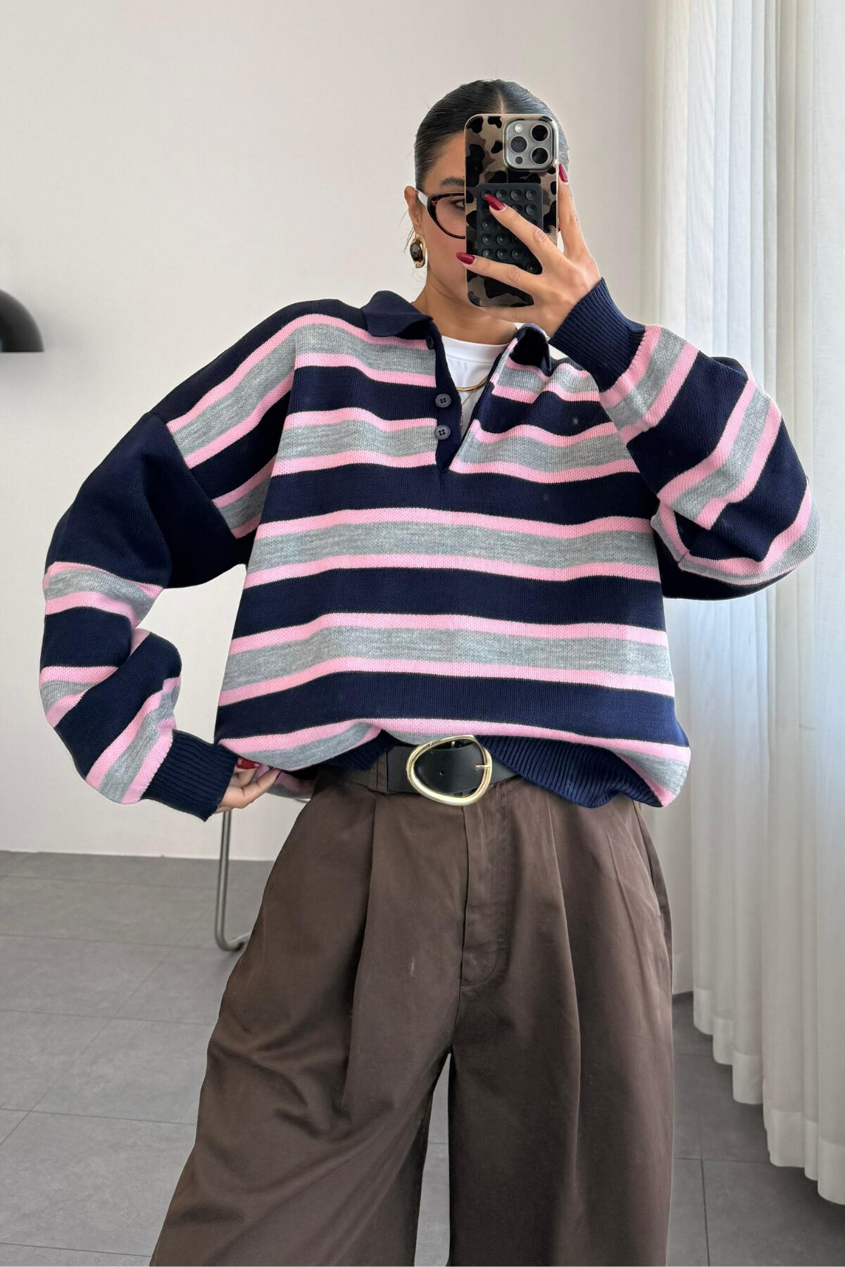 Düğmeli Oversize Çizgili Kazak Lacivert