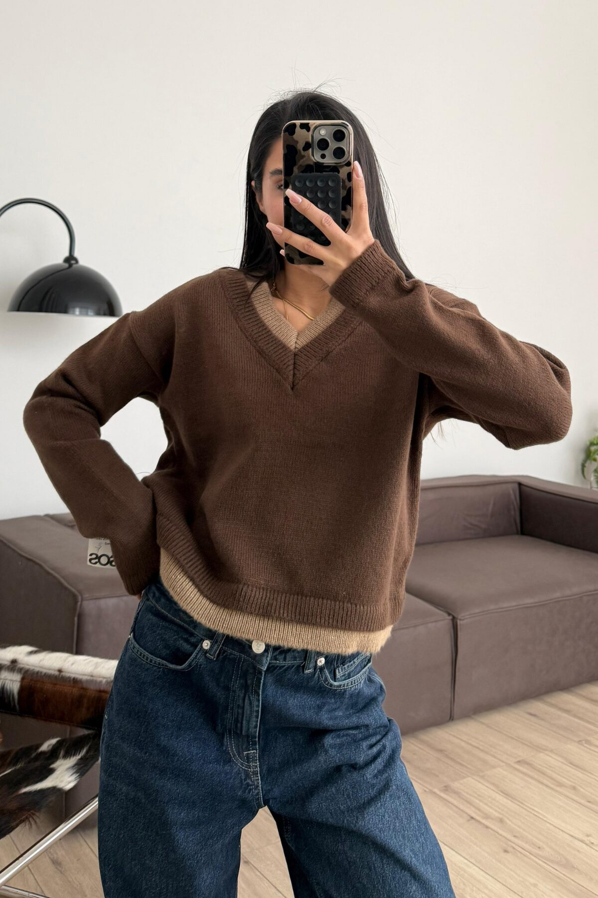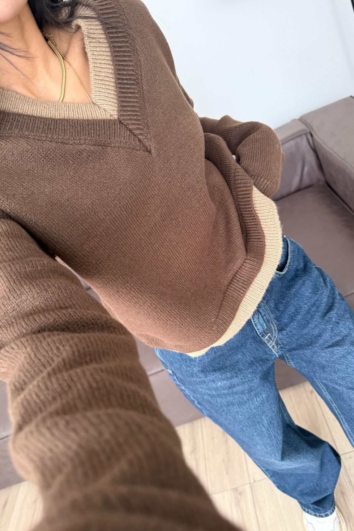 İki Renkli V Yaka Triko Kazak Kahverengi