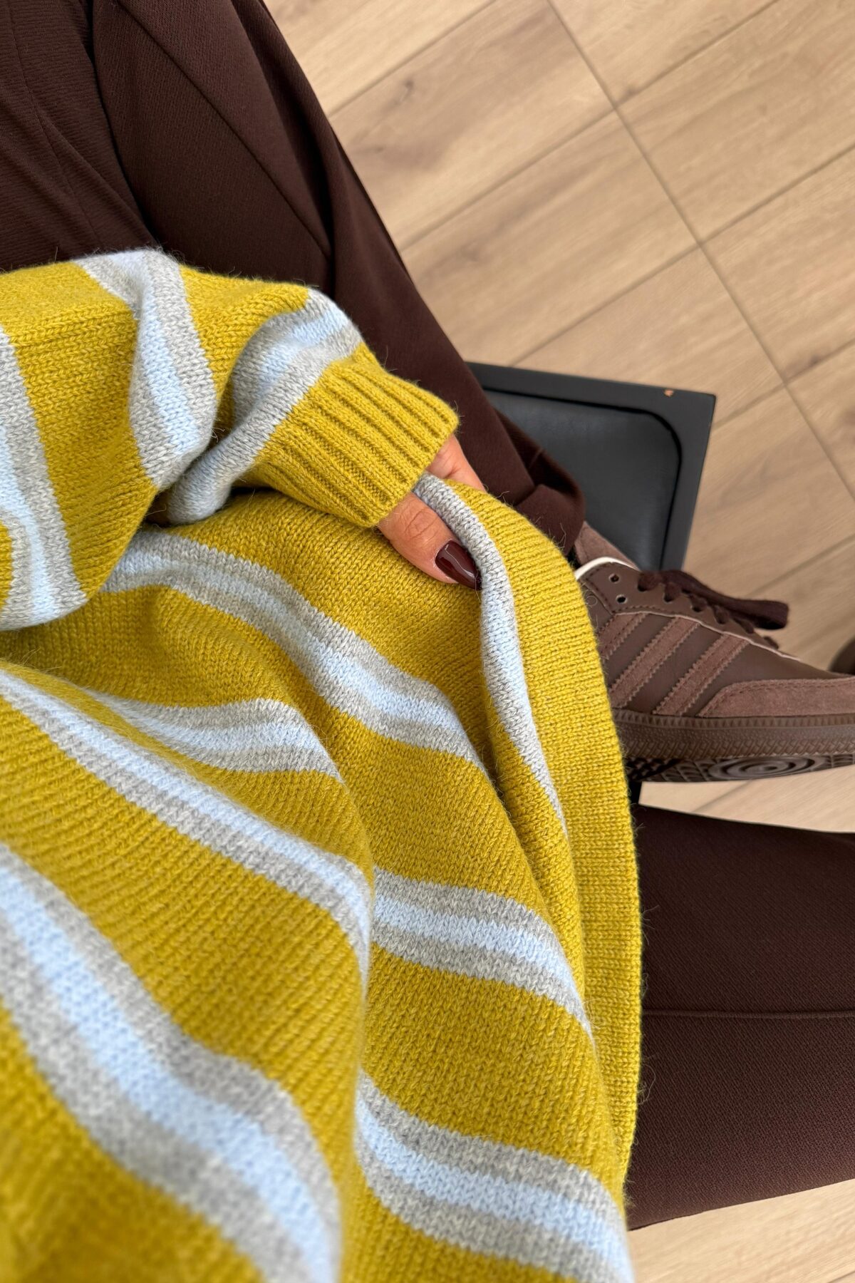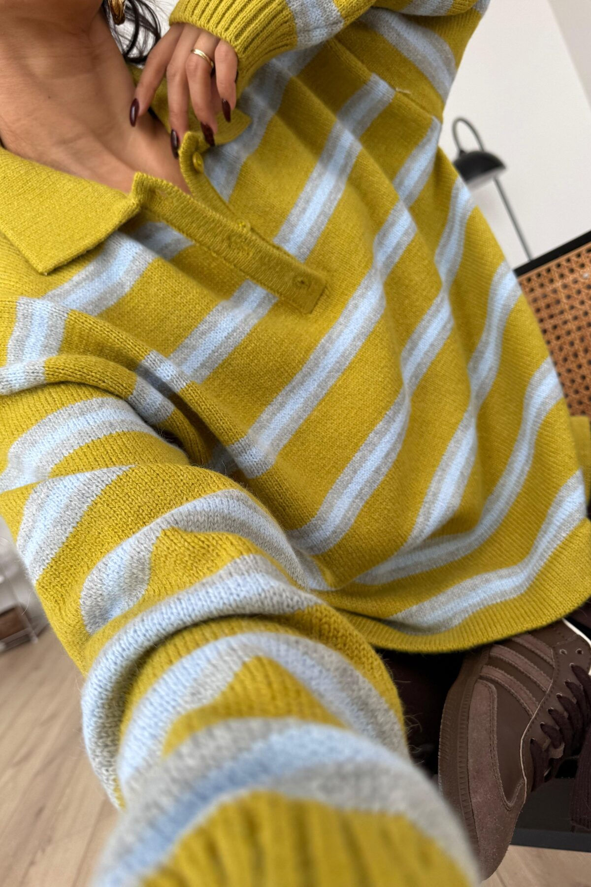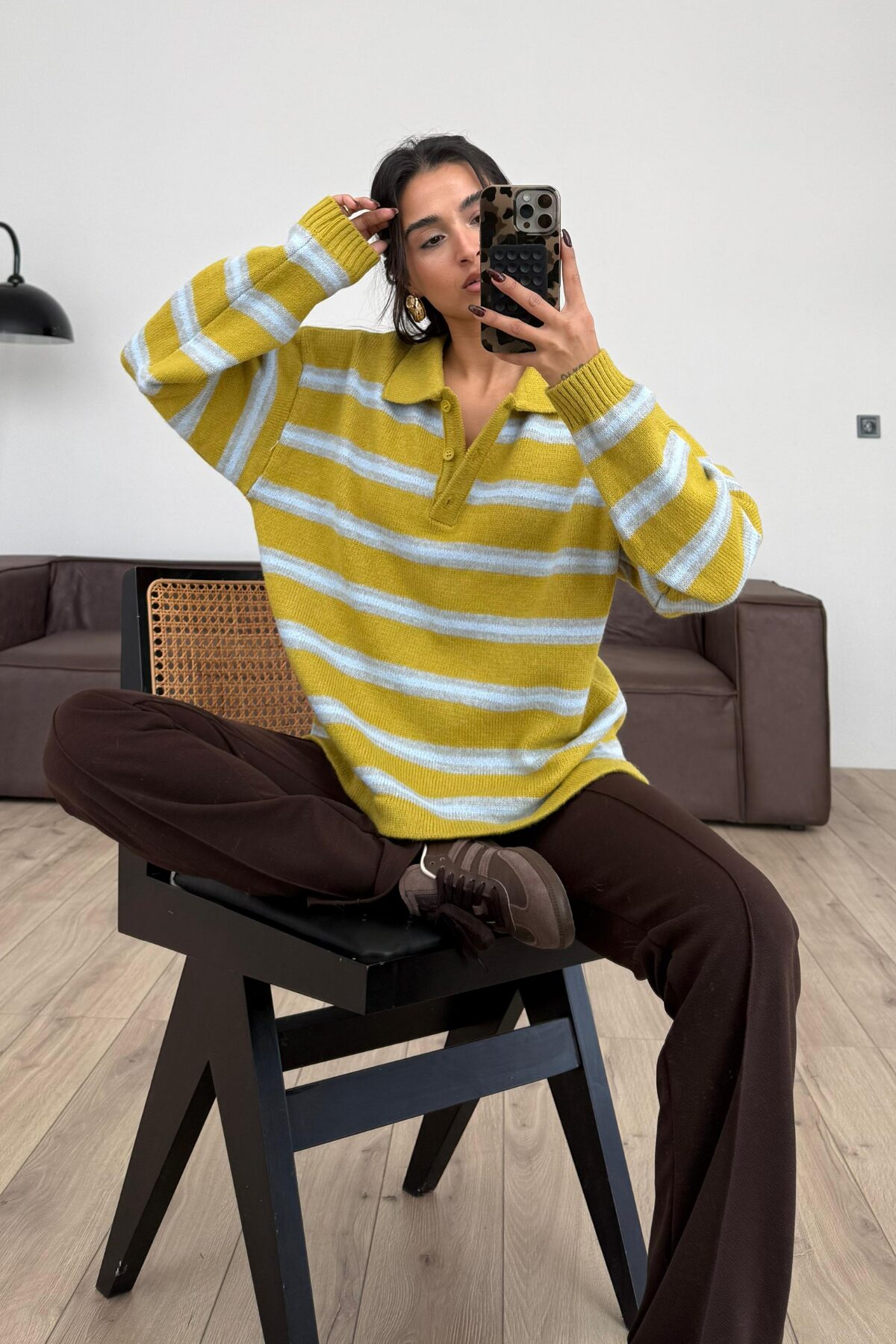 Polo Yaka Çizgili Örgü Kazak Yeşil