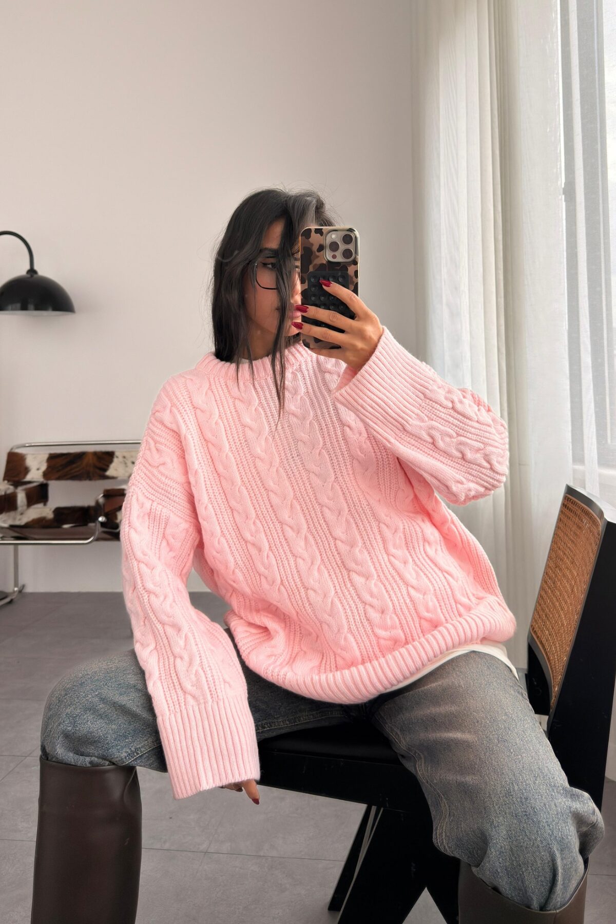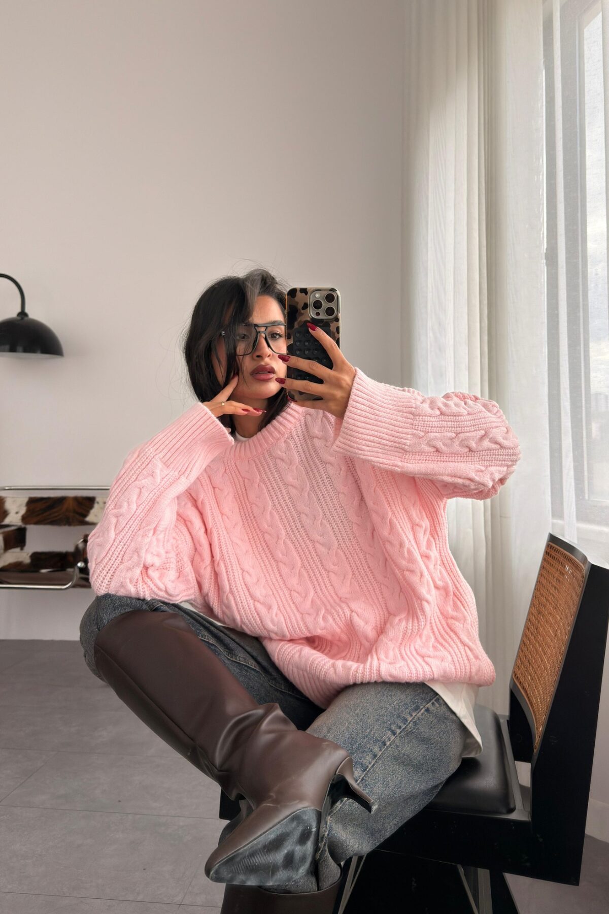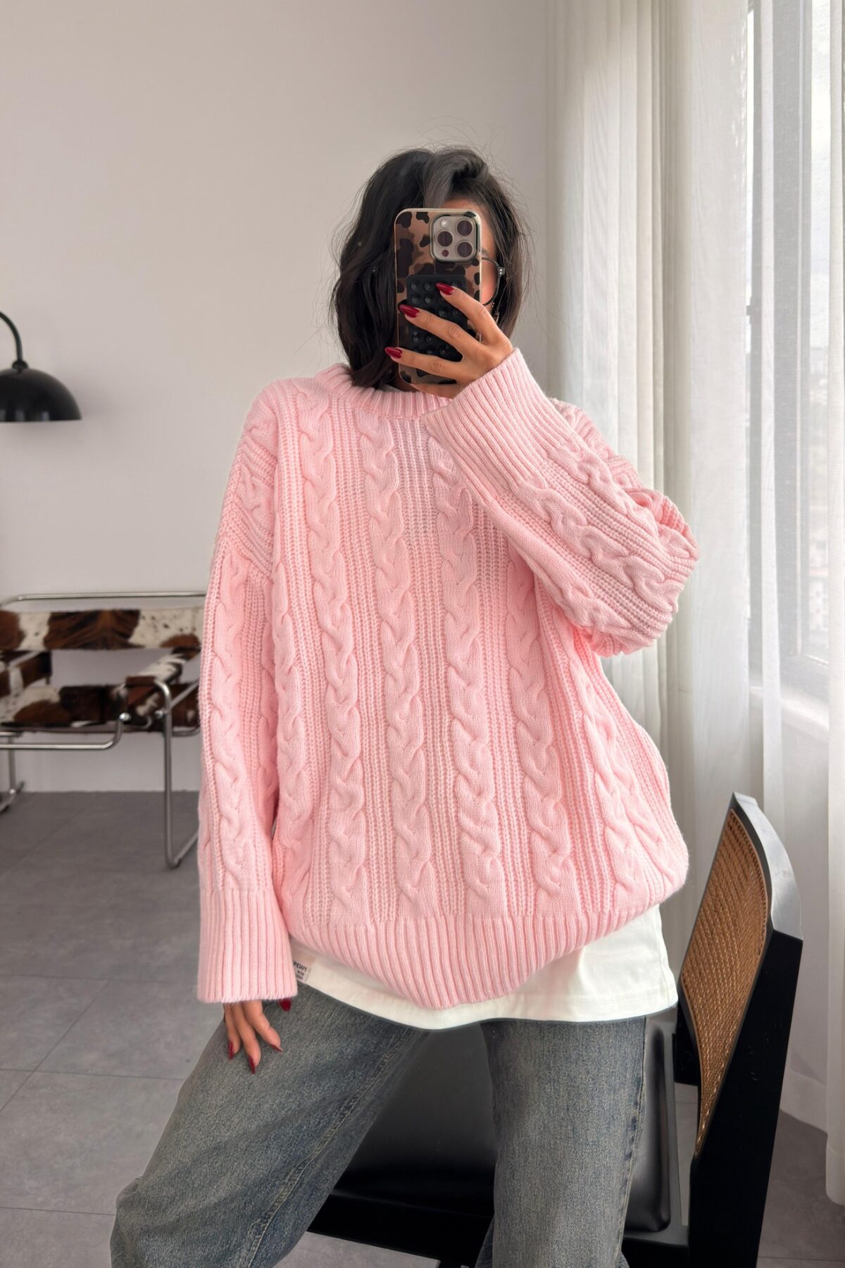 Saç Örgülü Bisiklet Yaka Kazak Pembe