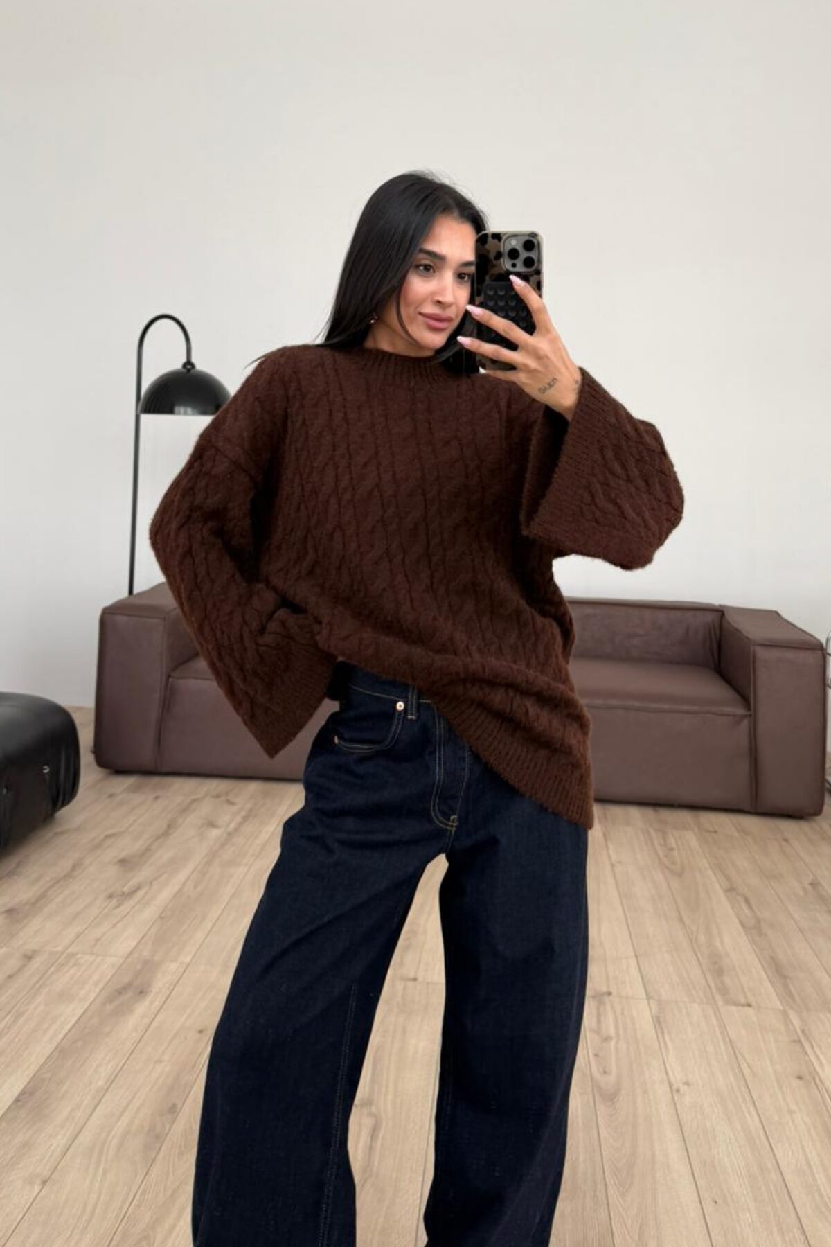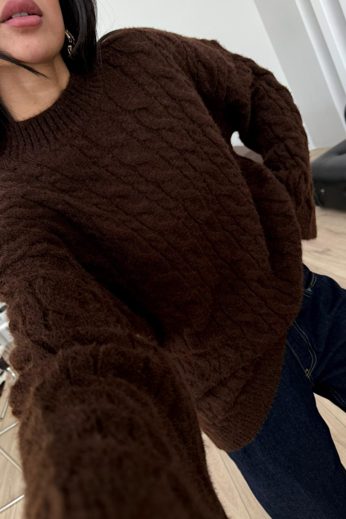 Triko Saç Örgülü Kazak Kahverengi