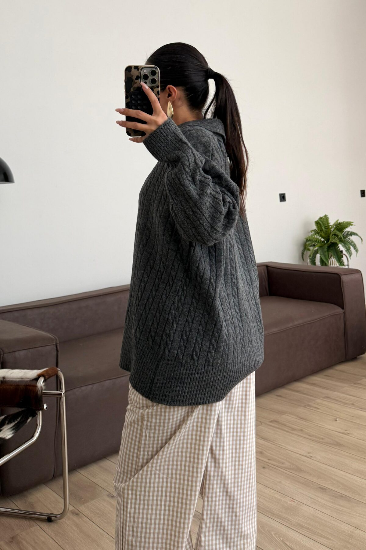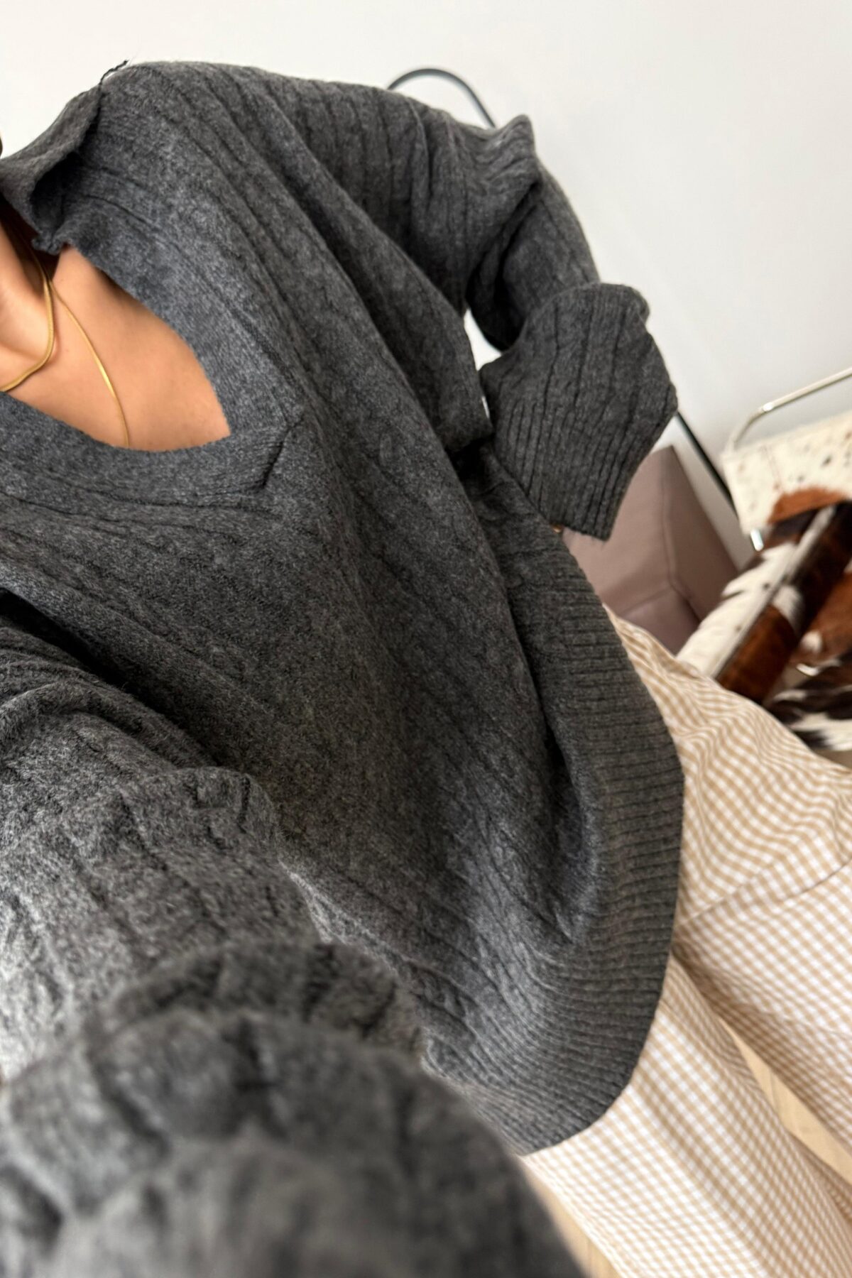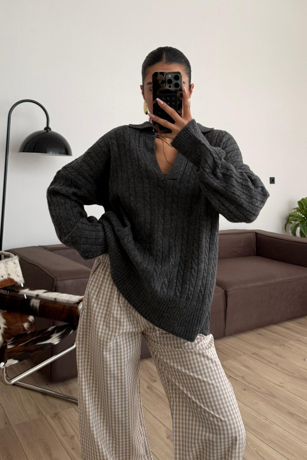 V Yaka Zincir Örgülü Triko Kazak Antrasit