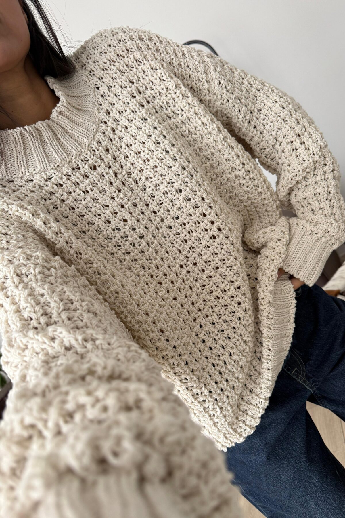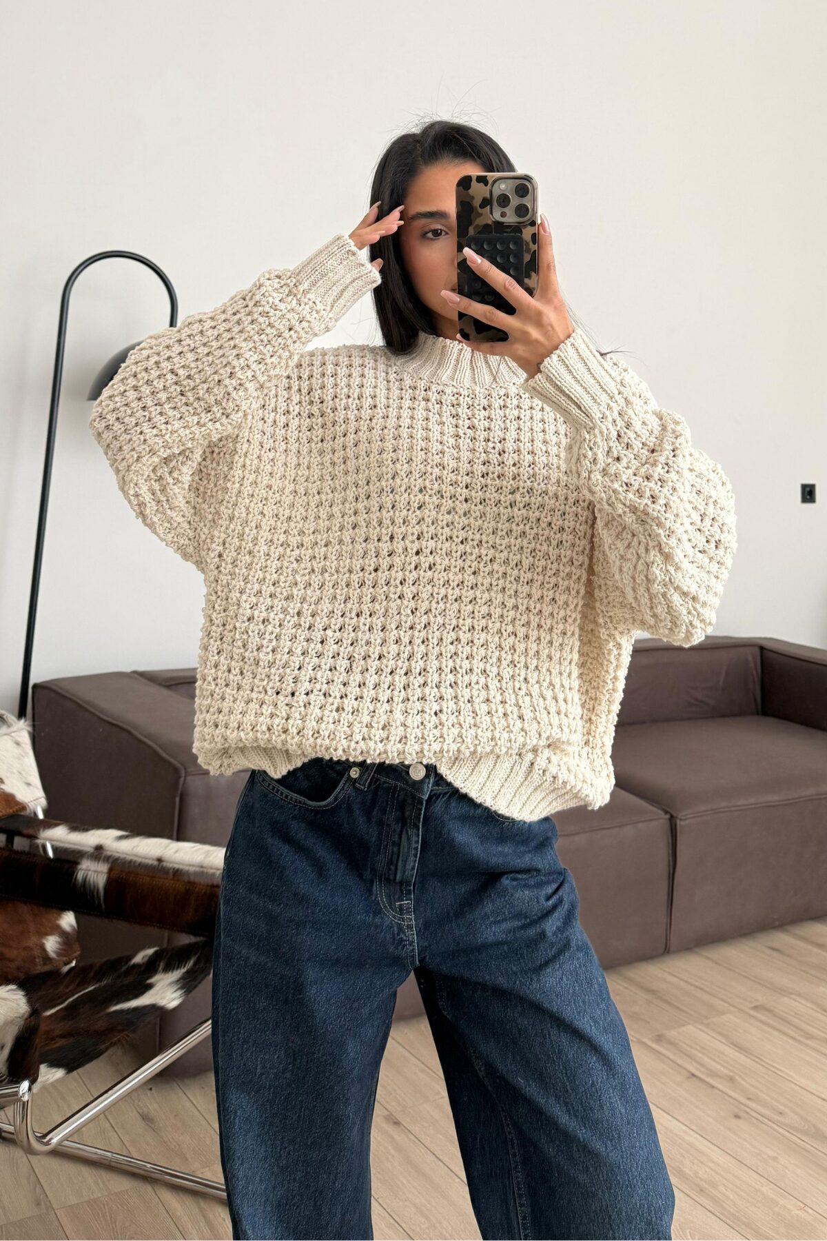 Yarım Boğazlı Selanik Örgülü Kazak Ekru