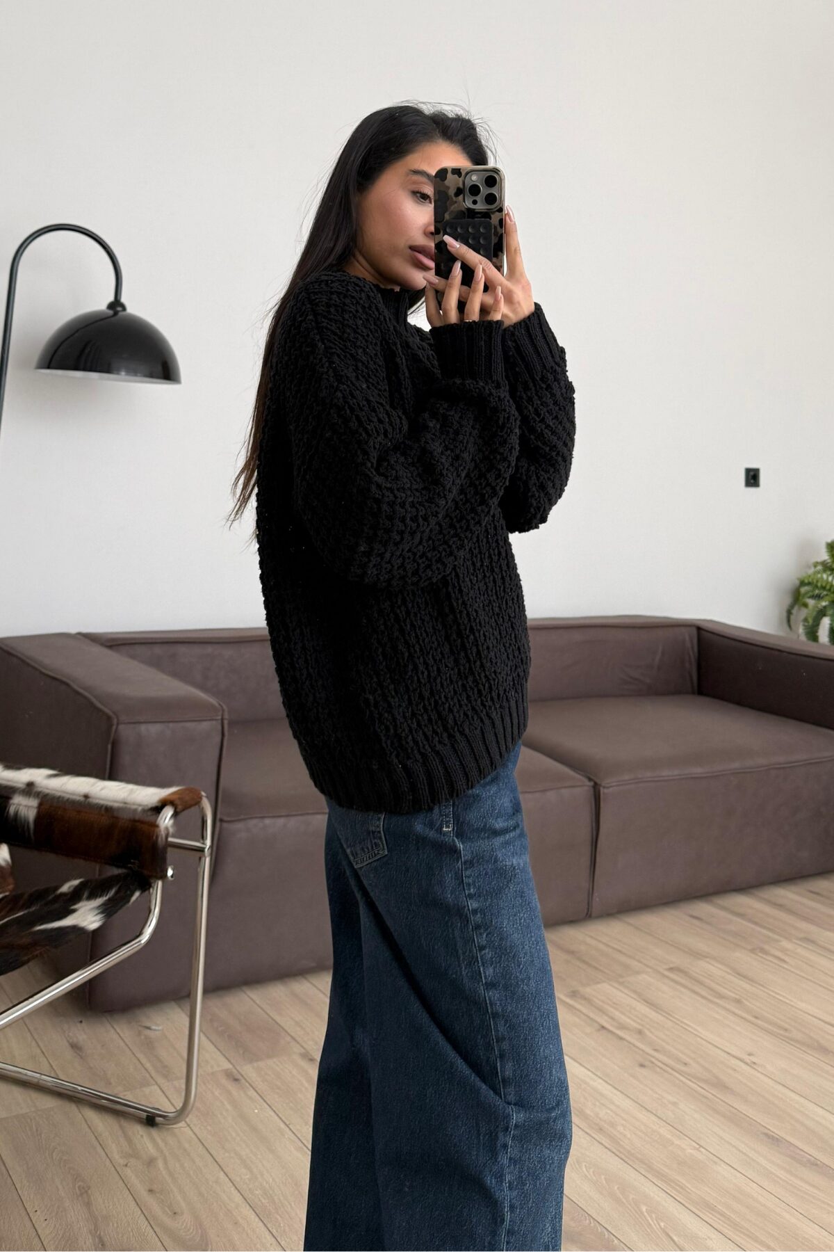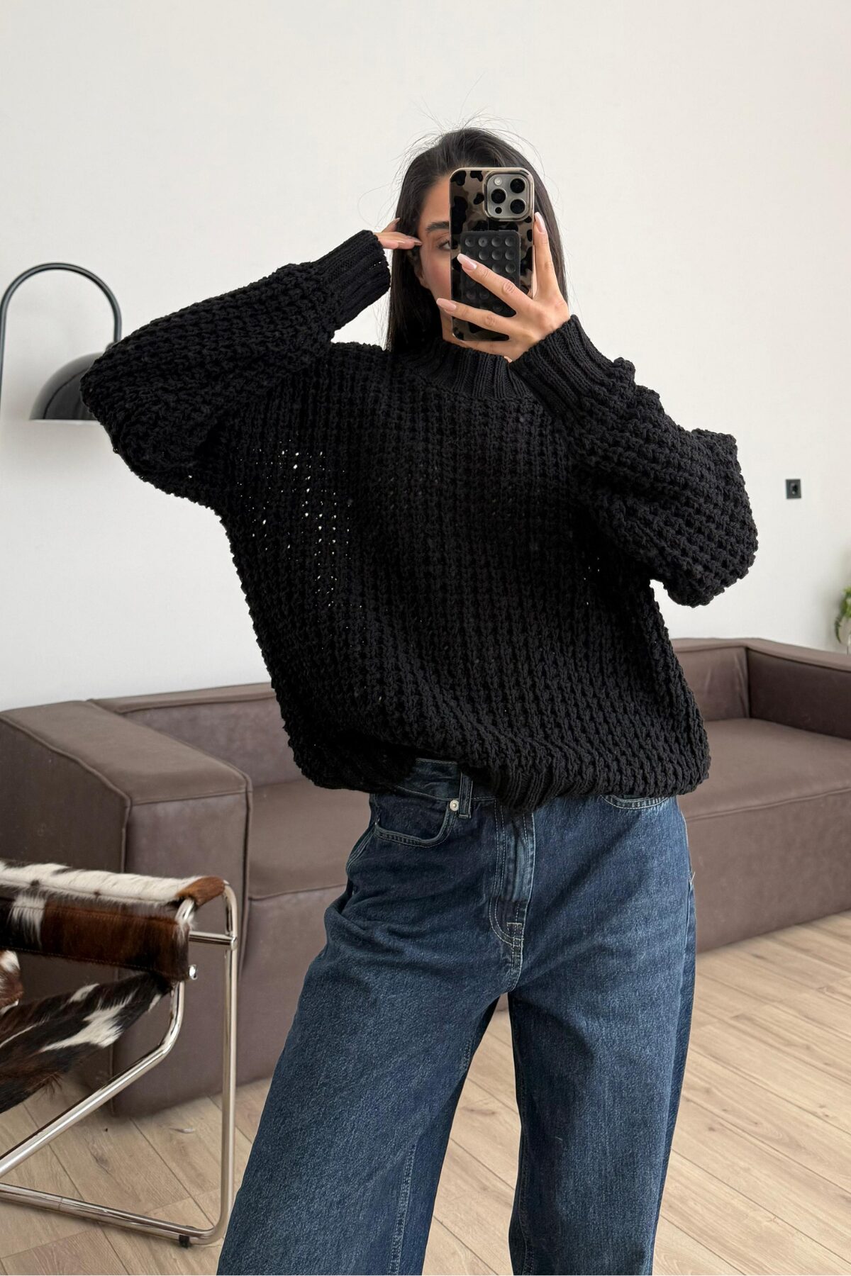 Yarım Boğazlı Selanik Örgülü Kazak Siyah