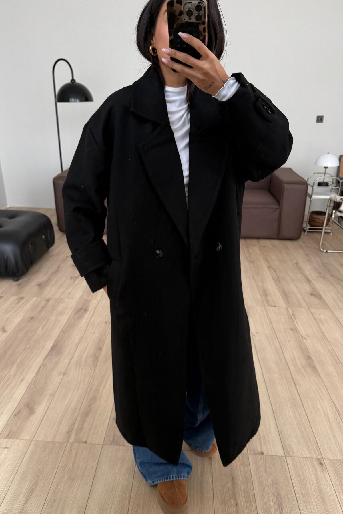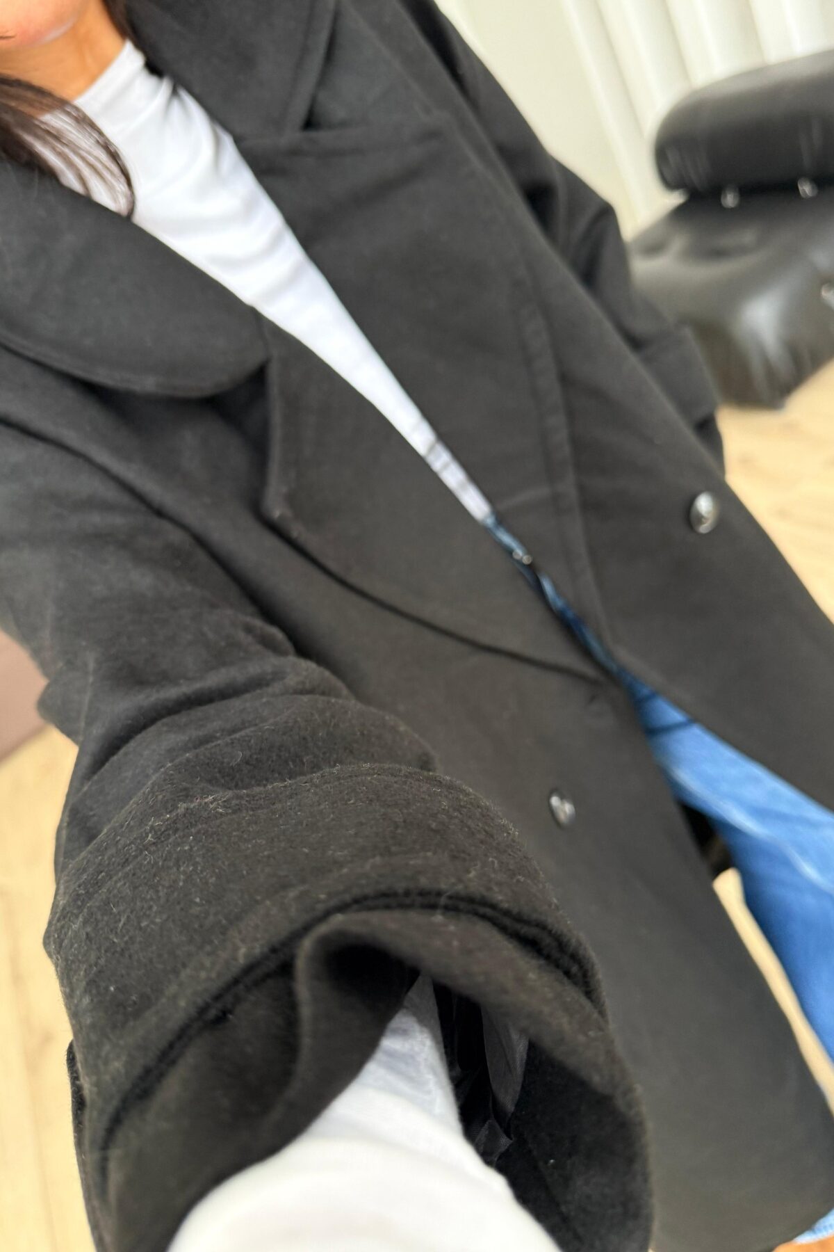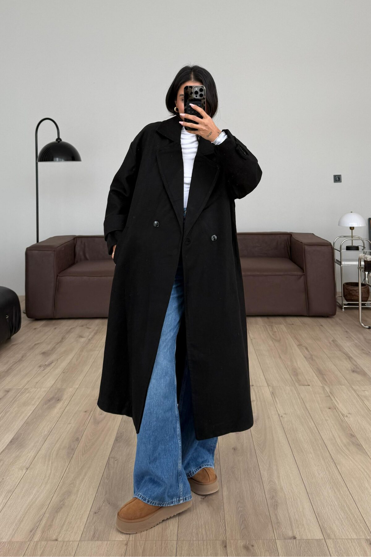 Astarlı Kruvaze Yaka Kaşe Kaban Siyah