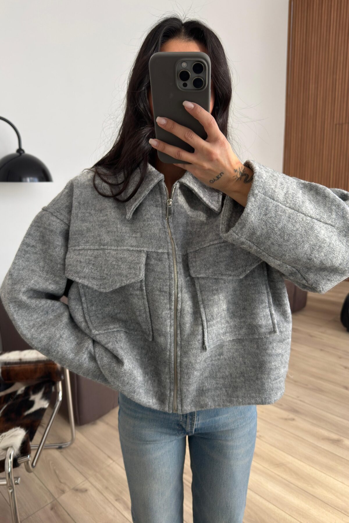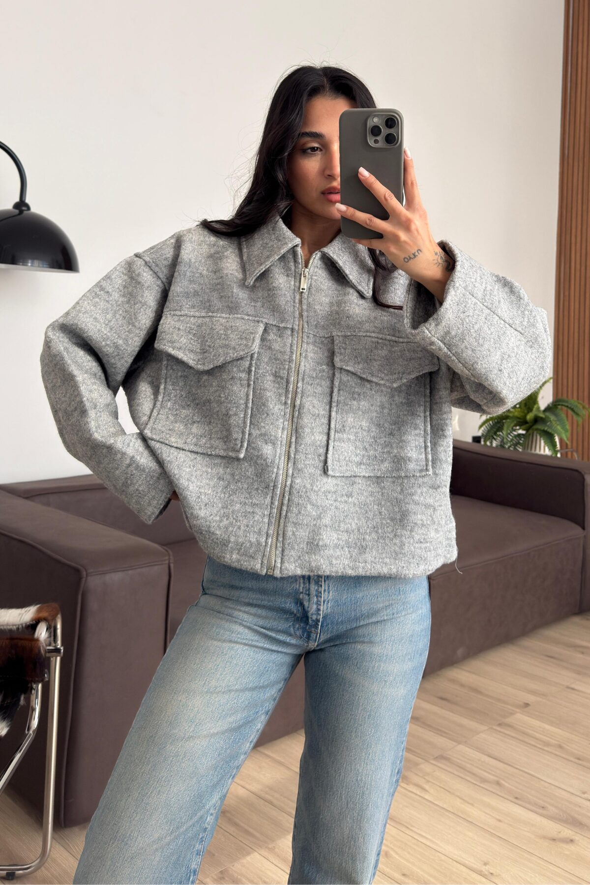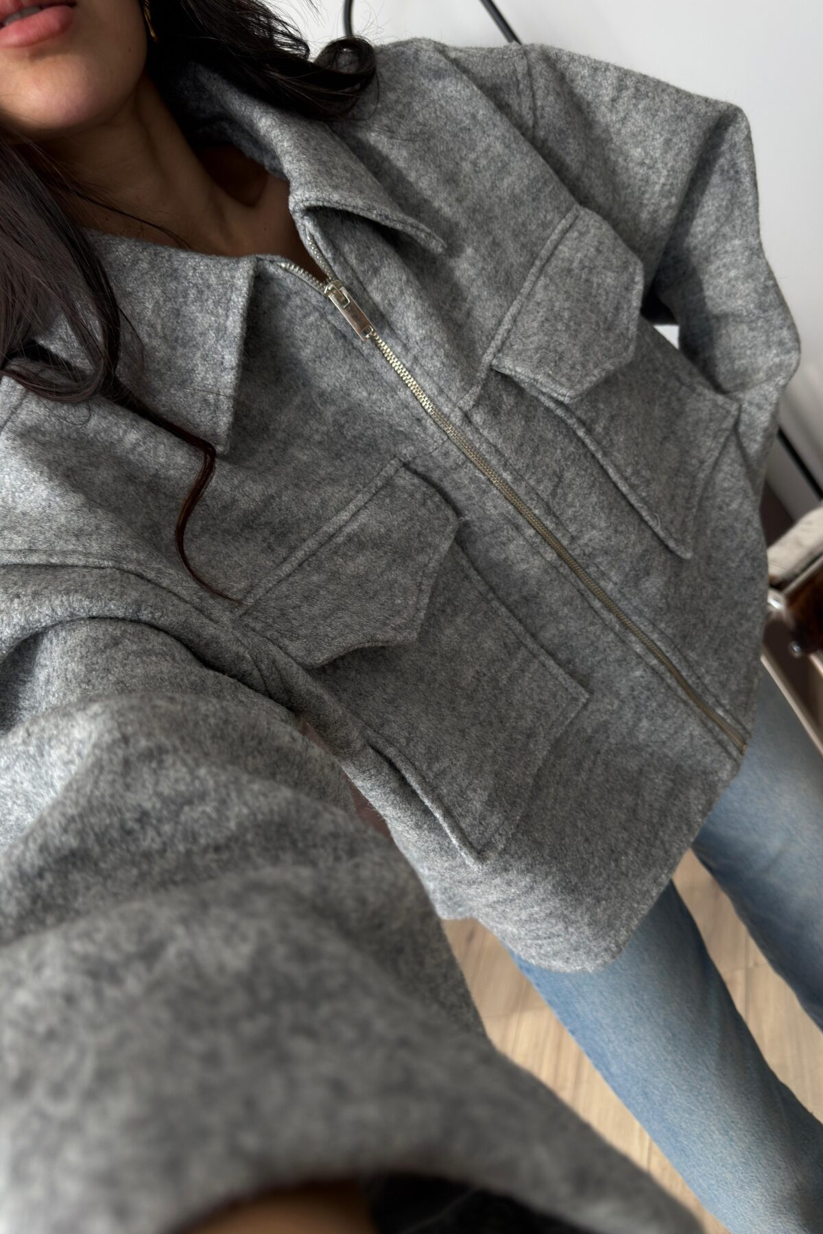 Kısa Safari Cepli Kaşe Kaban Gri