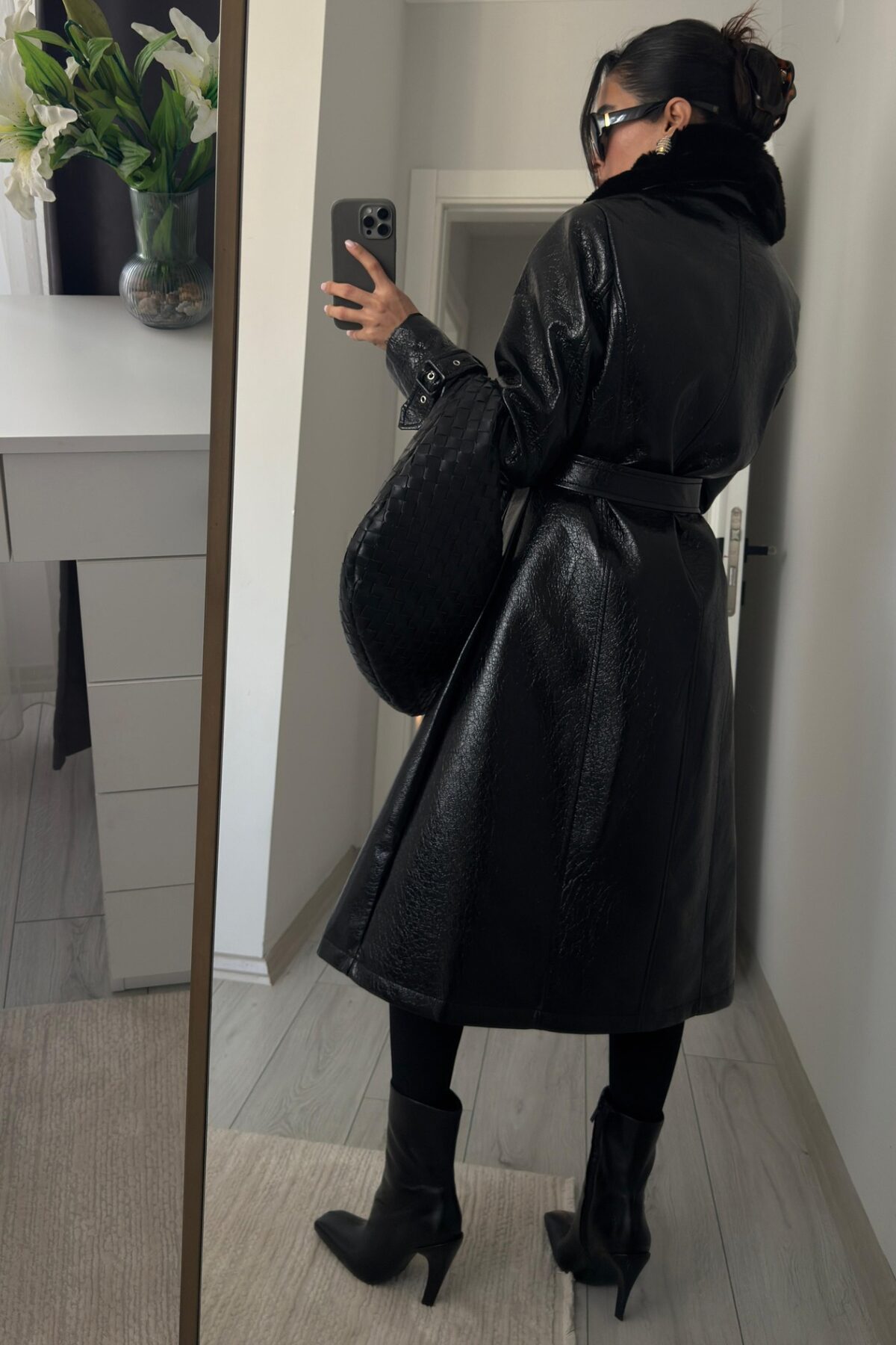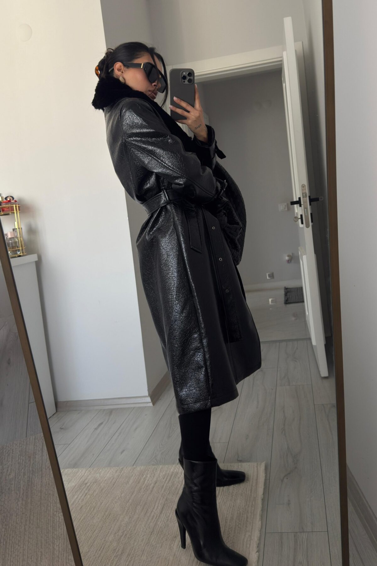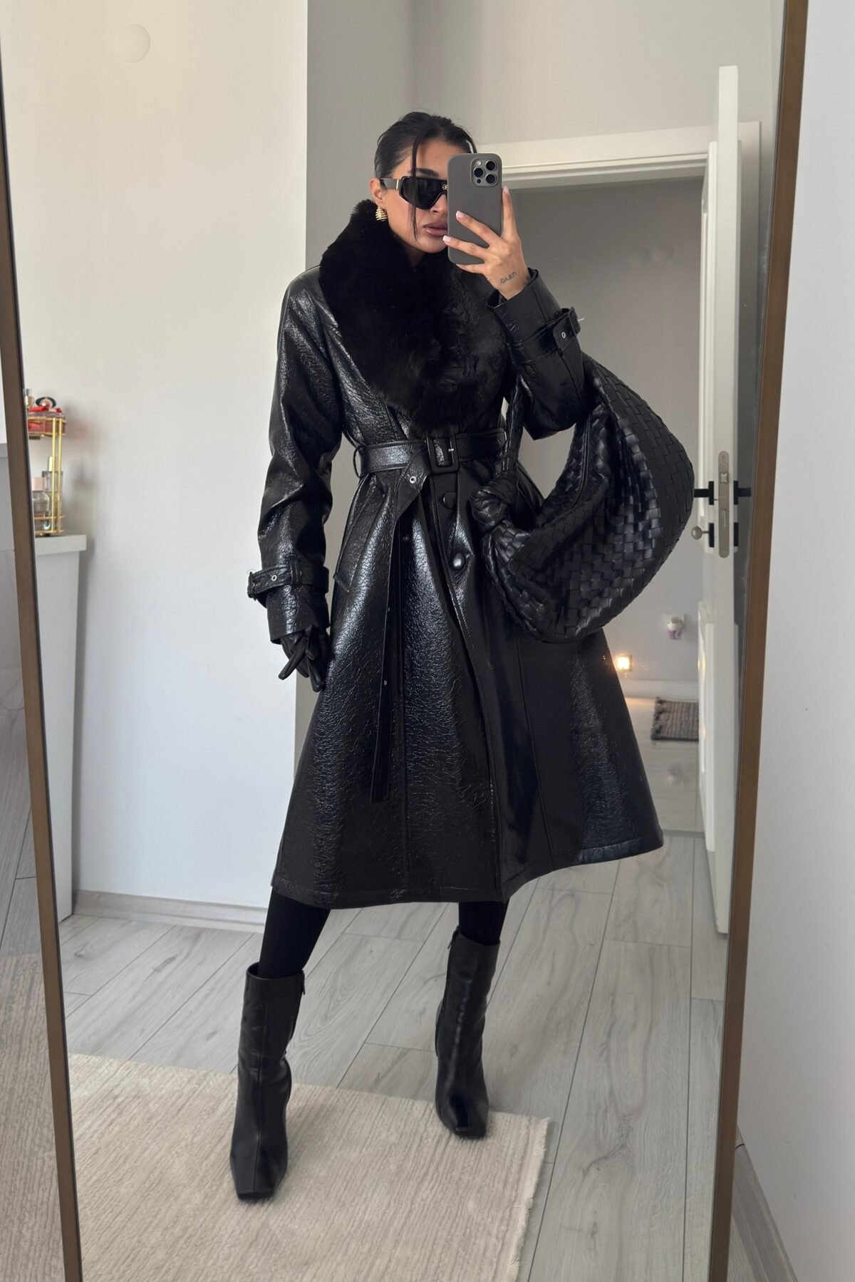 Yakası Kürklü Rugan Deri Kaban Siyah