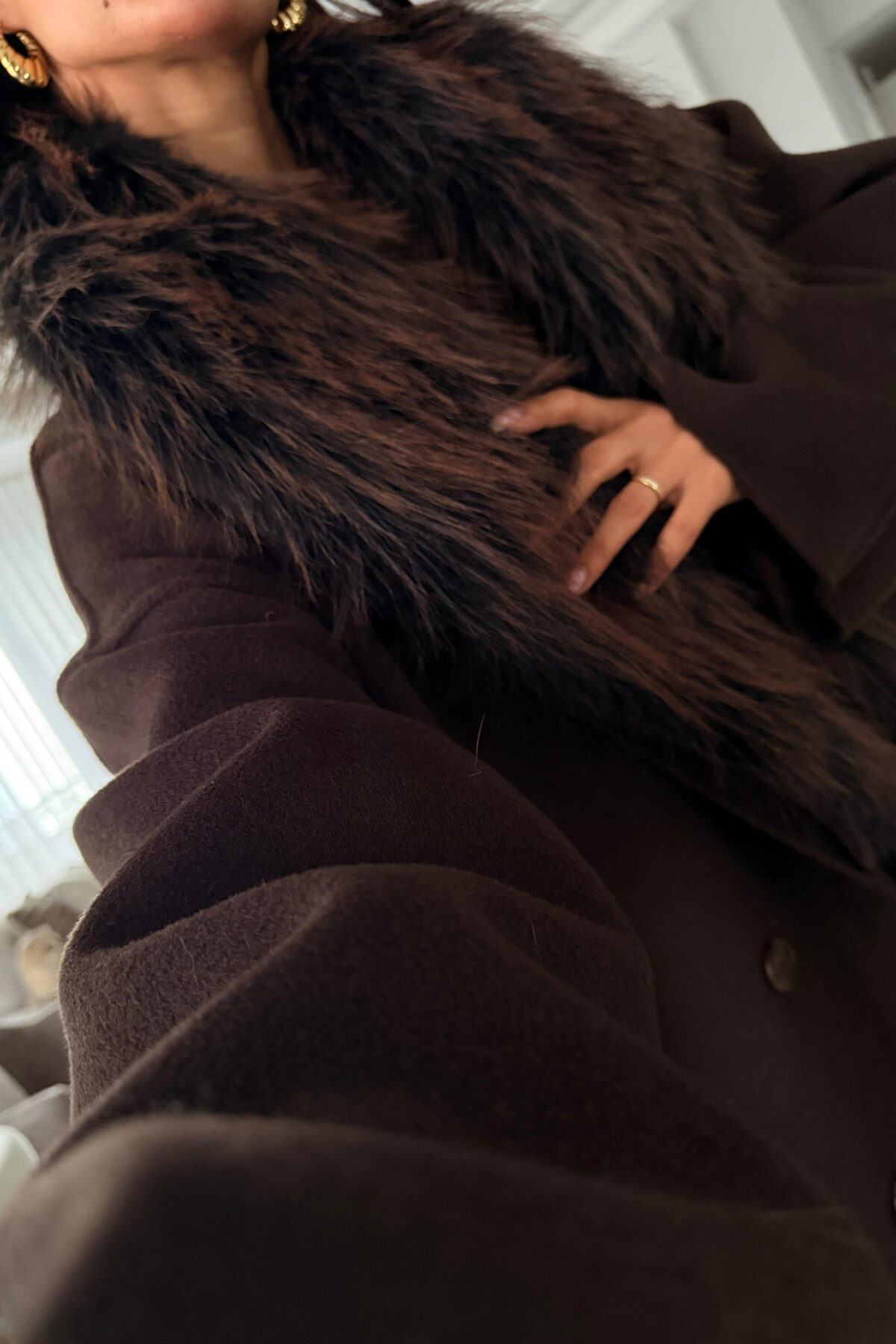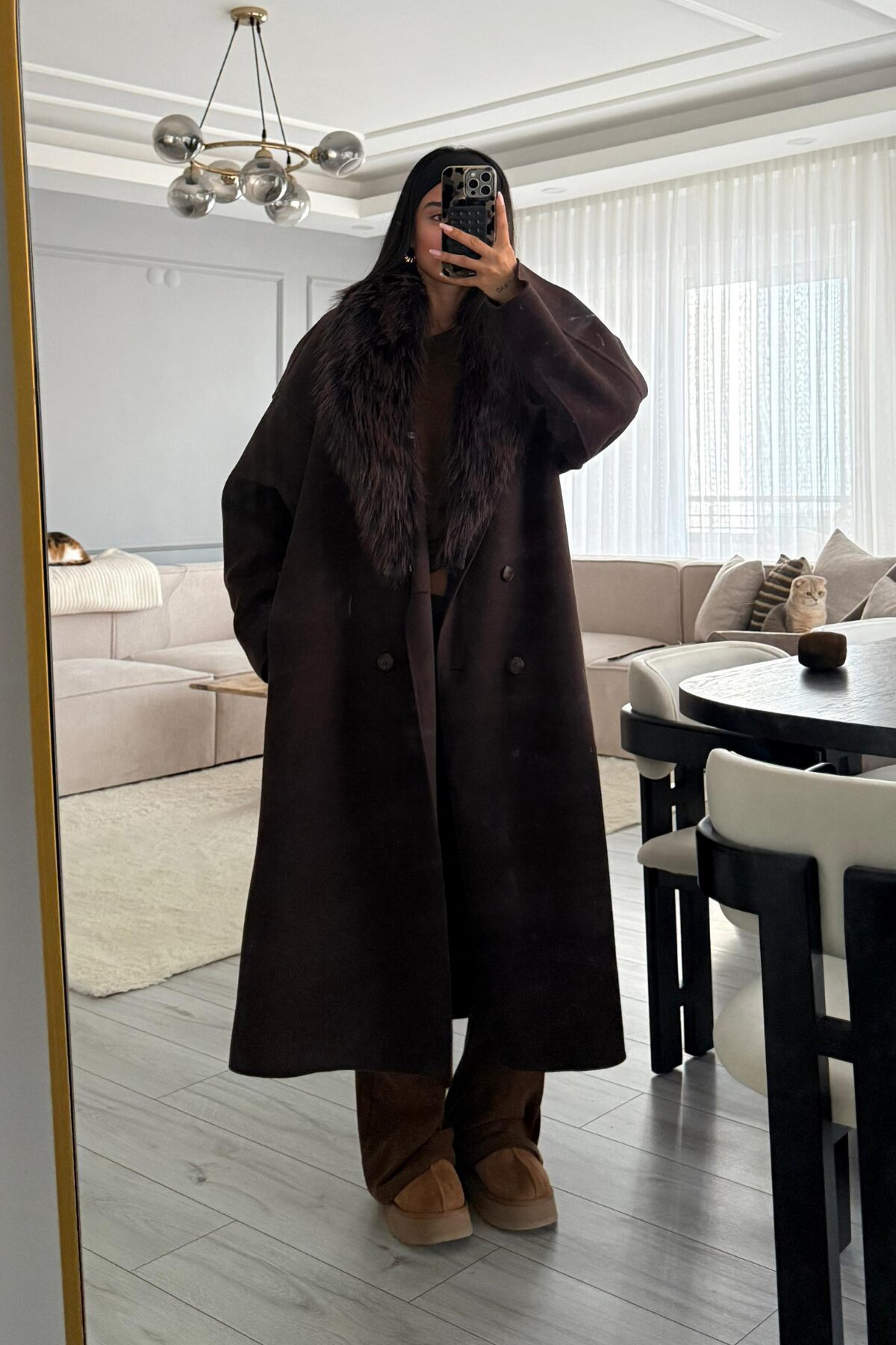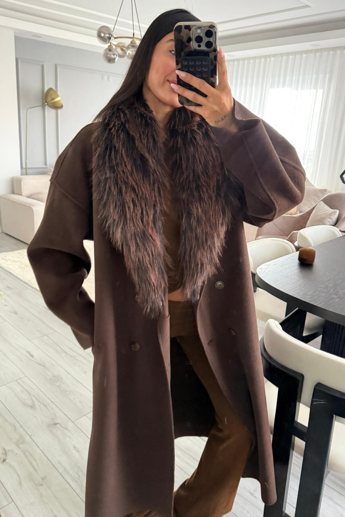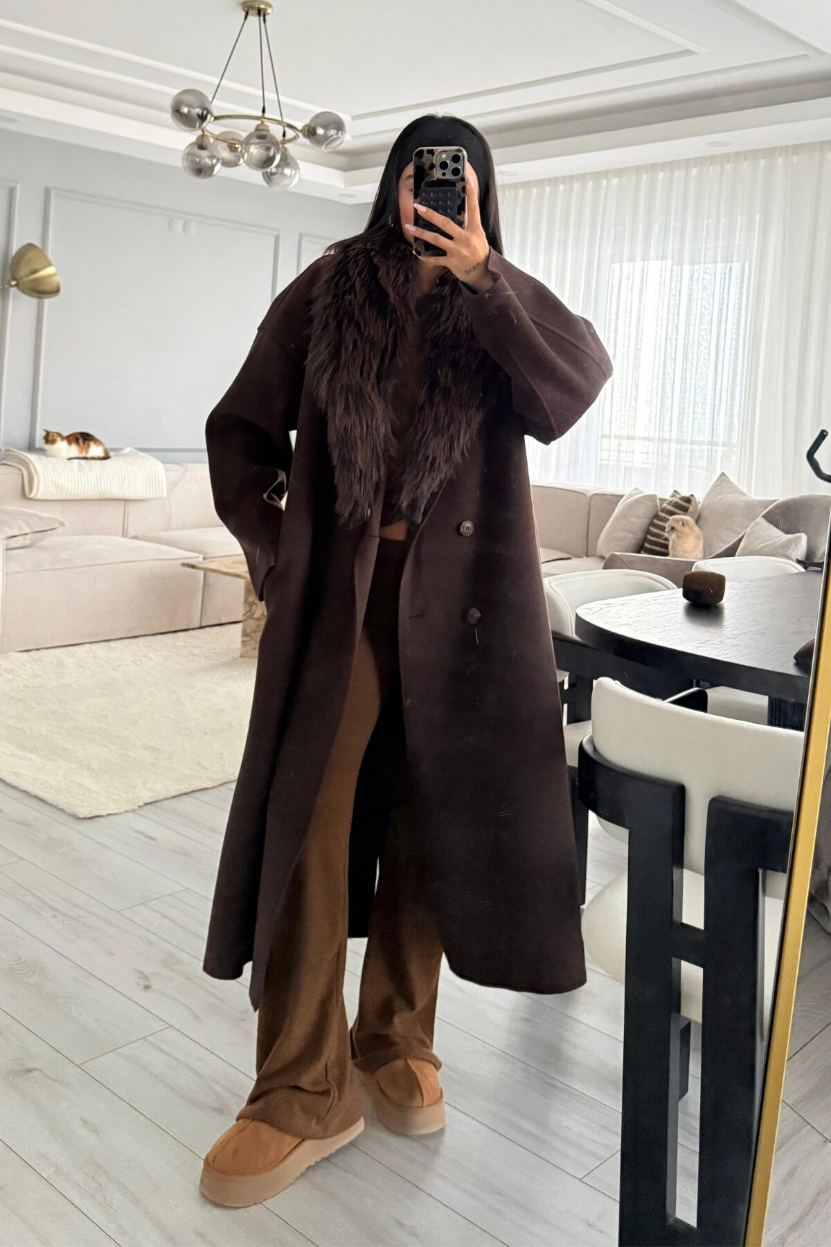 Yakası Kürklü Uzun Kaşe Kaban Kahverengi