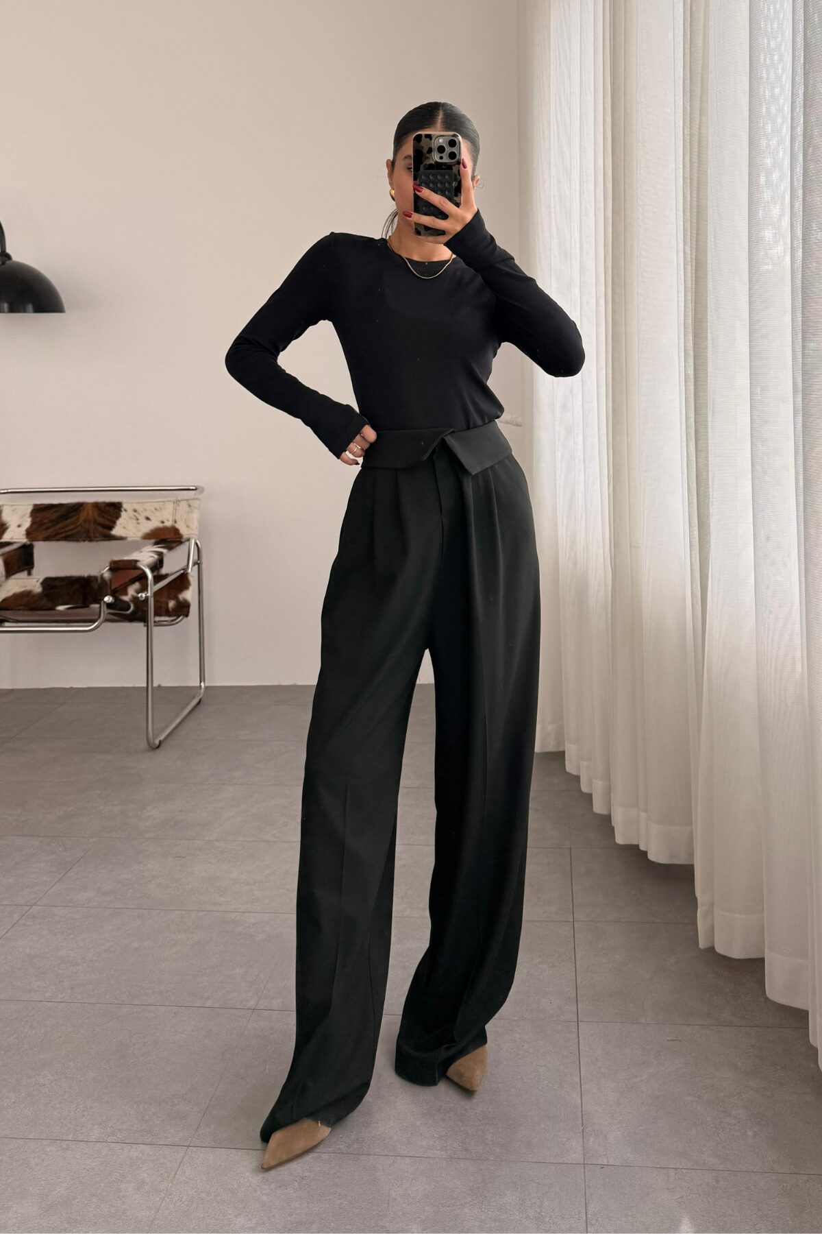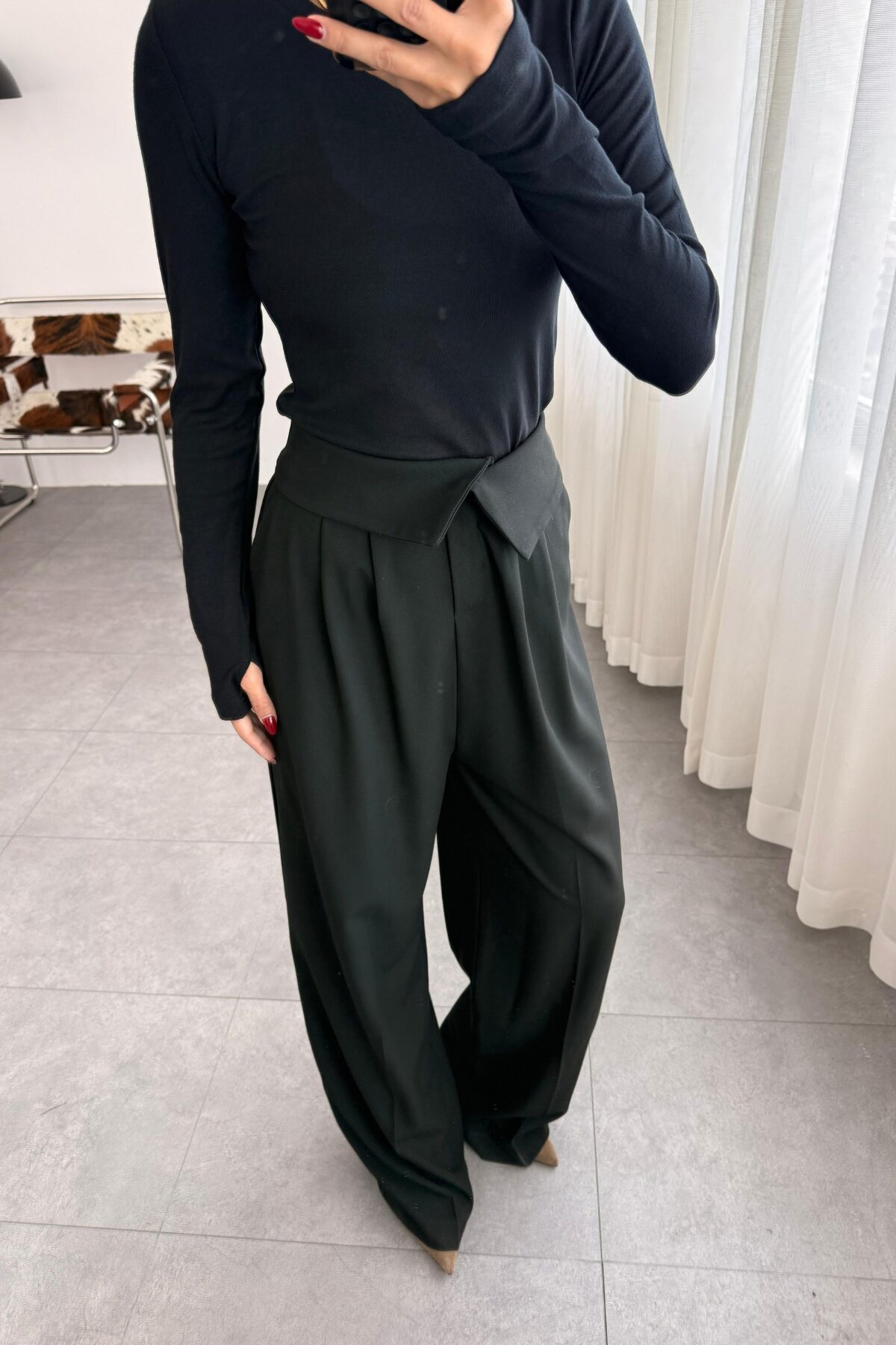 Beli Katlı Kumaş Pantolon Siyah