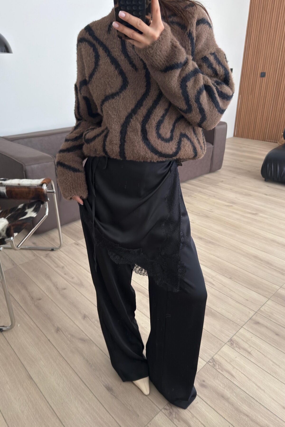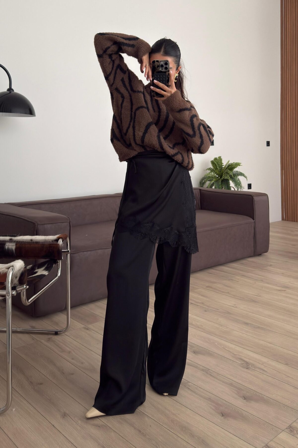 Dantel Pareo Detaylı Saten Pantolon Siyah