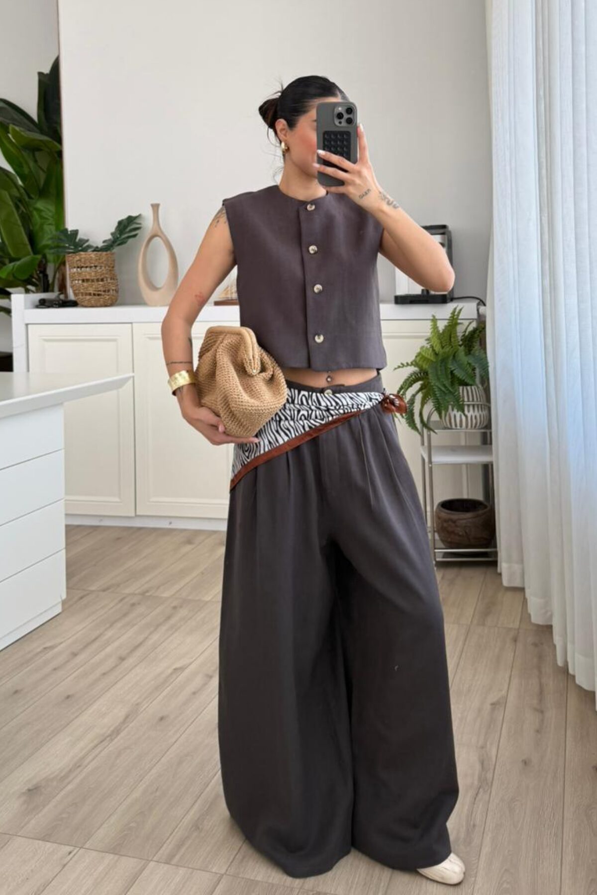 Nora Pileli Geniş Paça Pantolon Kahverengi