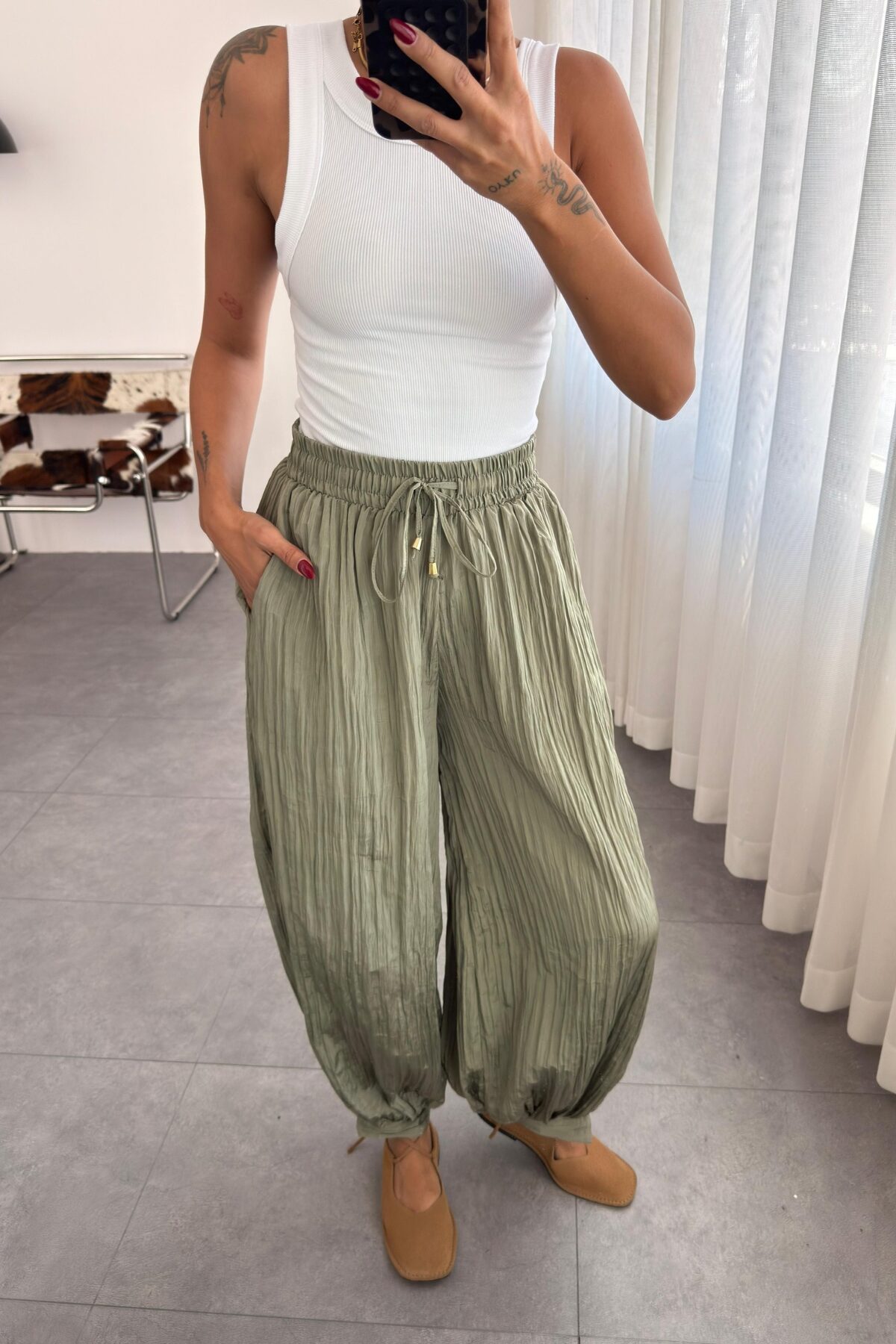 Paçası Düğmeli Kırışık Şalvar Pantolon Haki