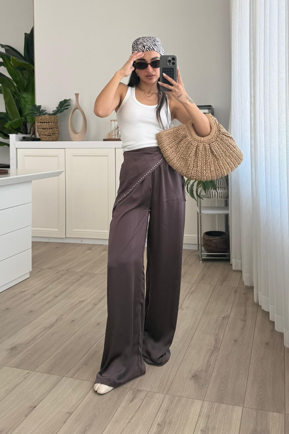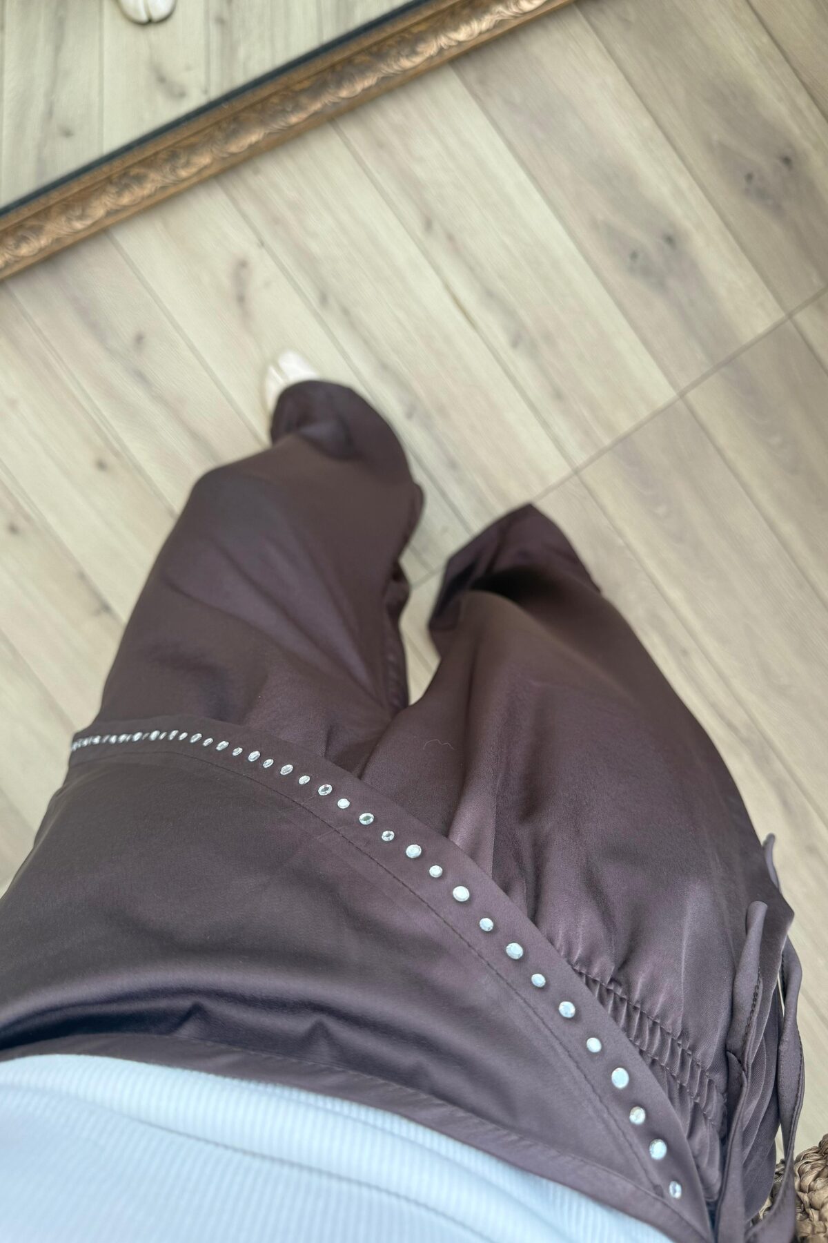 Pareosu Taşlı Saten Pantolon Kahverengi