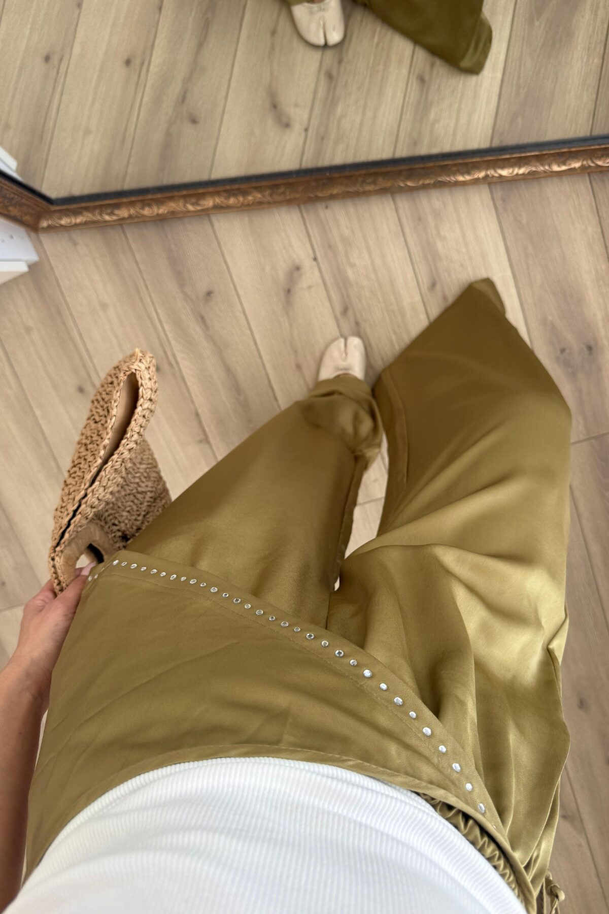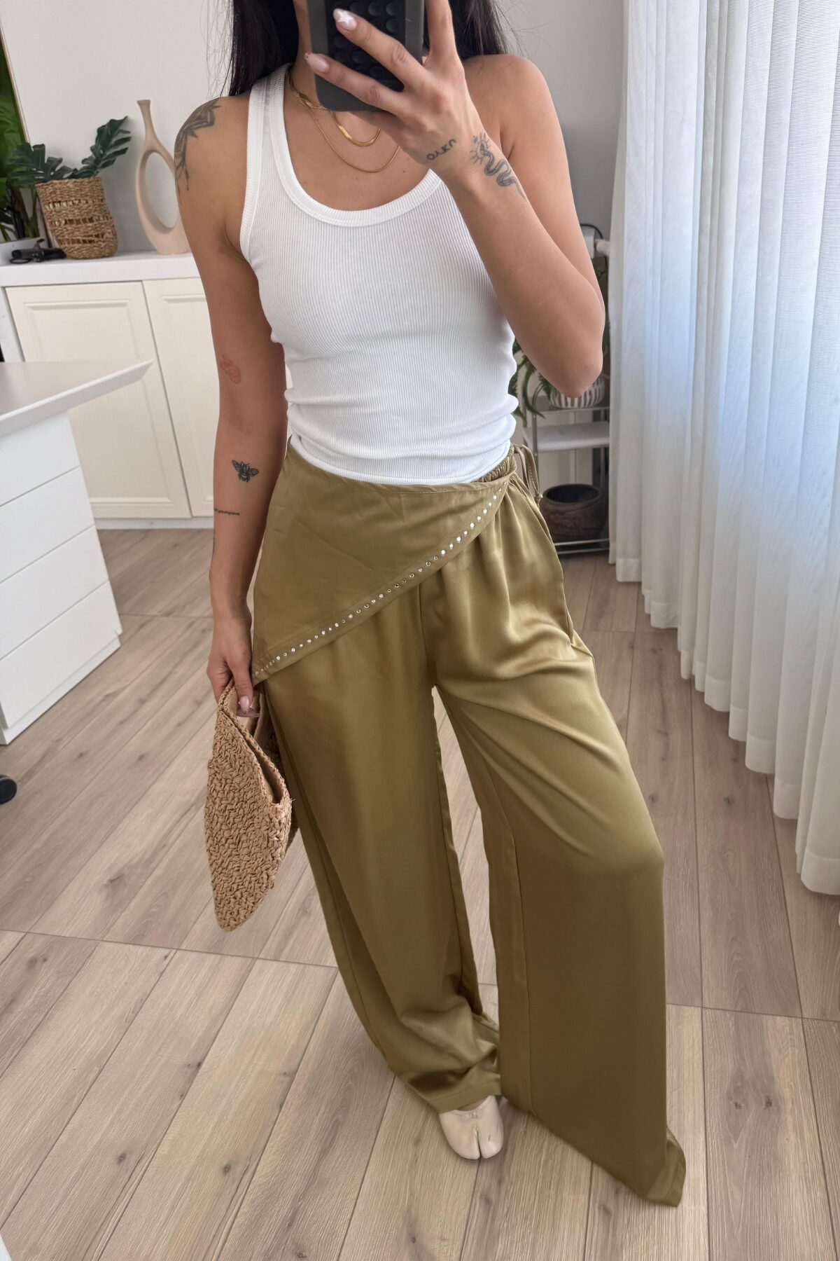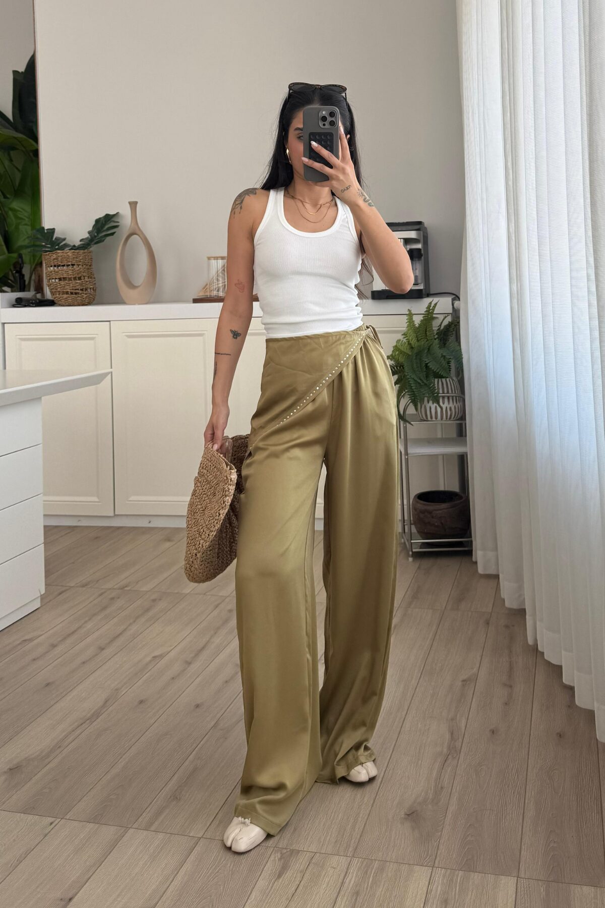 Pareosu Taşlı Saten Pantolon Yağ Yeşil