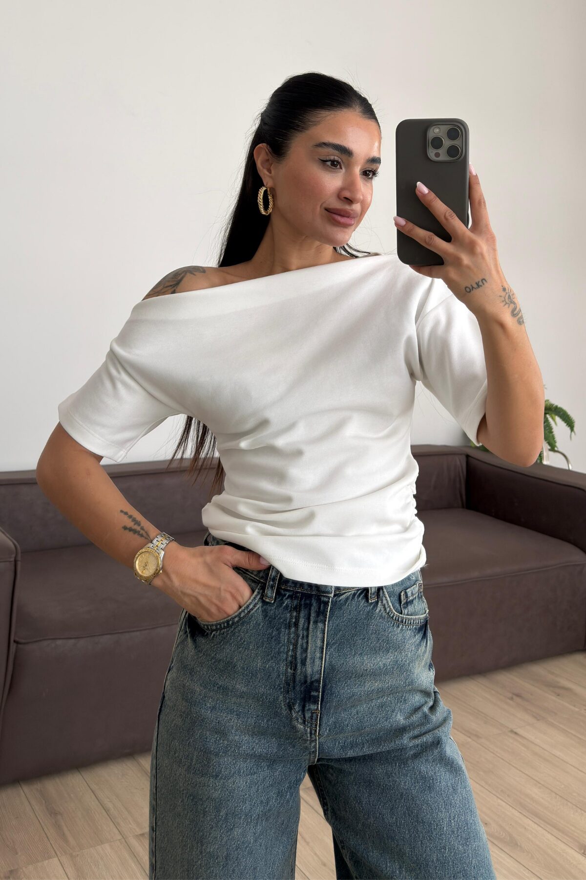 Kayık Yaka Yanları Drapeli Tişört Beyaz