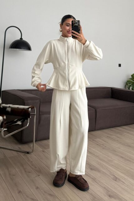 Hırkalı Modal Kumaş Eşofman Takım Ekru
