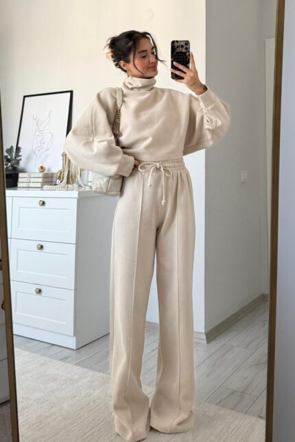 Belden Oturtmalı Dikişli Modal Takım Vizon