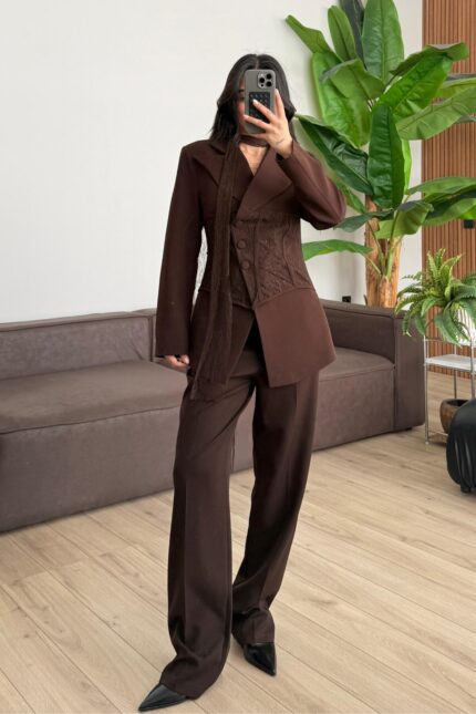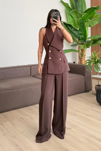 Arma Düğmeli Yelek Pantolon Takım Bej
