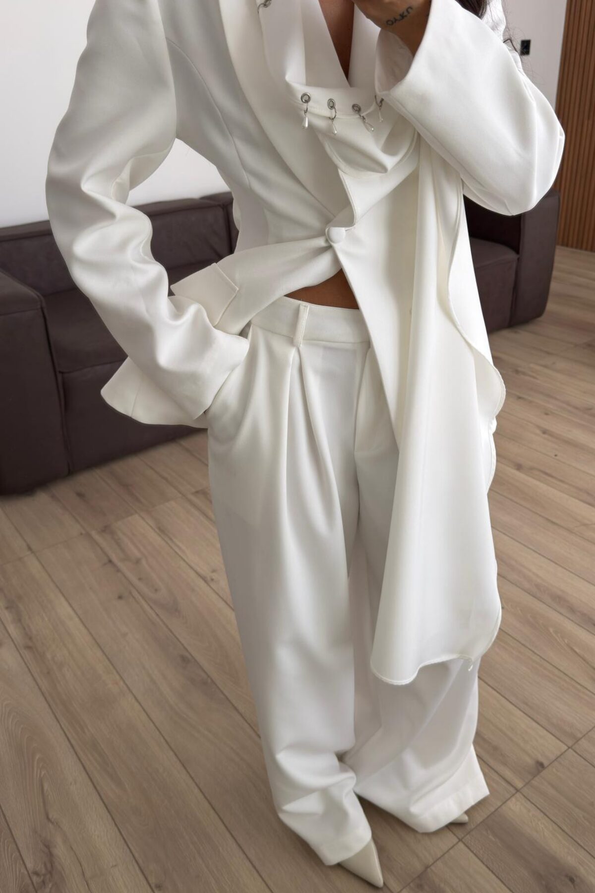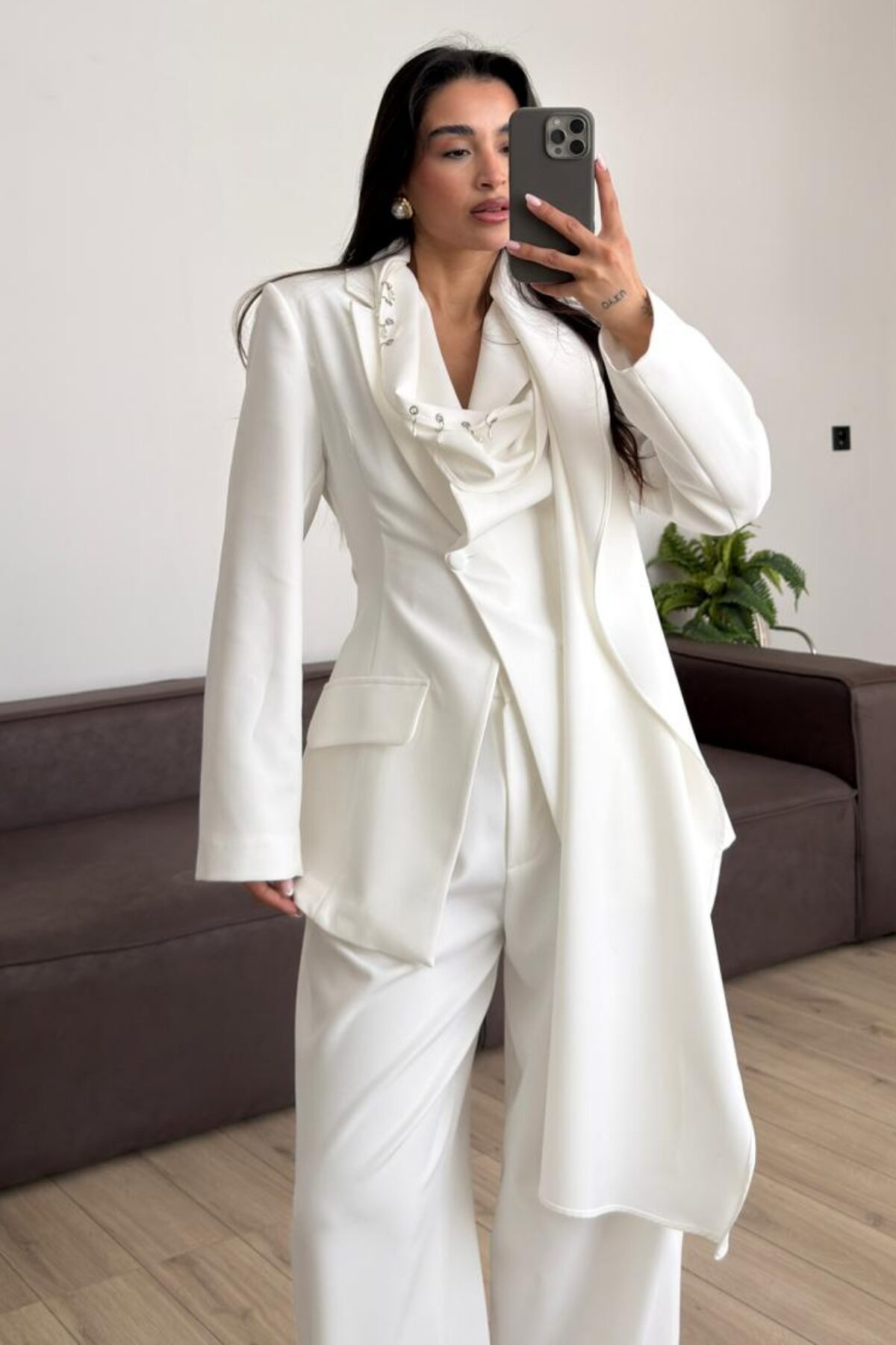 Aksesuar Şallı Ceket Pantolon Takım Ekru