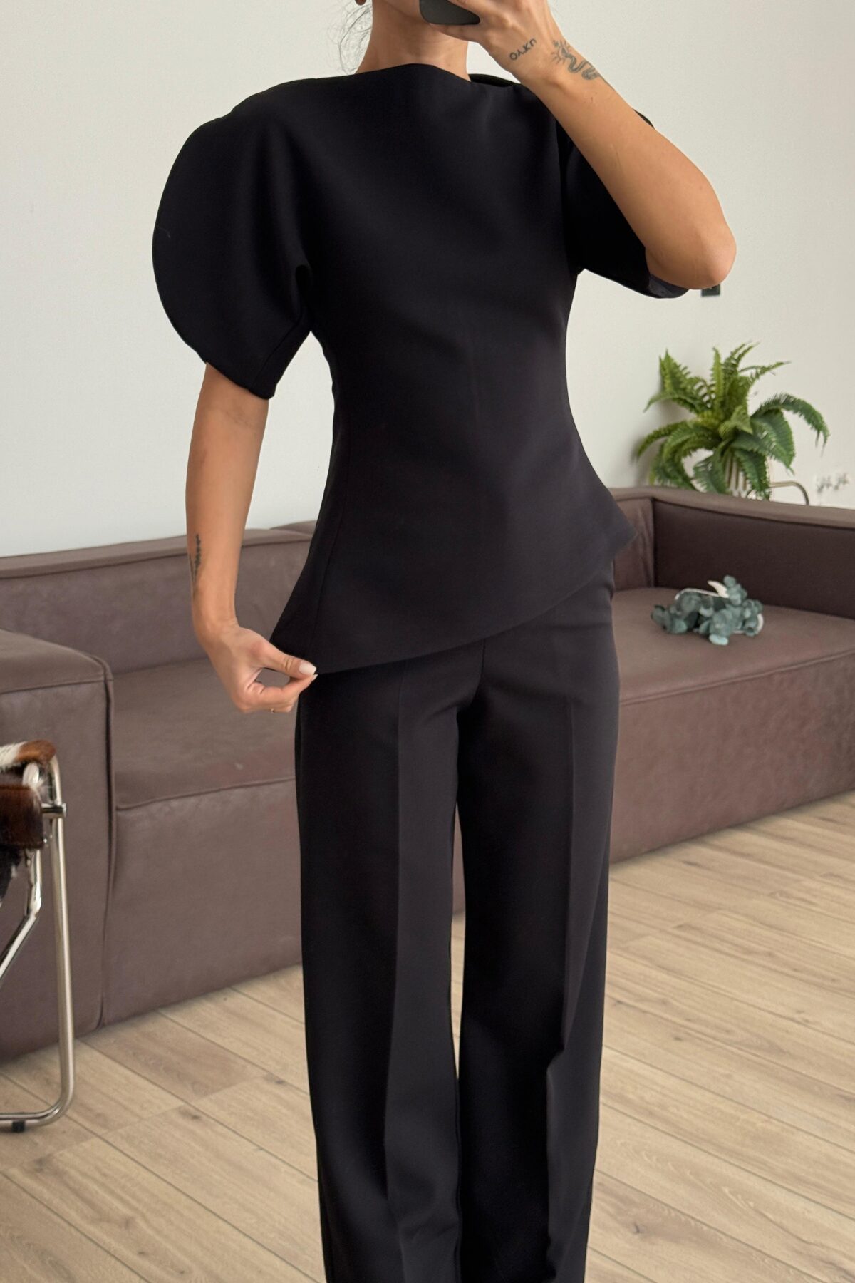 Asimetrik Belden Oturtmalı Pantolon Takım Siyah