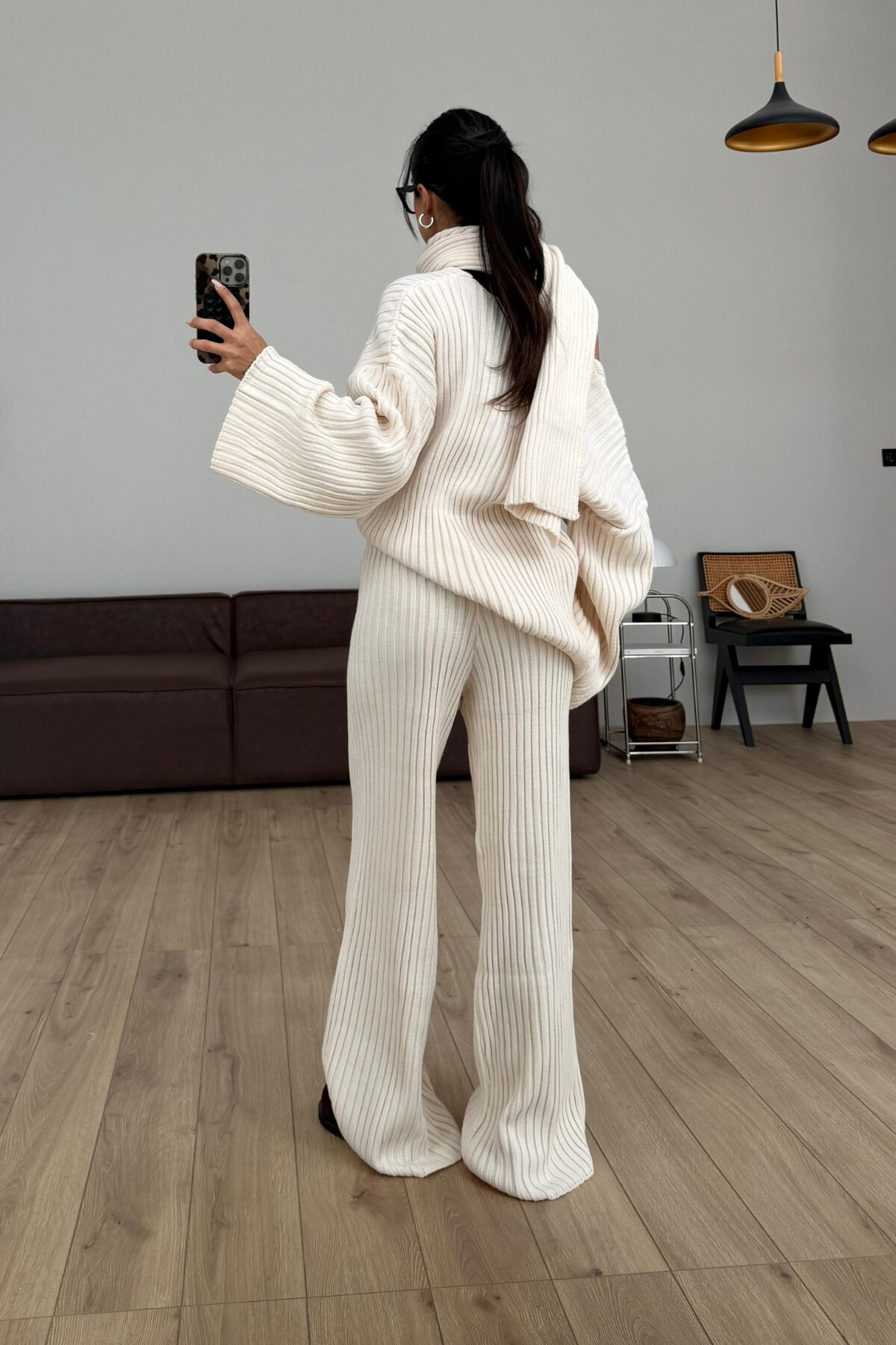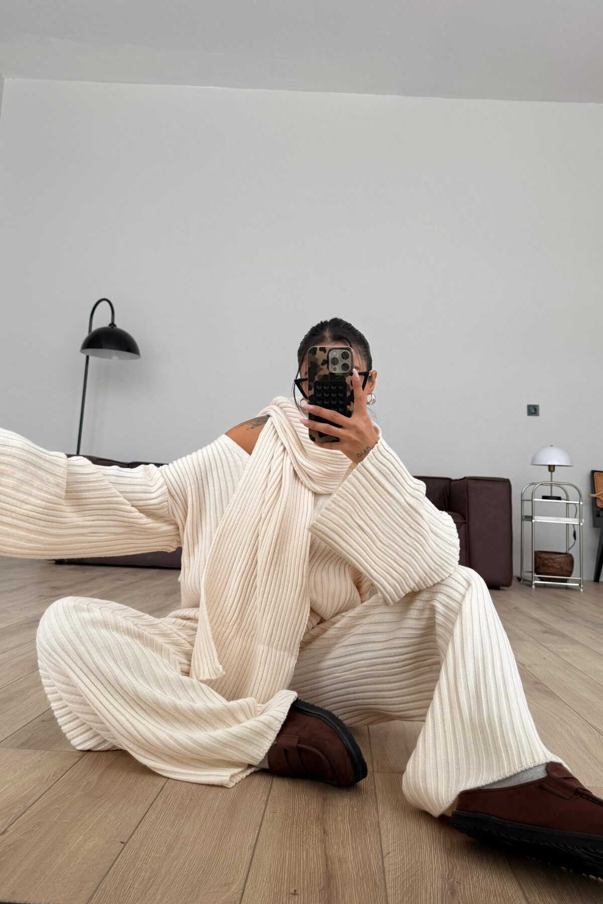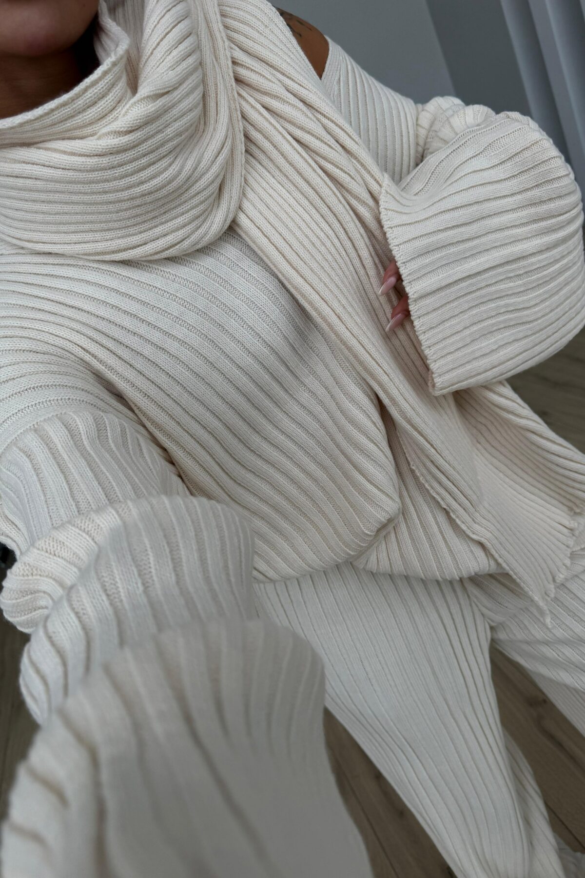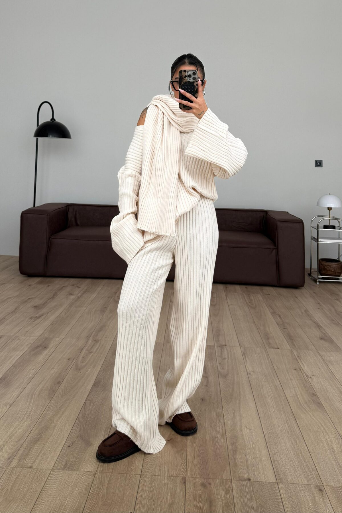Atkılı V Yaka Triko Takım Bej
