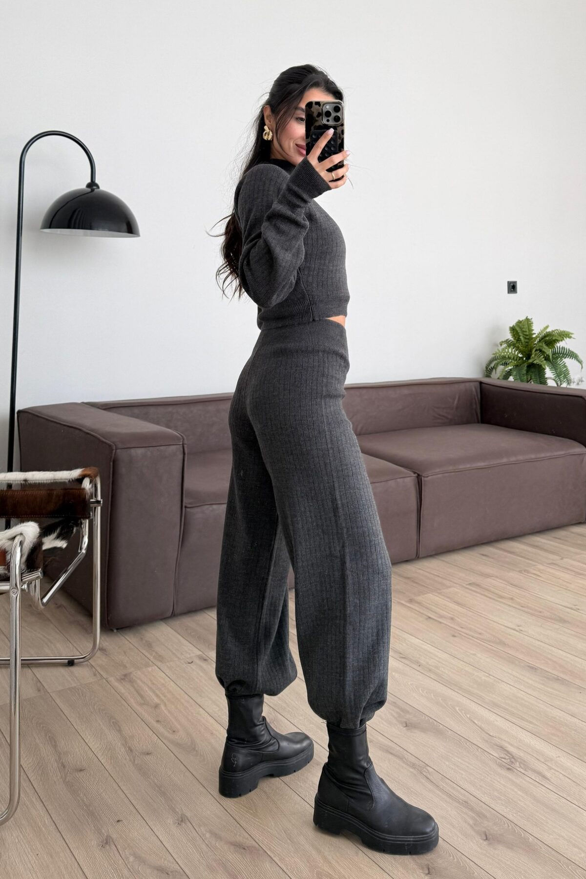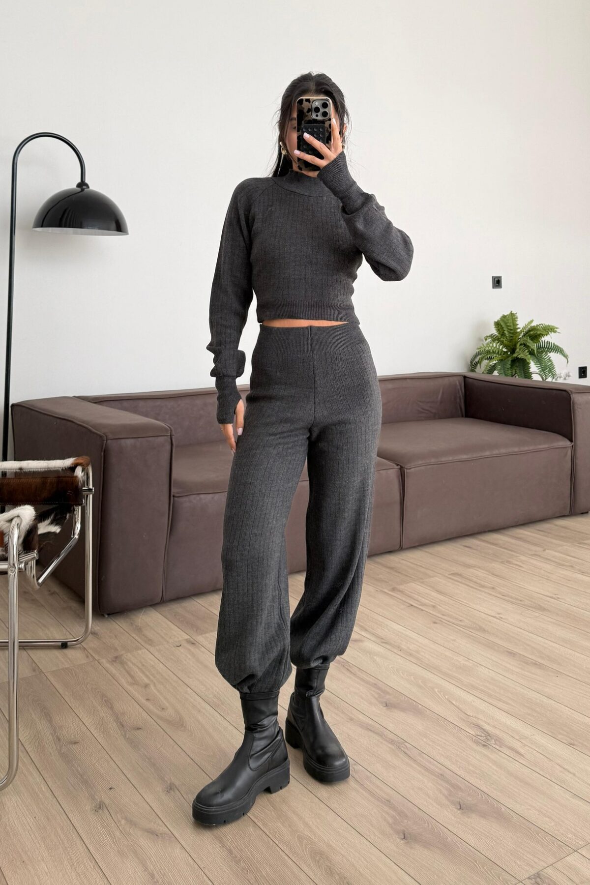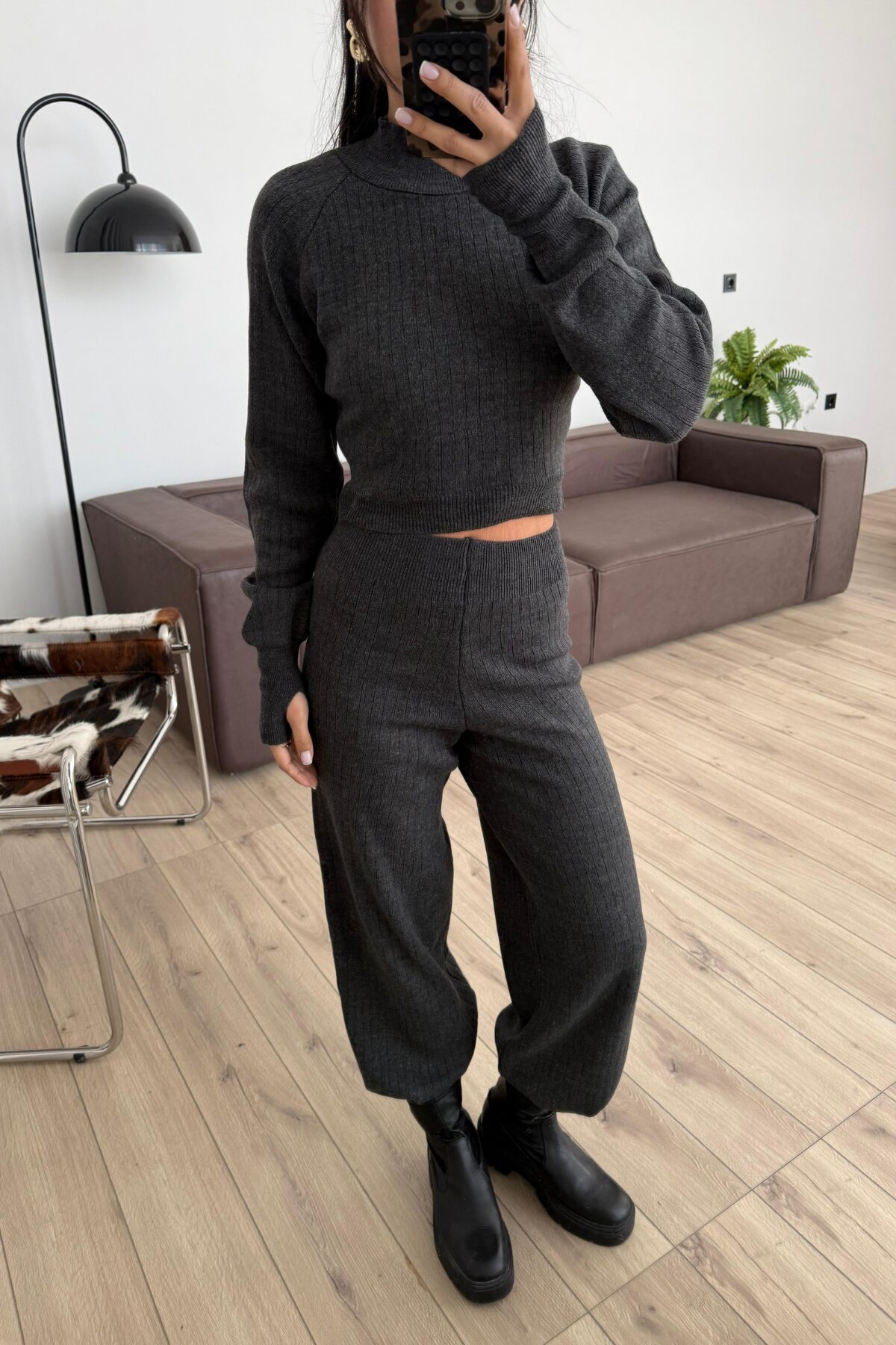 Balıkçı Yaka Triko Crop Takım Antrasit