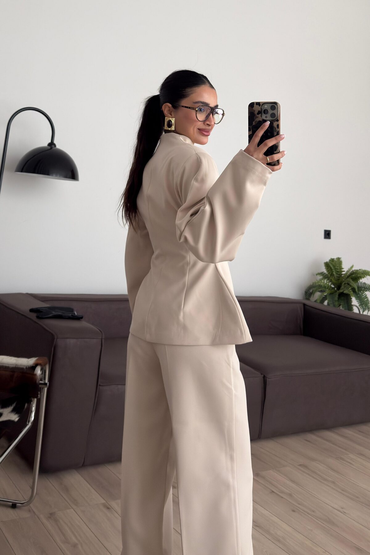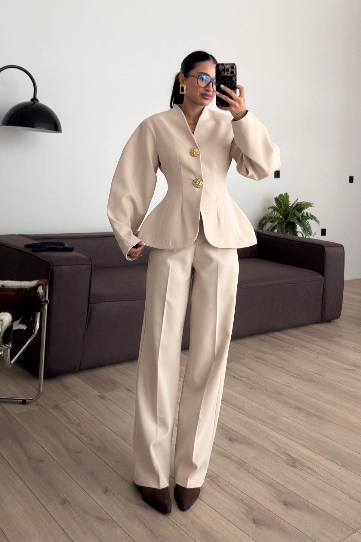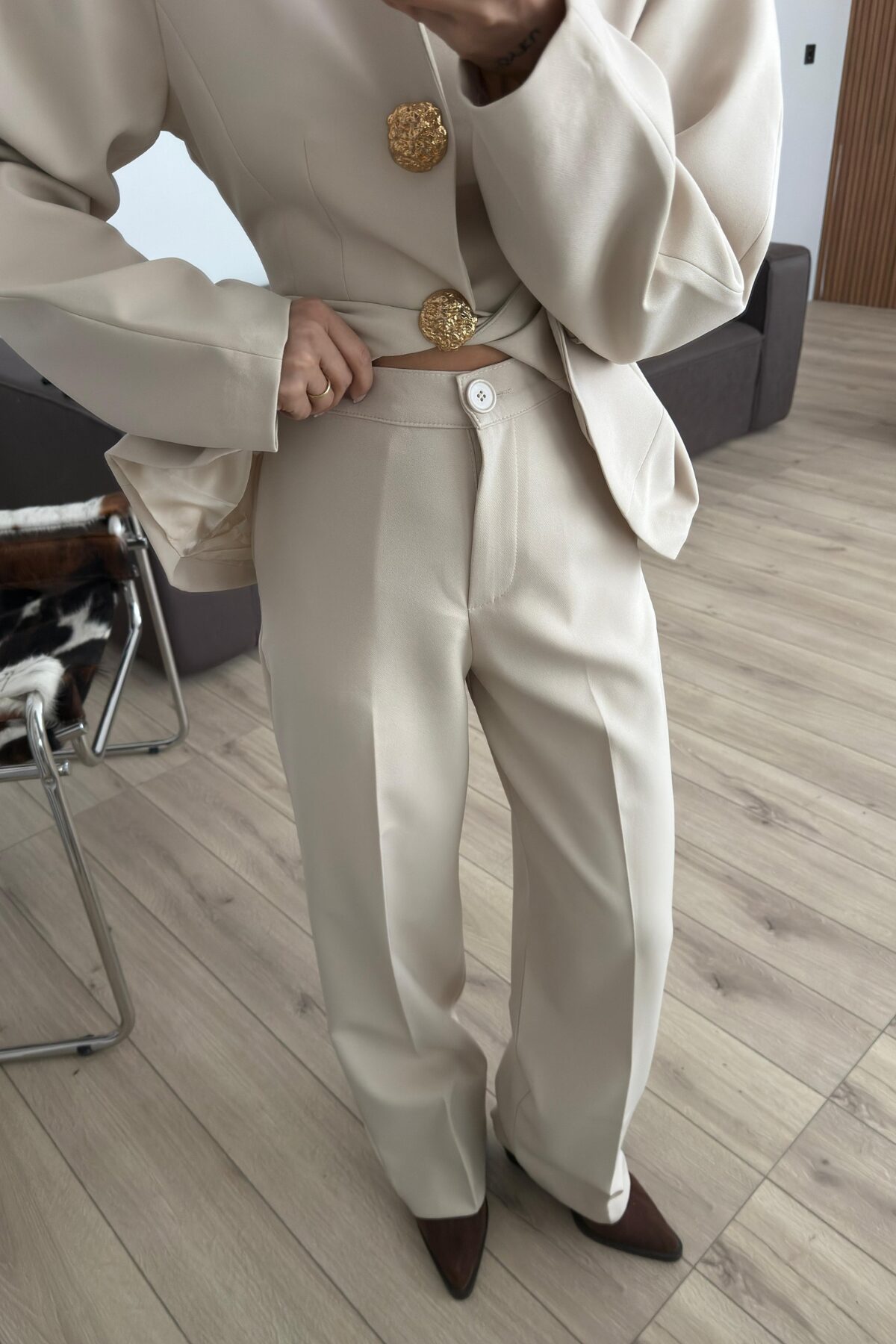 Balon Kollu Gold Düğmeli Blazer Takım Bej