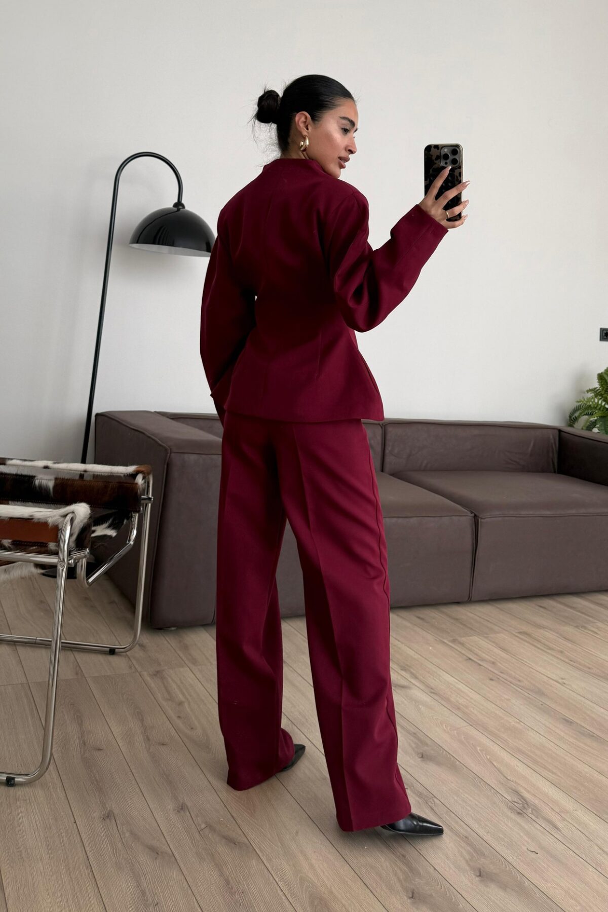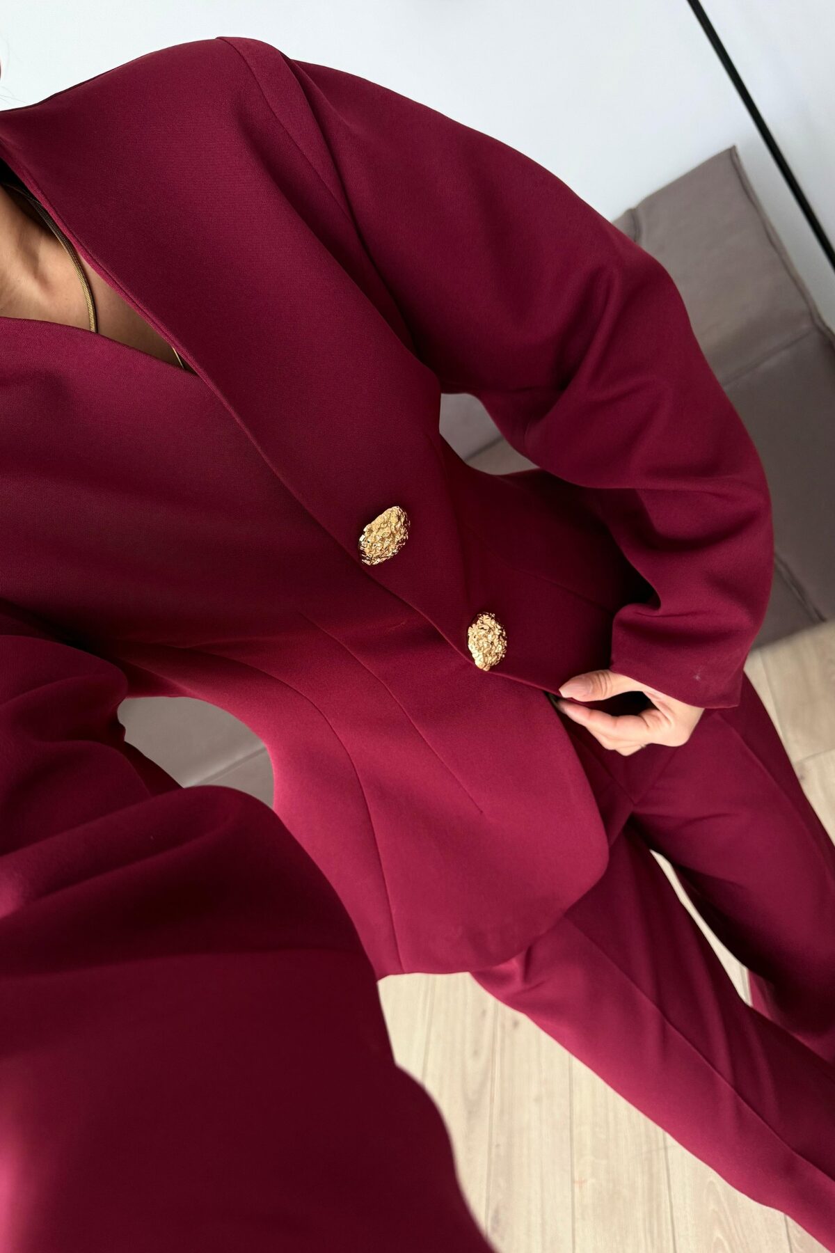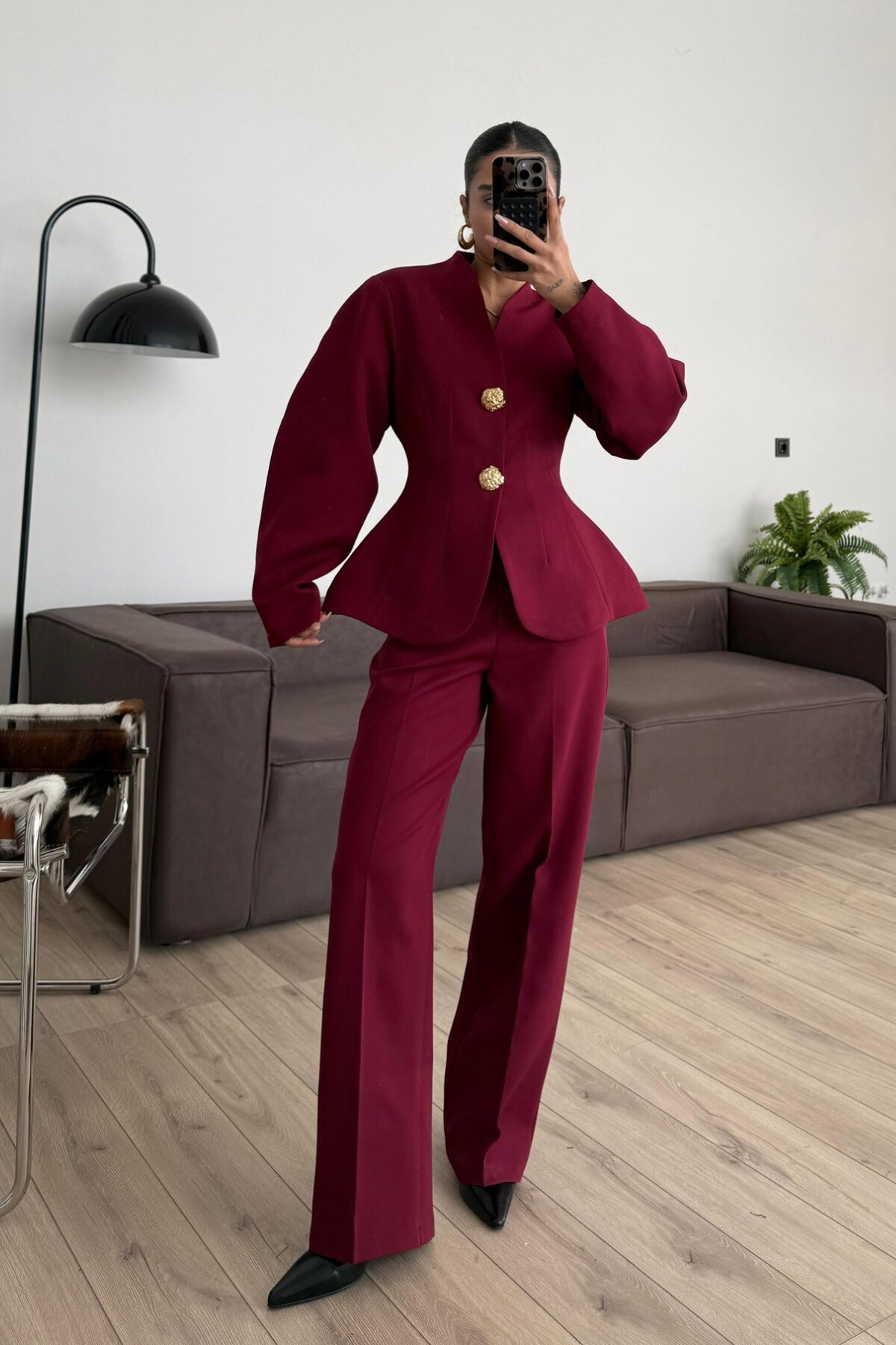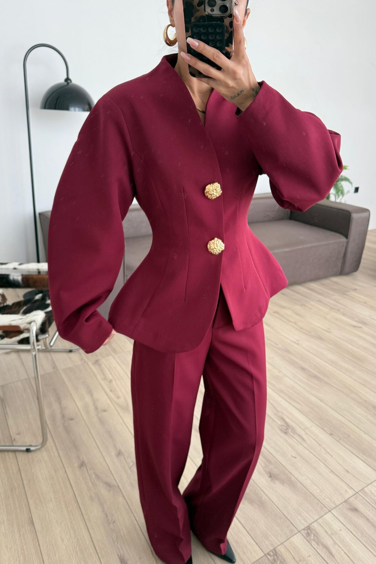 Balon Kollu Gold Düğmeli Blazer Takım Bordo