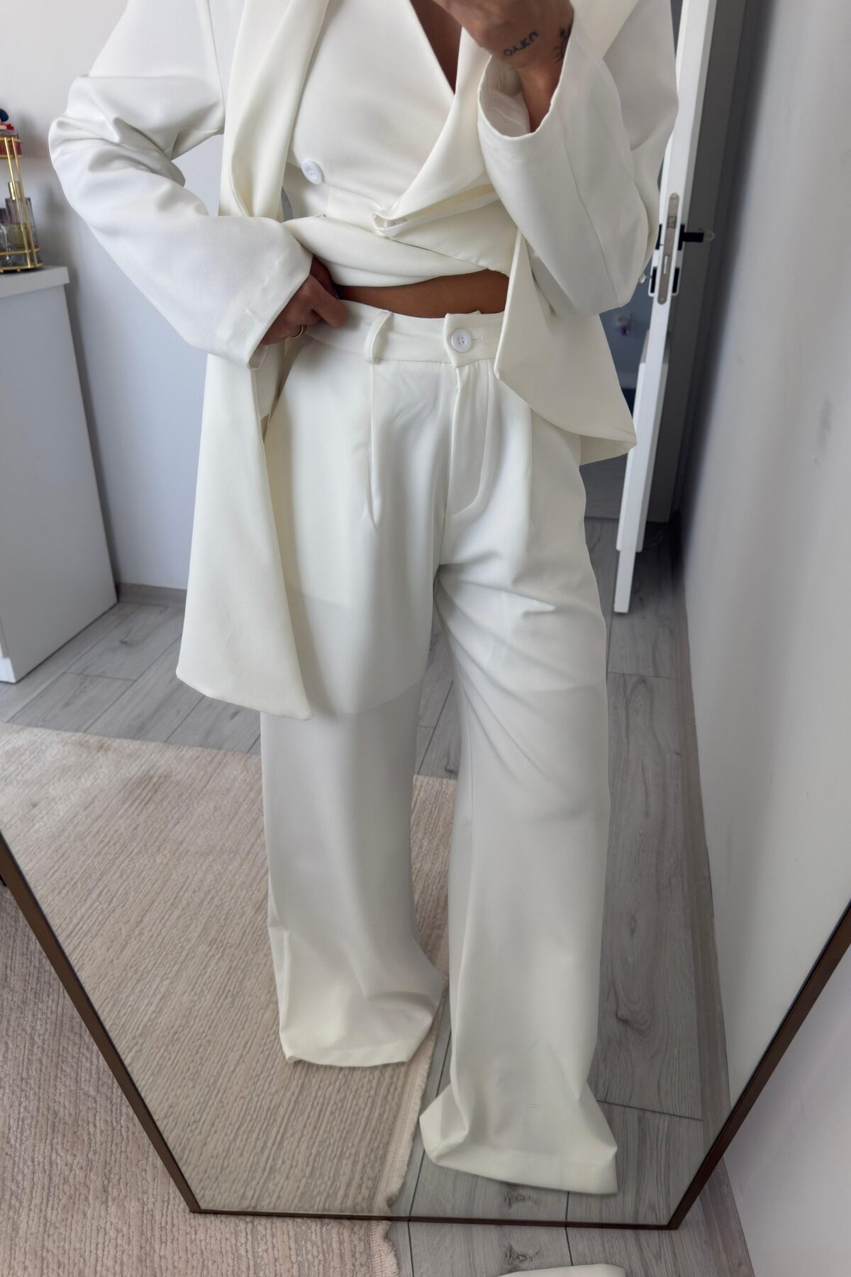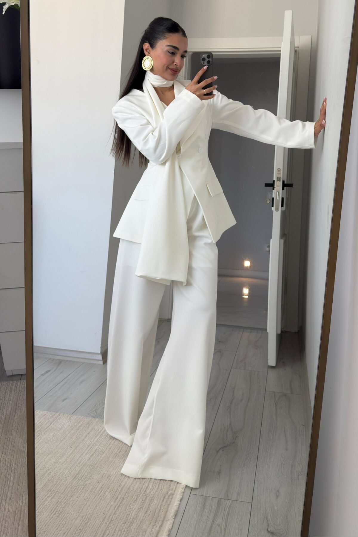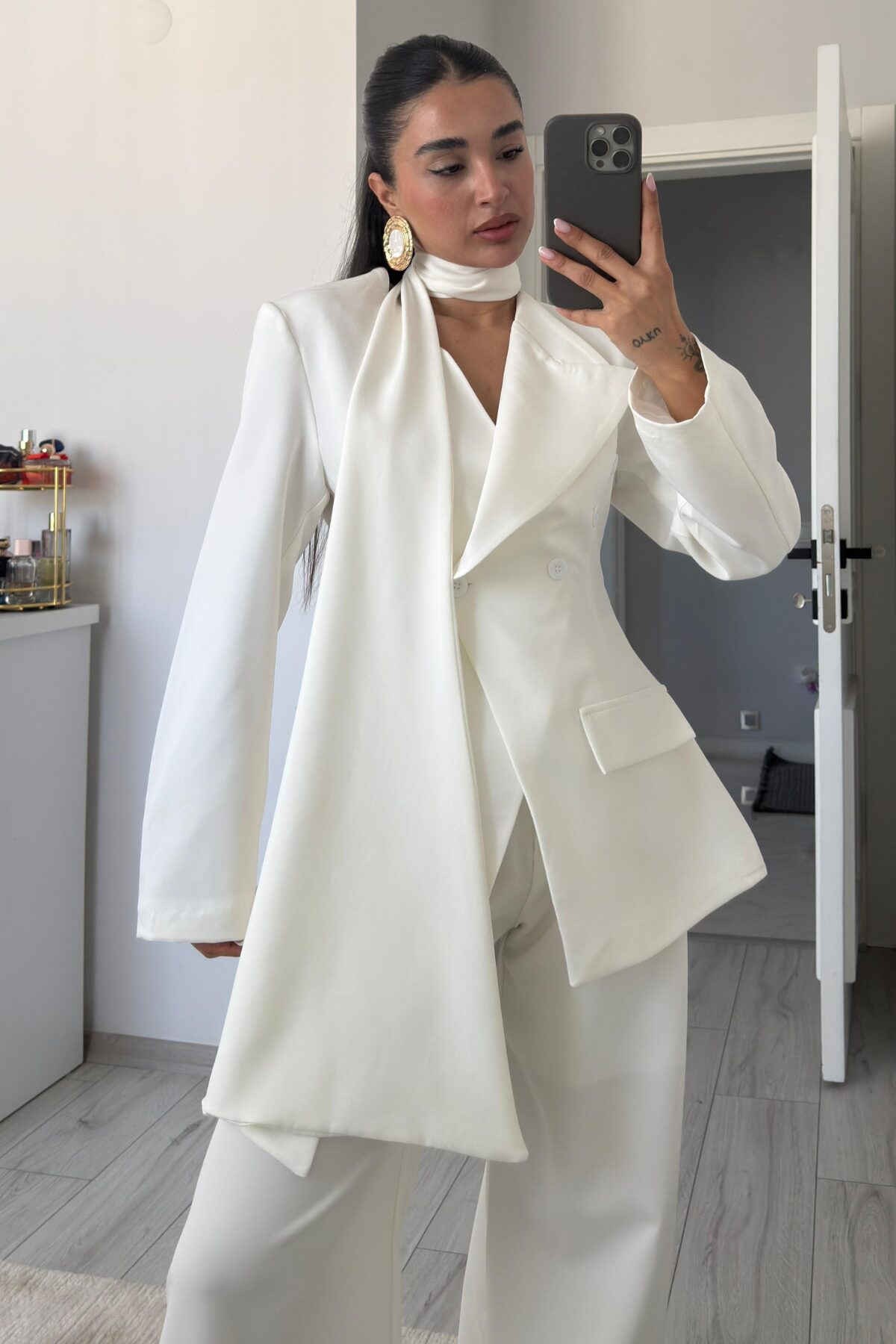 Belden Oturtmalı Fularlı Blazer Takım Ekru