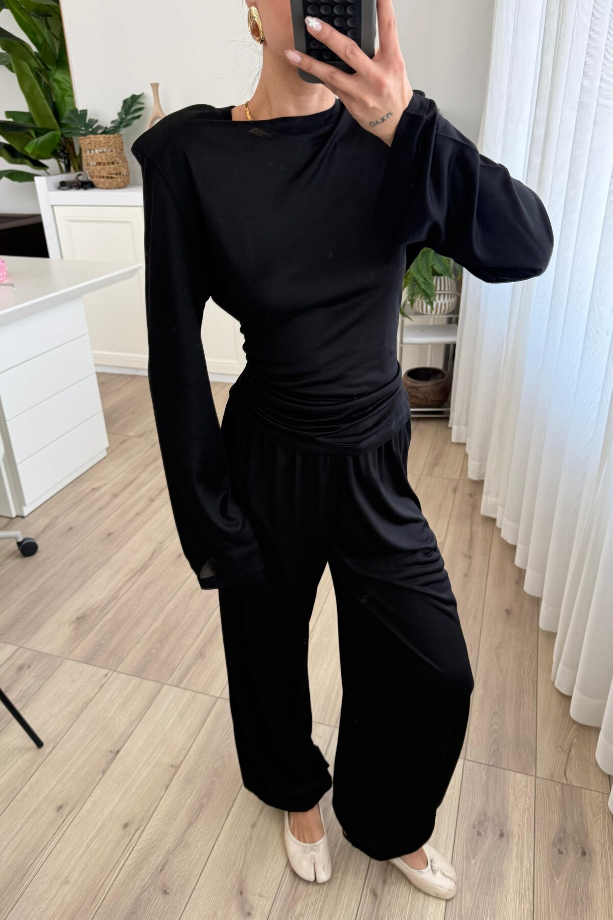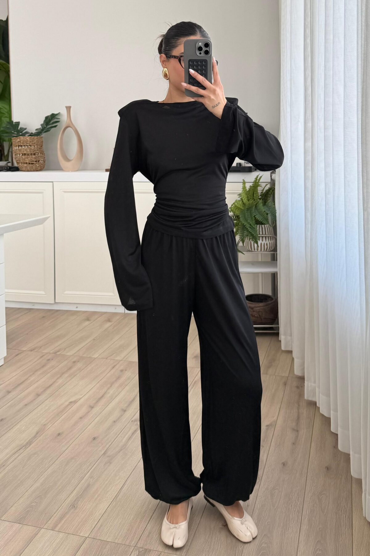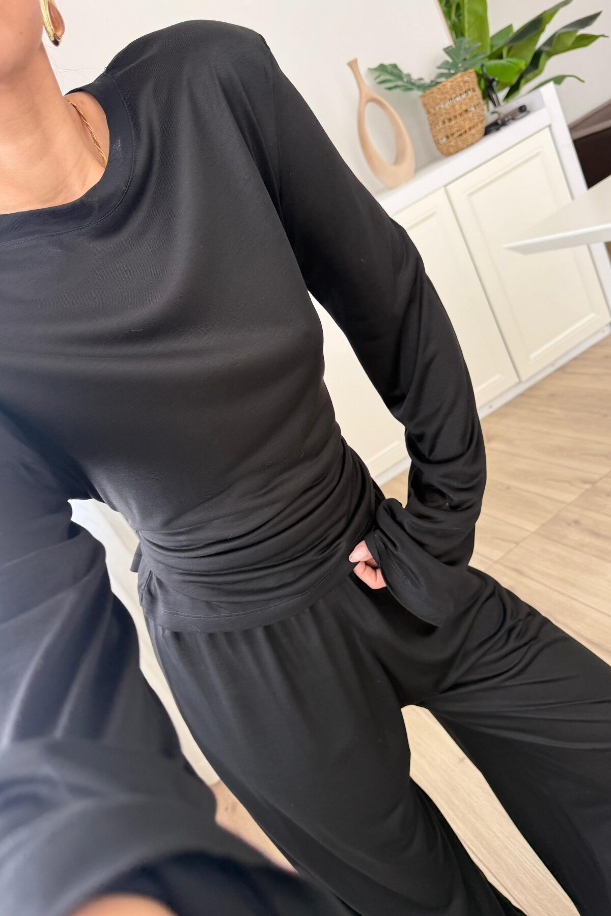 Beli Ayarlanabilir Uzun Kollu Bluz Eşofman Takım Siyah