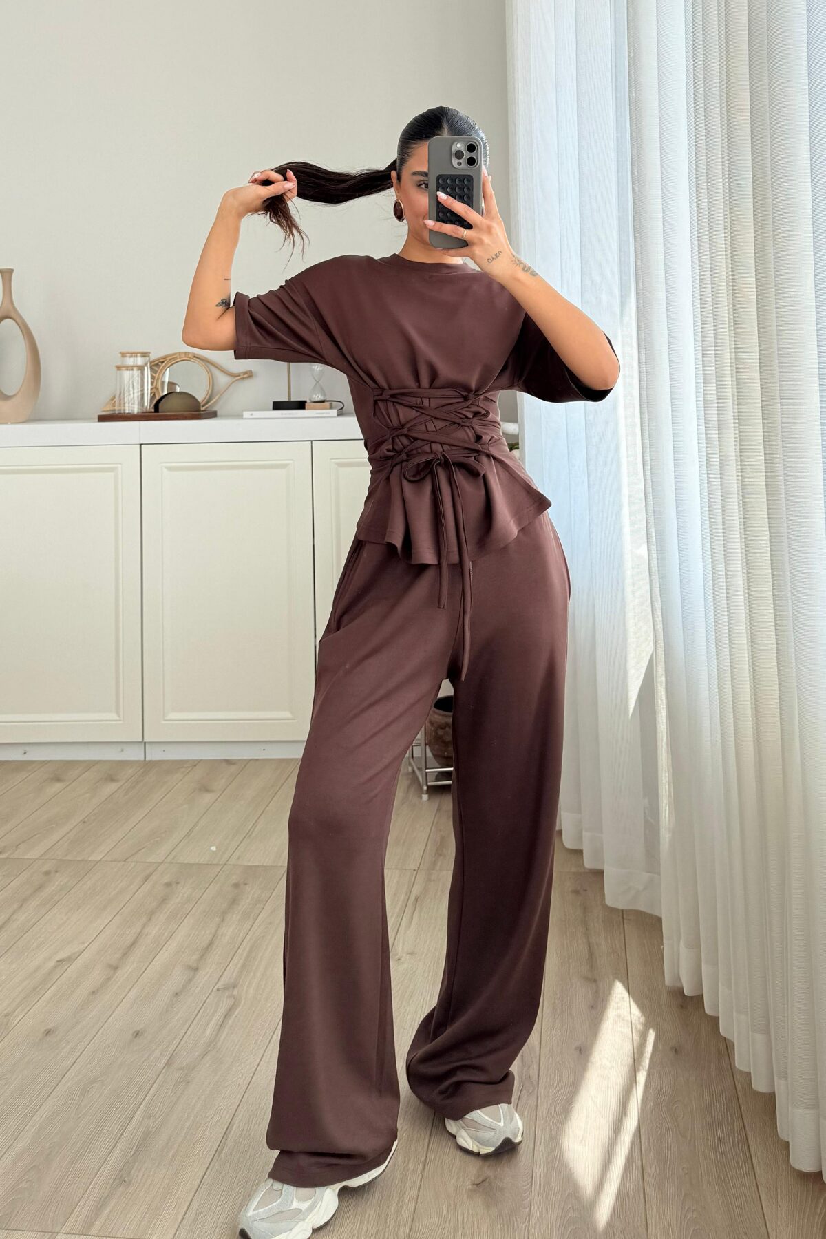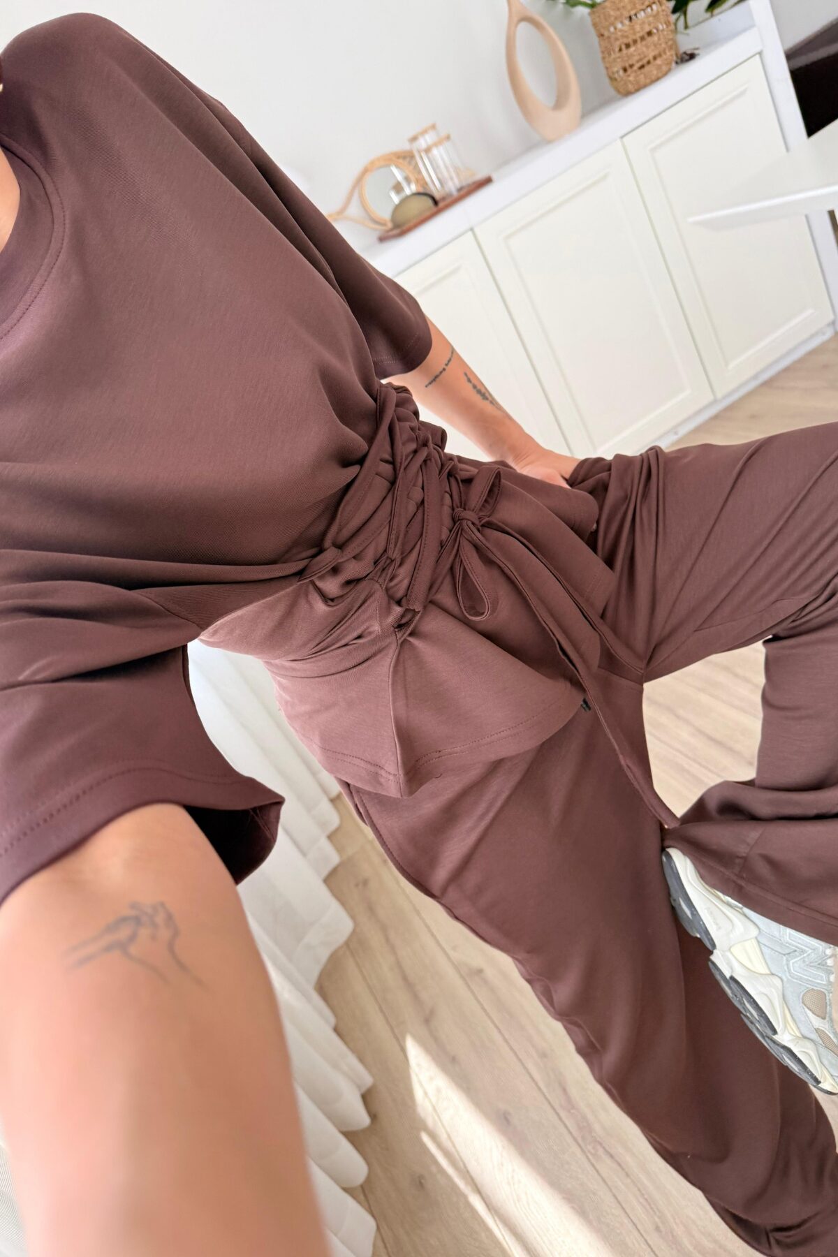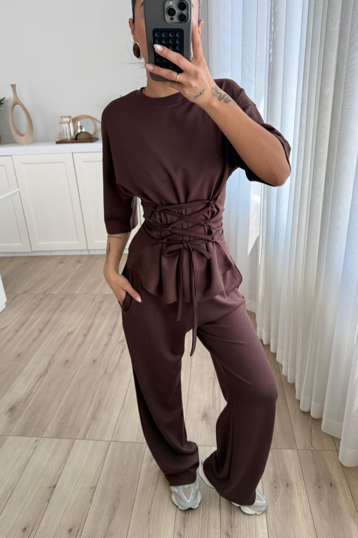 Beli Çapraz Bağlamalı Tişört Pantolon Takım Kahverengi