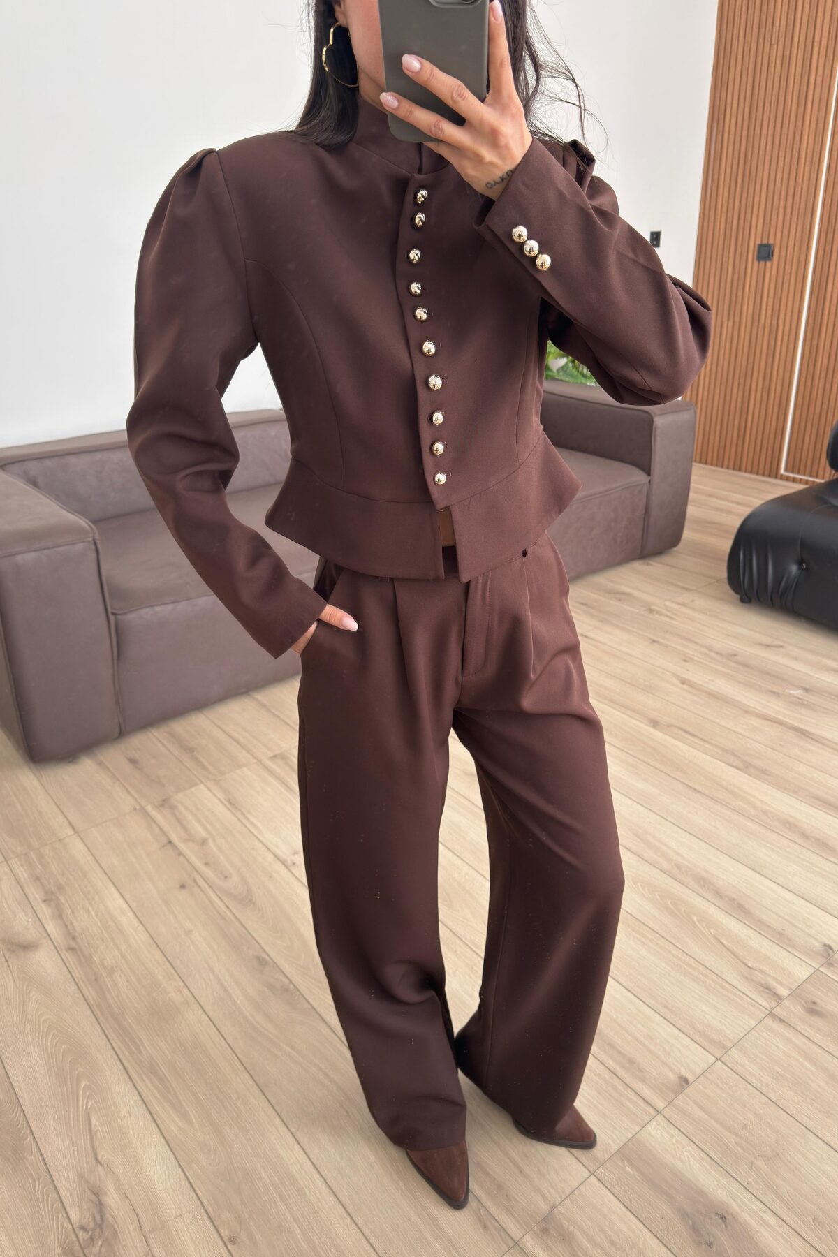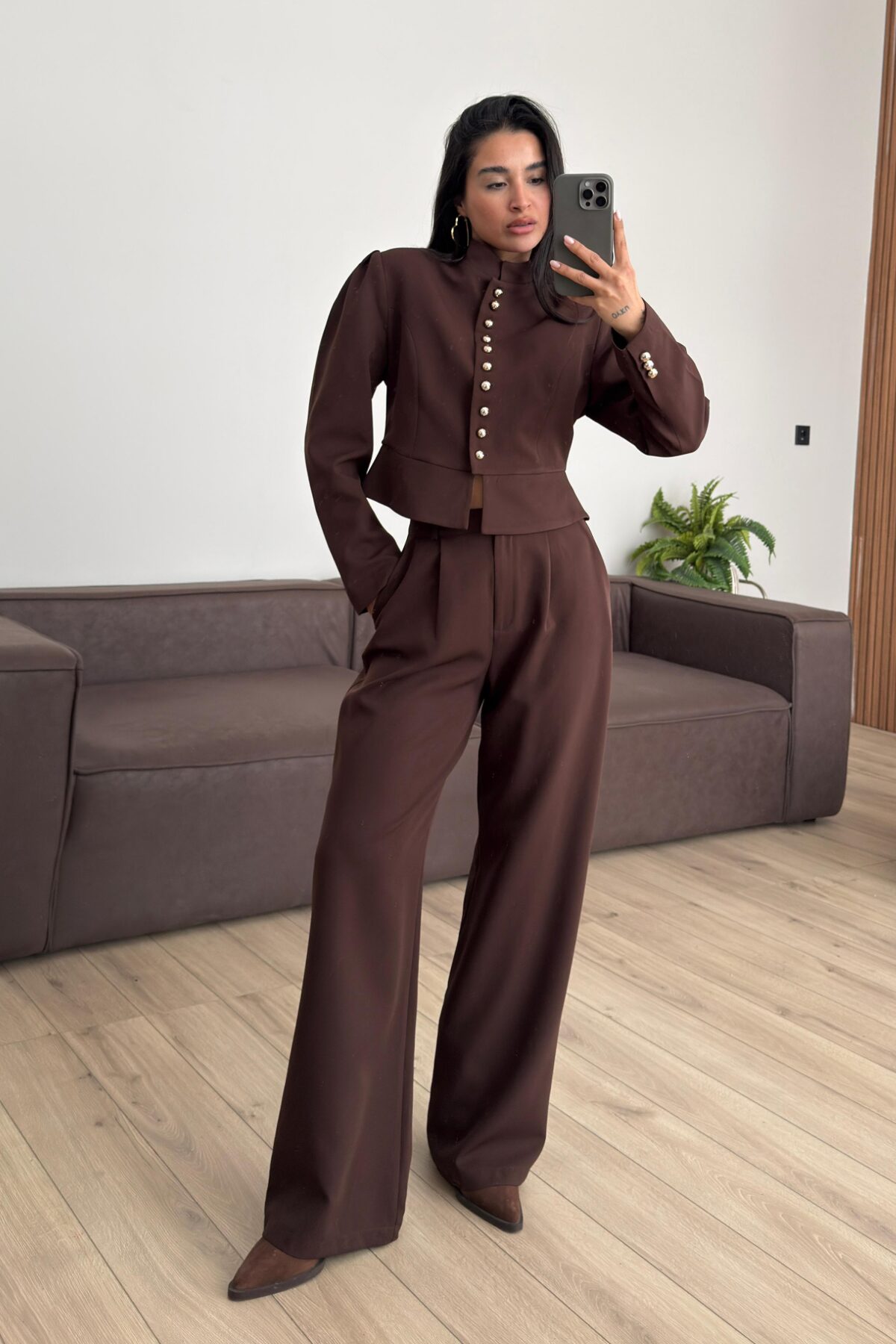 “Çok düğmeli Belden Oturtmalı Takım Kahverengi” için yorum yapan ilk kişi siz olun