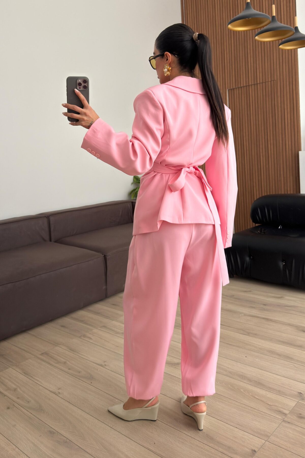 Drapeli Beli Bağlamalı Şalvar Takım Pembe