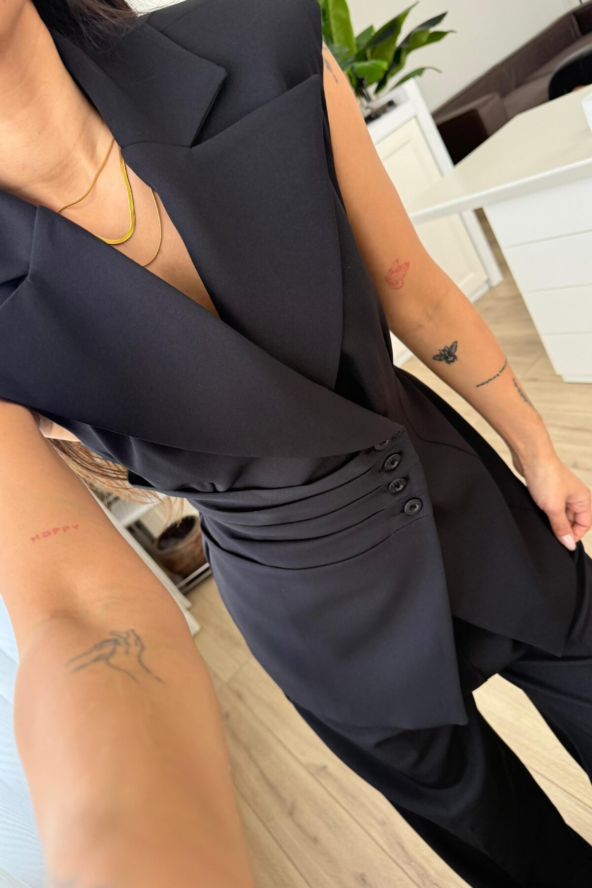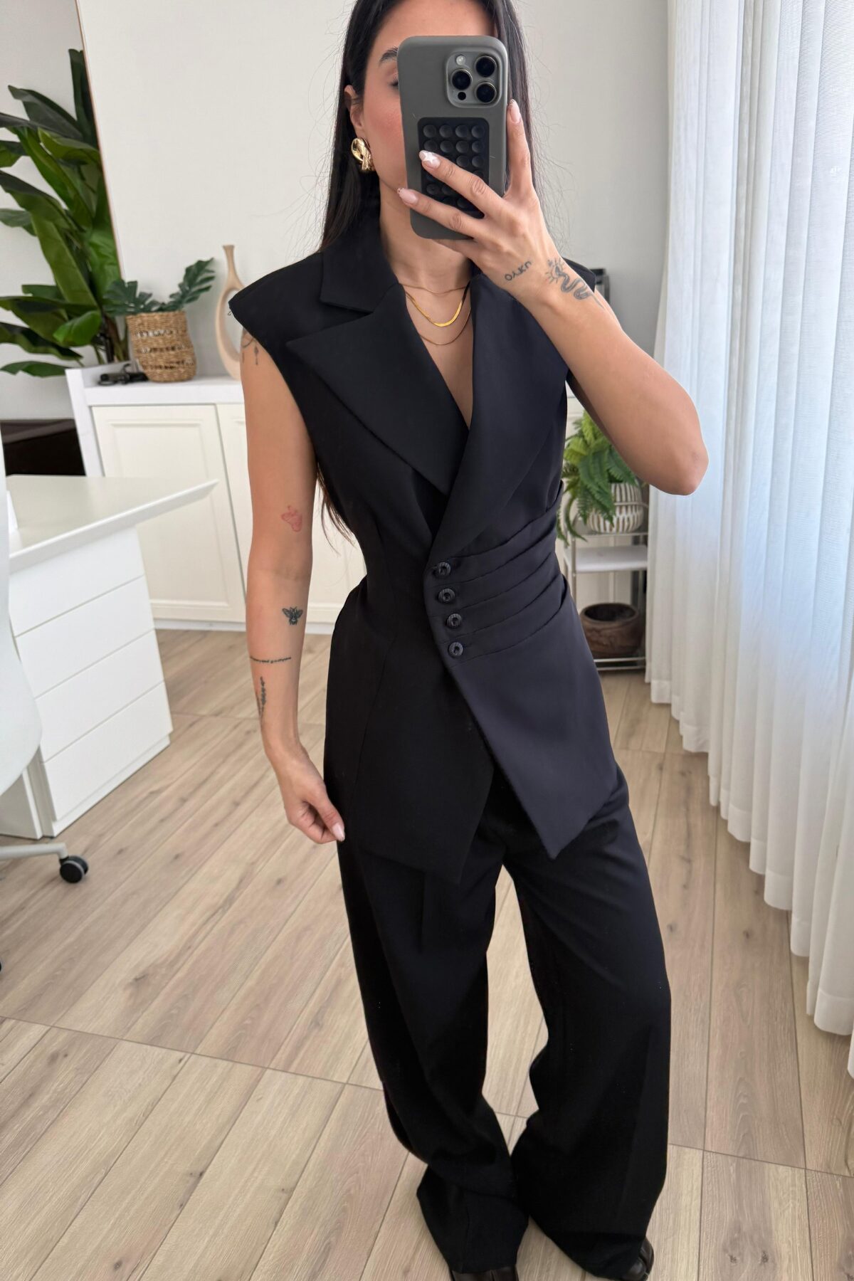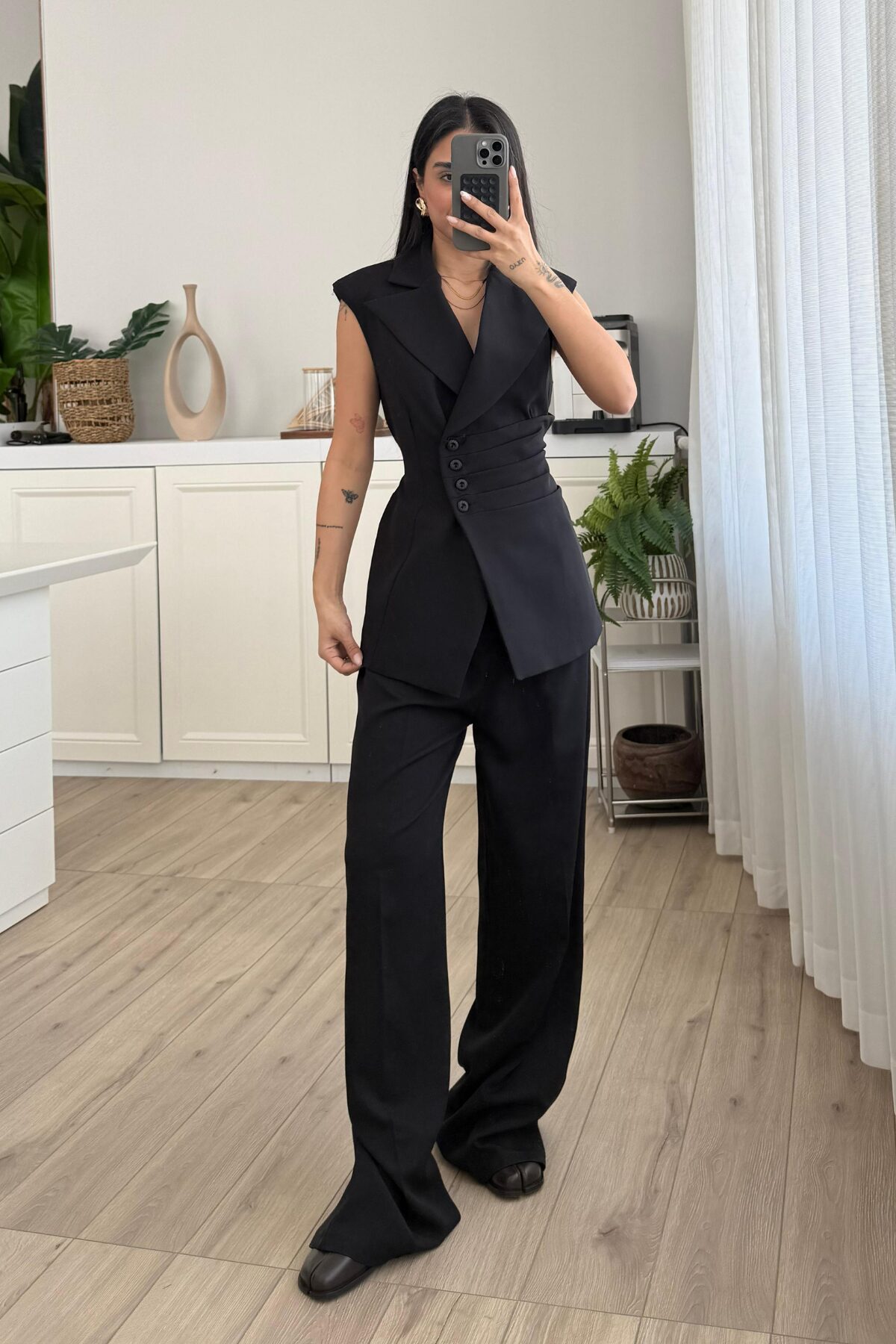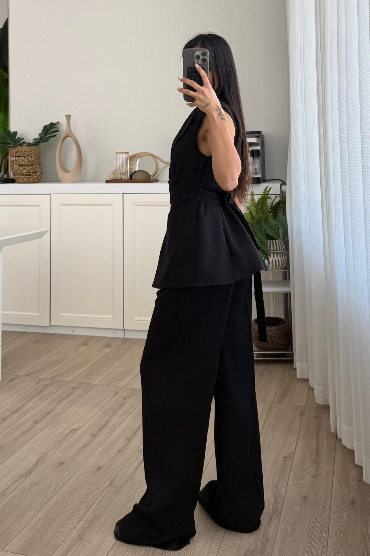 Drapeli Beli Bağlamalı Yelek Takım Siyah