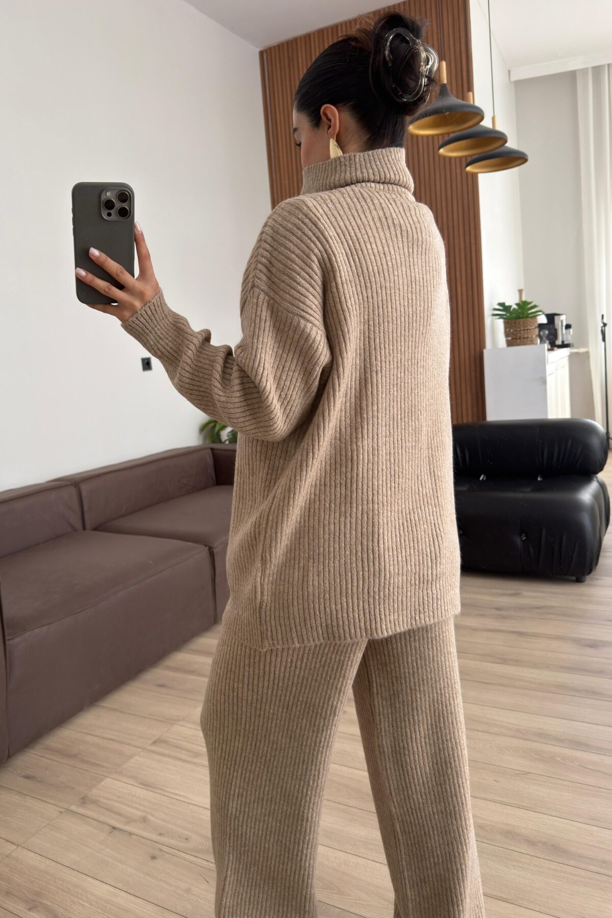 Düğmeli Dik Yaka Triko Takım Koyu Bej