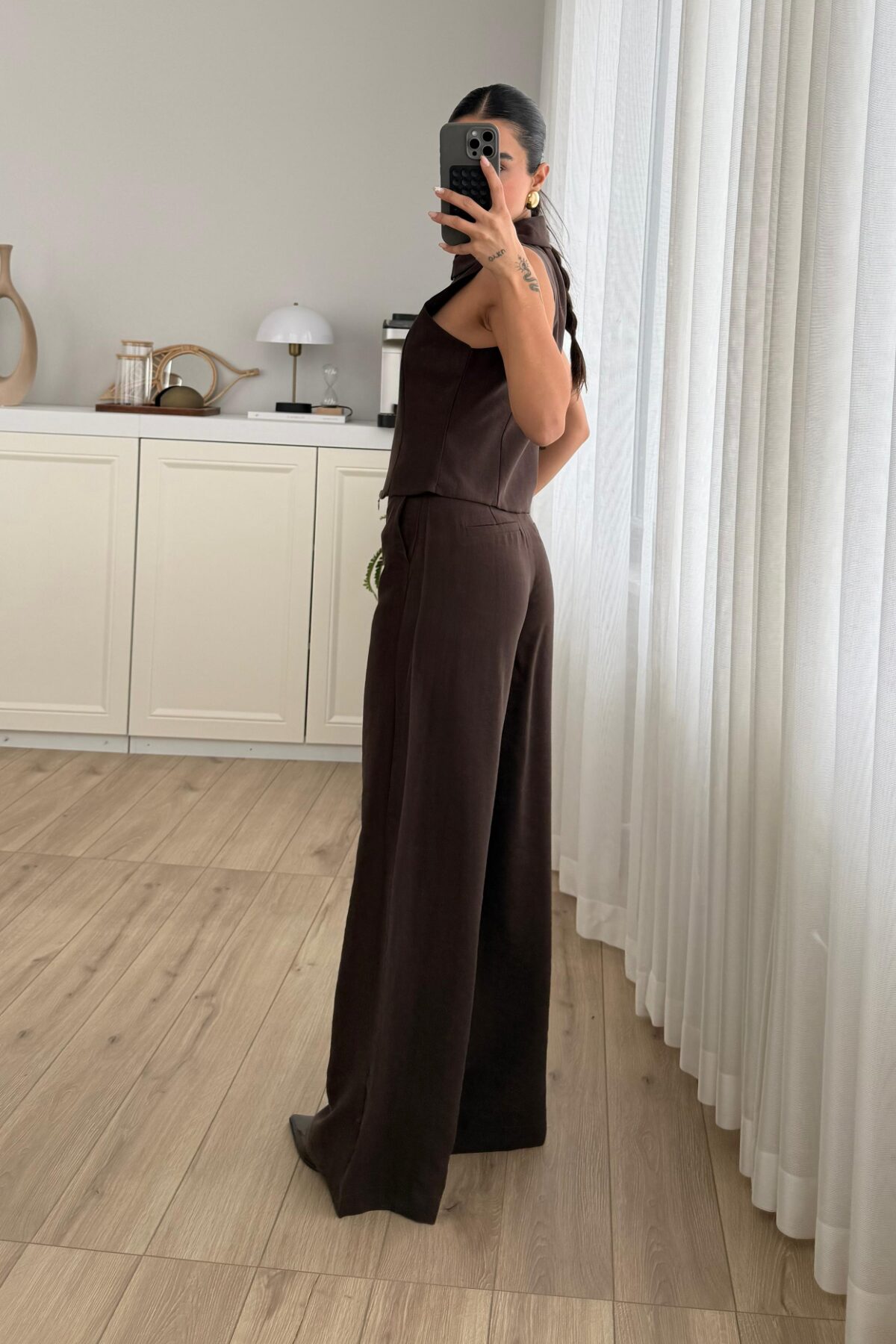 Fermuarlı Yelek Pantolon Takım Kahverengi