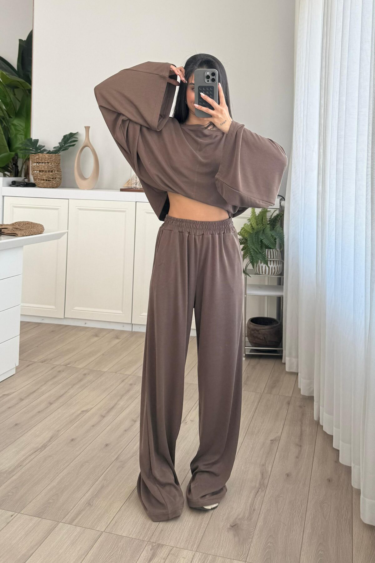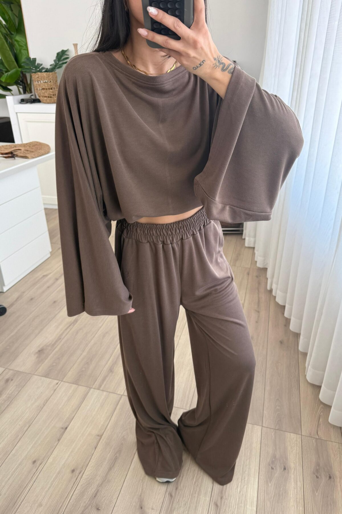 Geniş Kol Bluz Pantolon Takım Kahverengi
