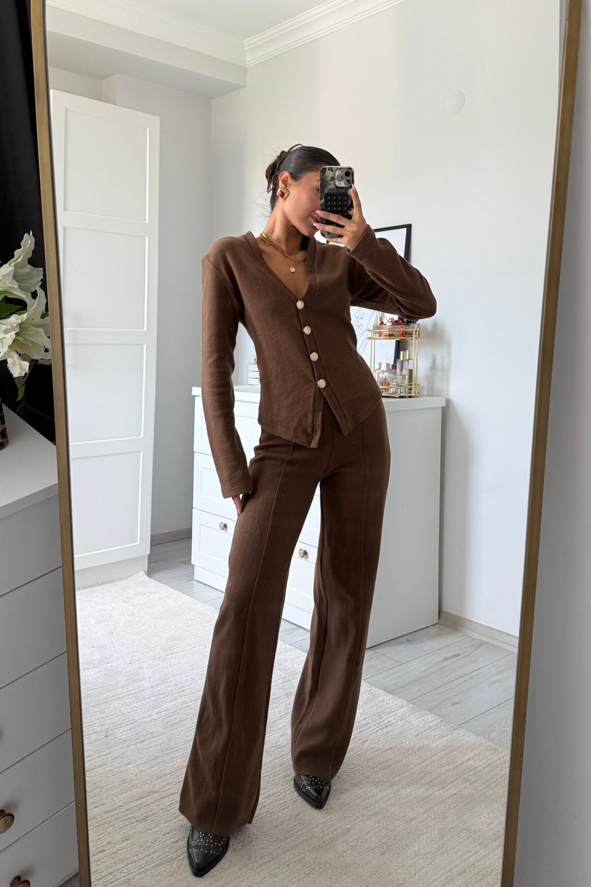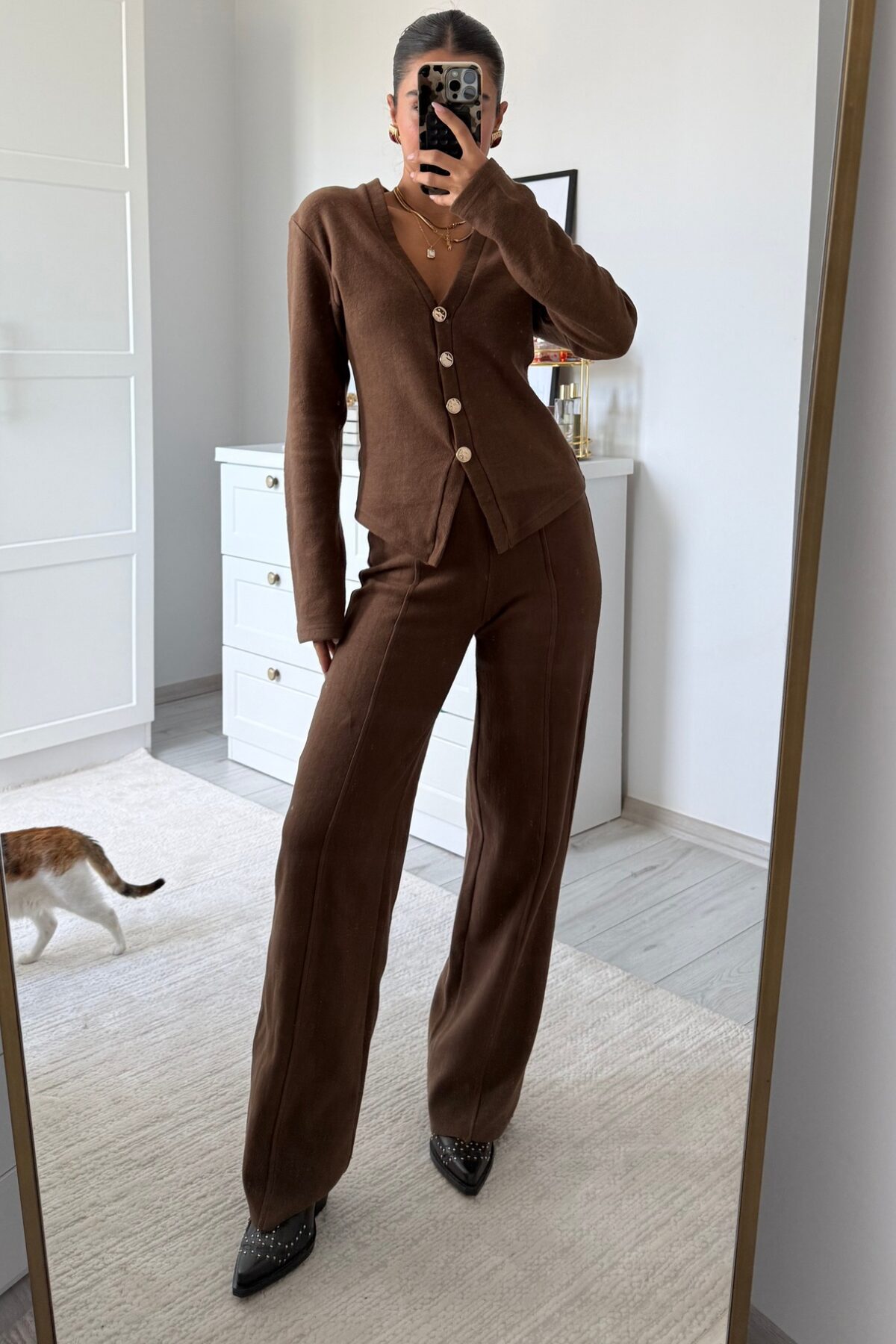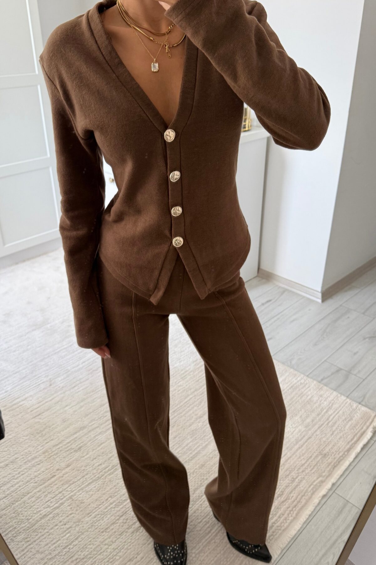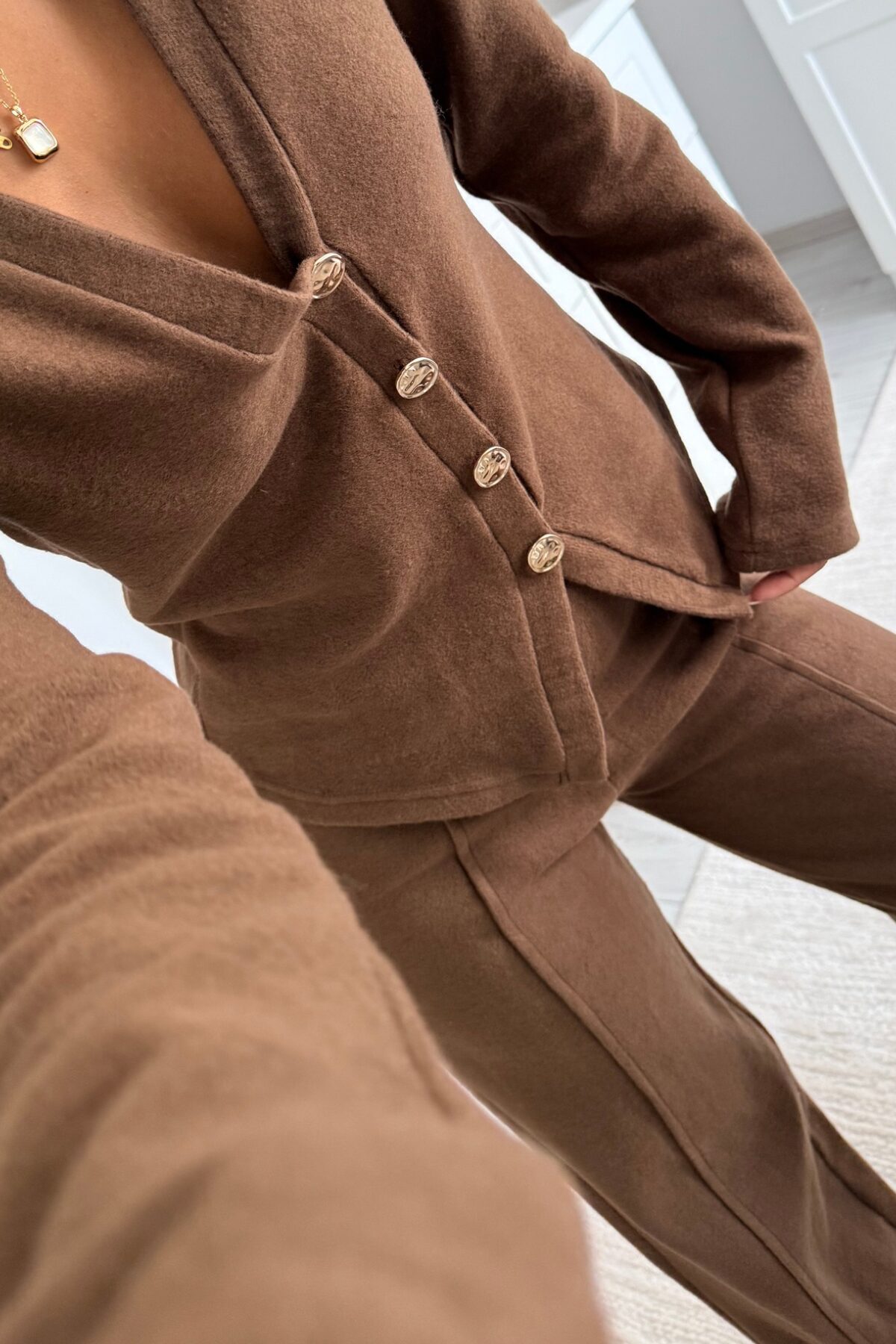 Gold Düğmeli Triko Takım Kahve